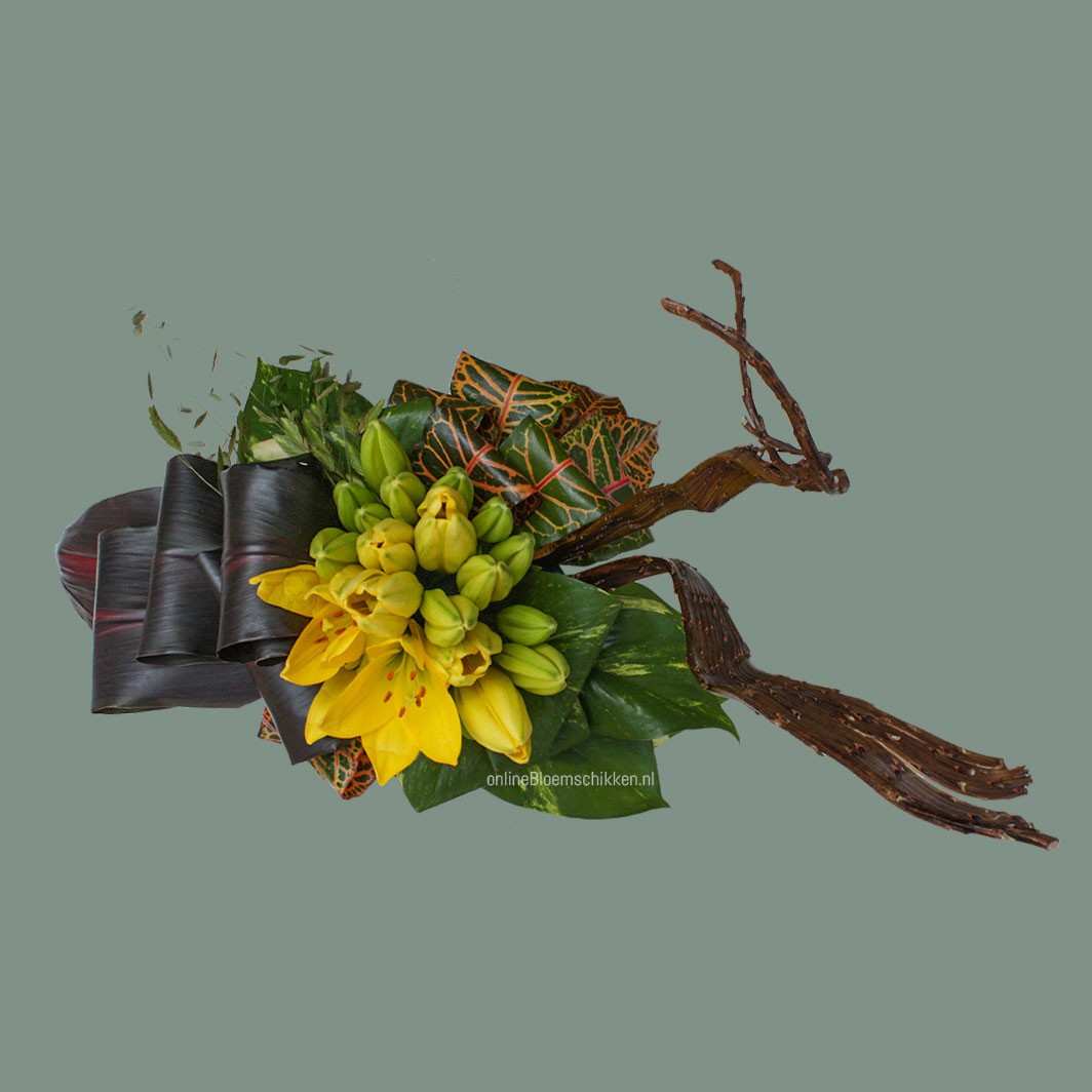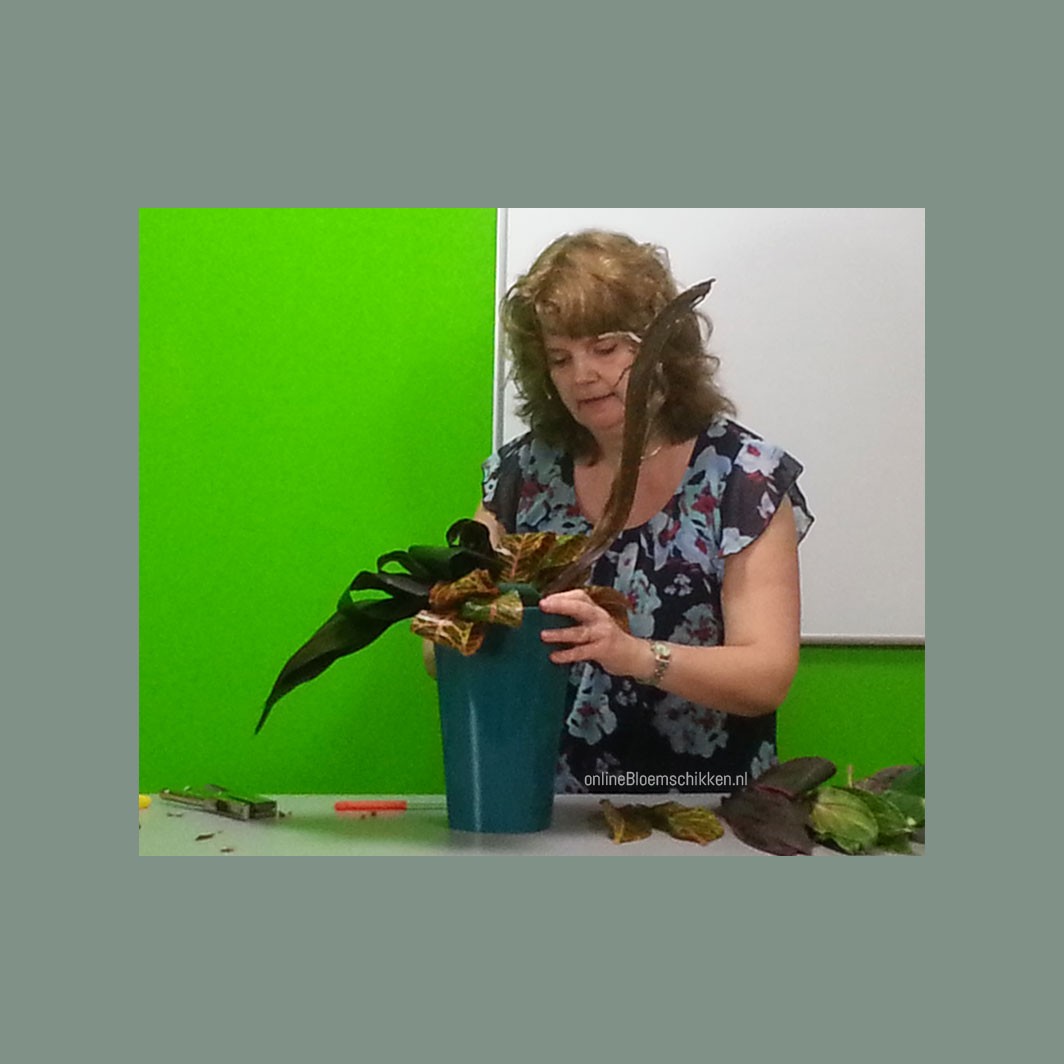 Alle blad materialen die in de schikking zijn gebruikt zien we in Nederland meestal als kamerplanten, maar bij de groothandel zijn ze ook als snijgroen te verkrijgen.