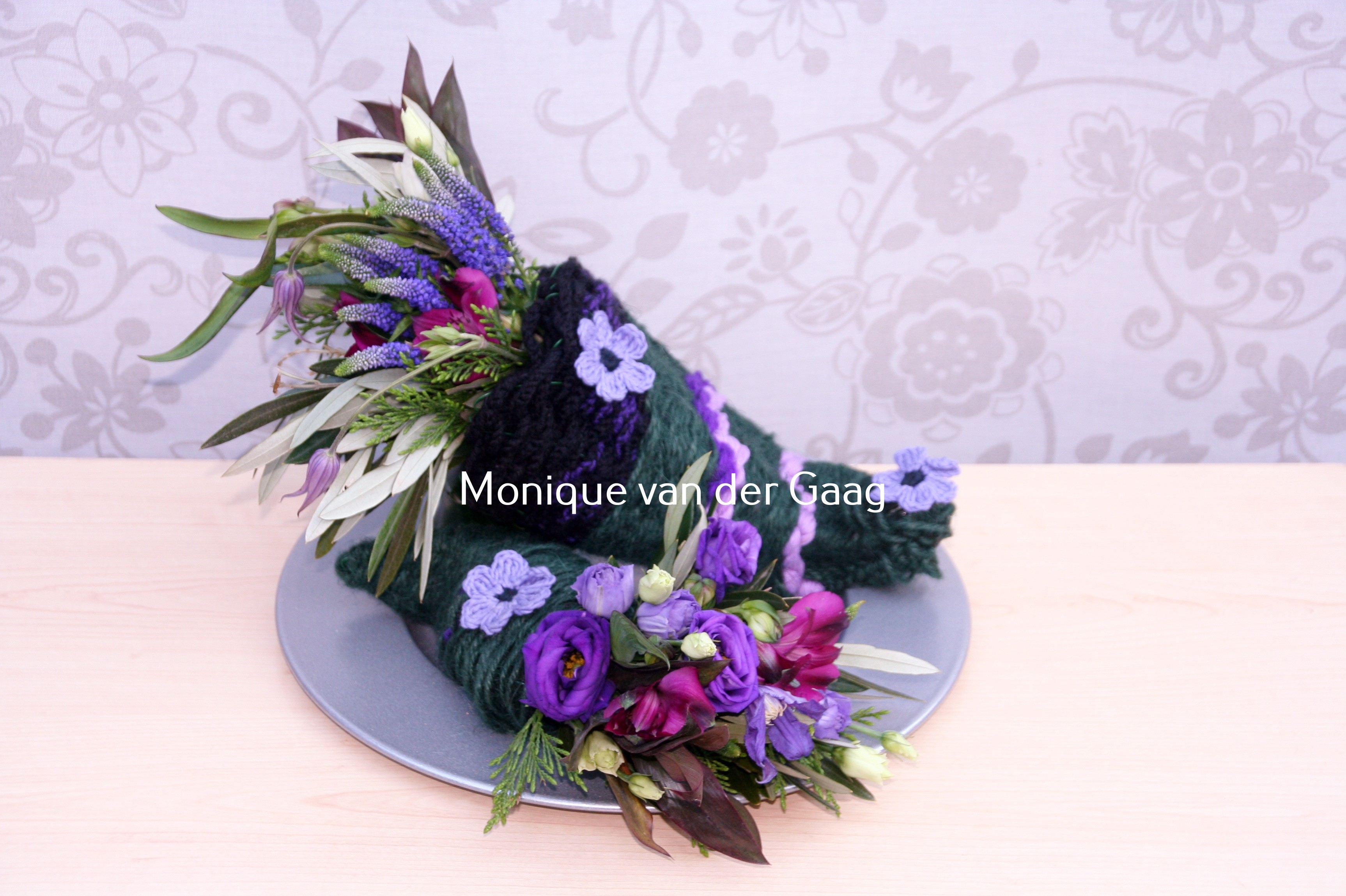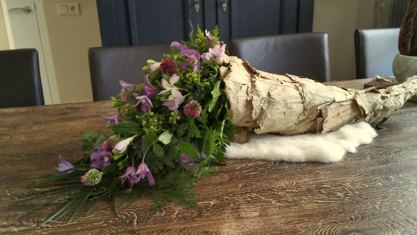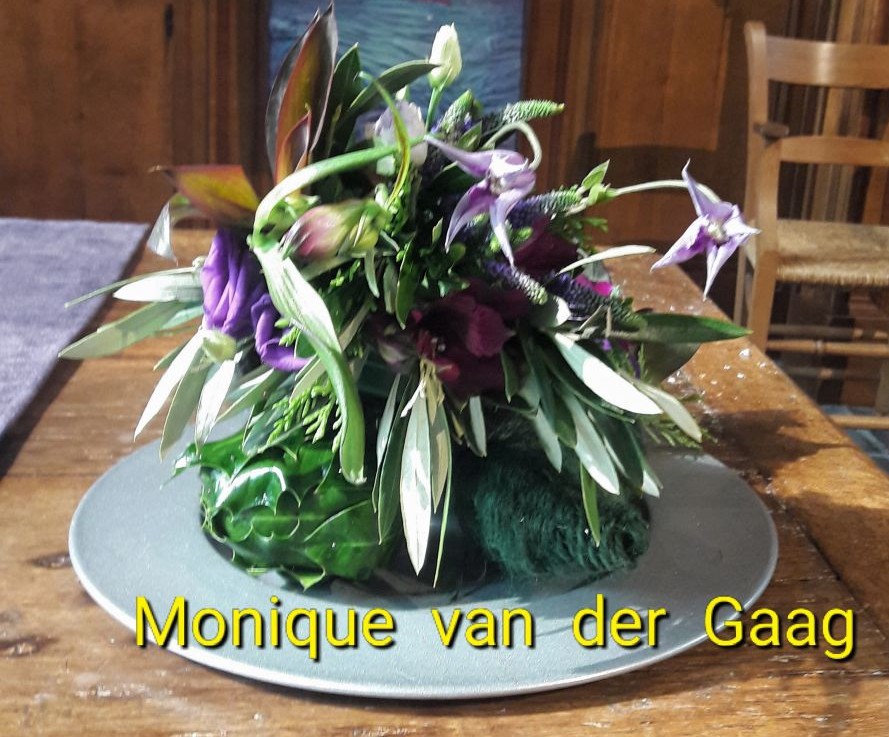 En deze schikking maakte ik als liturgische schikking, d.w.z. dat zowel het beeld van de 'hoorn' als de keuze van de kleur en de soort bloemen een symbolische betekenis heeft. Op weg naar Pasen is de liturgische kleur paars (purper) en daar varieer ik op. Het voert te ver om hier alle bloemen liturgisch te bespreken.