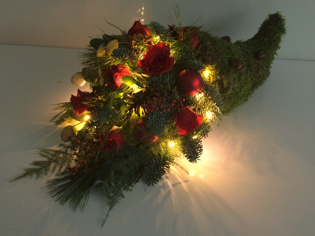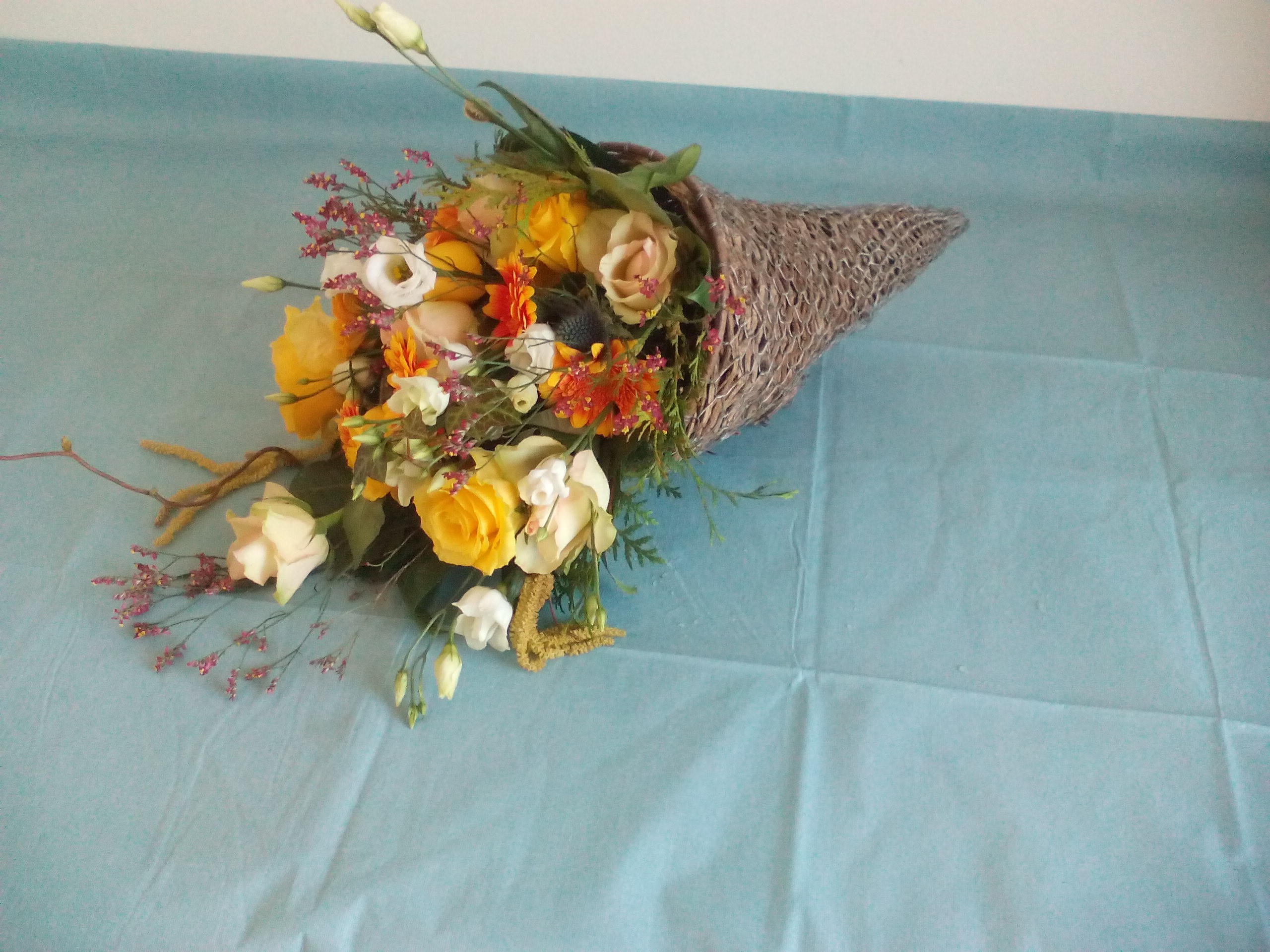 Hoi Nicolle, Mijn Hoorn des Overvloeds. Ik was door omstandigheden wat beperkt in de bloemkeuze, anders had ik voor andere bloemen gekozen, maar het ging mij om de techniek en de hoorn kan ik altijd weer gebruiken. En op zich is hij toch wel leuk geworden. Ik heb een meer dan een week geleden gemaakt en de bloemen zijn nog goed. Groetjes, Rita