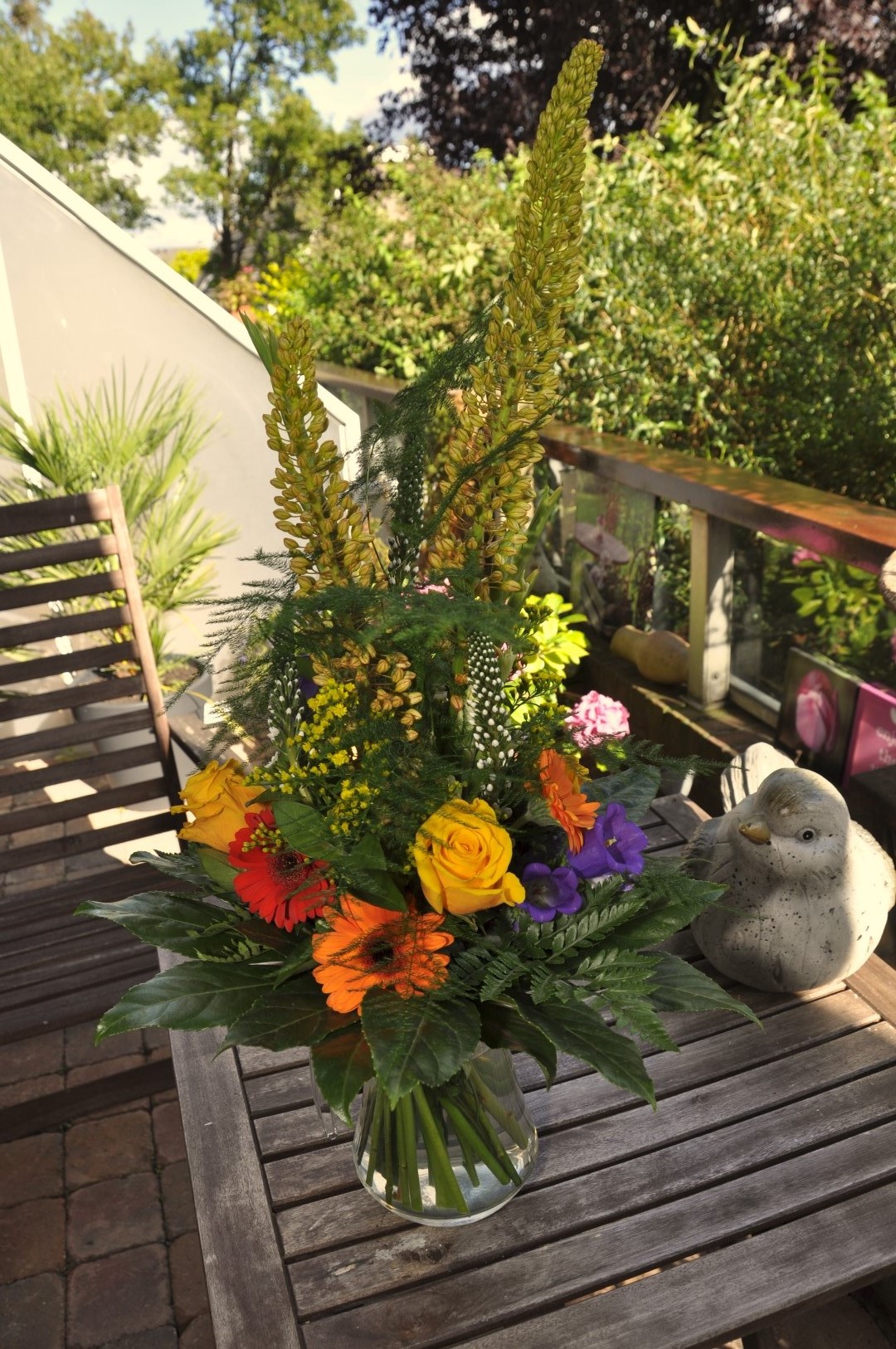 Dag Nicolle, nogmaals geweldig hoe jij al de lessen presenteert. Duidelijk en in een goed te volgen tempo. Ik wilde een boeket maken voor mijn man, die kan wel een opkikker gebruiken. Ik heb de mille fleurs gekozen, helaas waren niet alle bloemen voorradig maar ik heb zo als het ging vervangende bloemen gekozen. Niet zo mooi als die van jou maar ik ben tevreden met mijn eerste boeket. Ben benieuwd wat jij ervan vind.