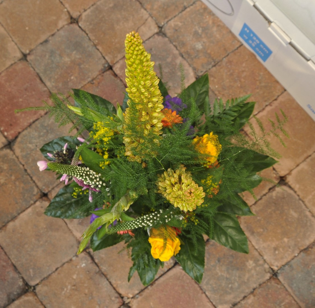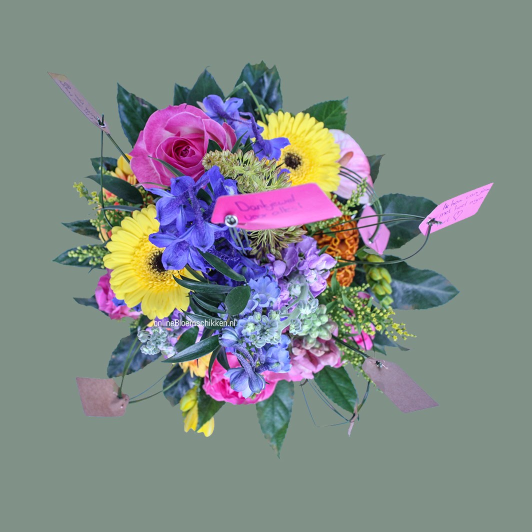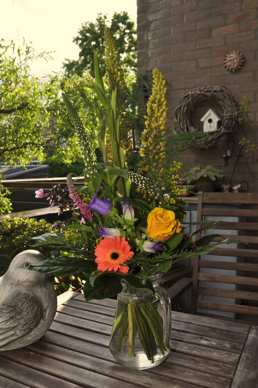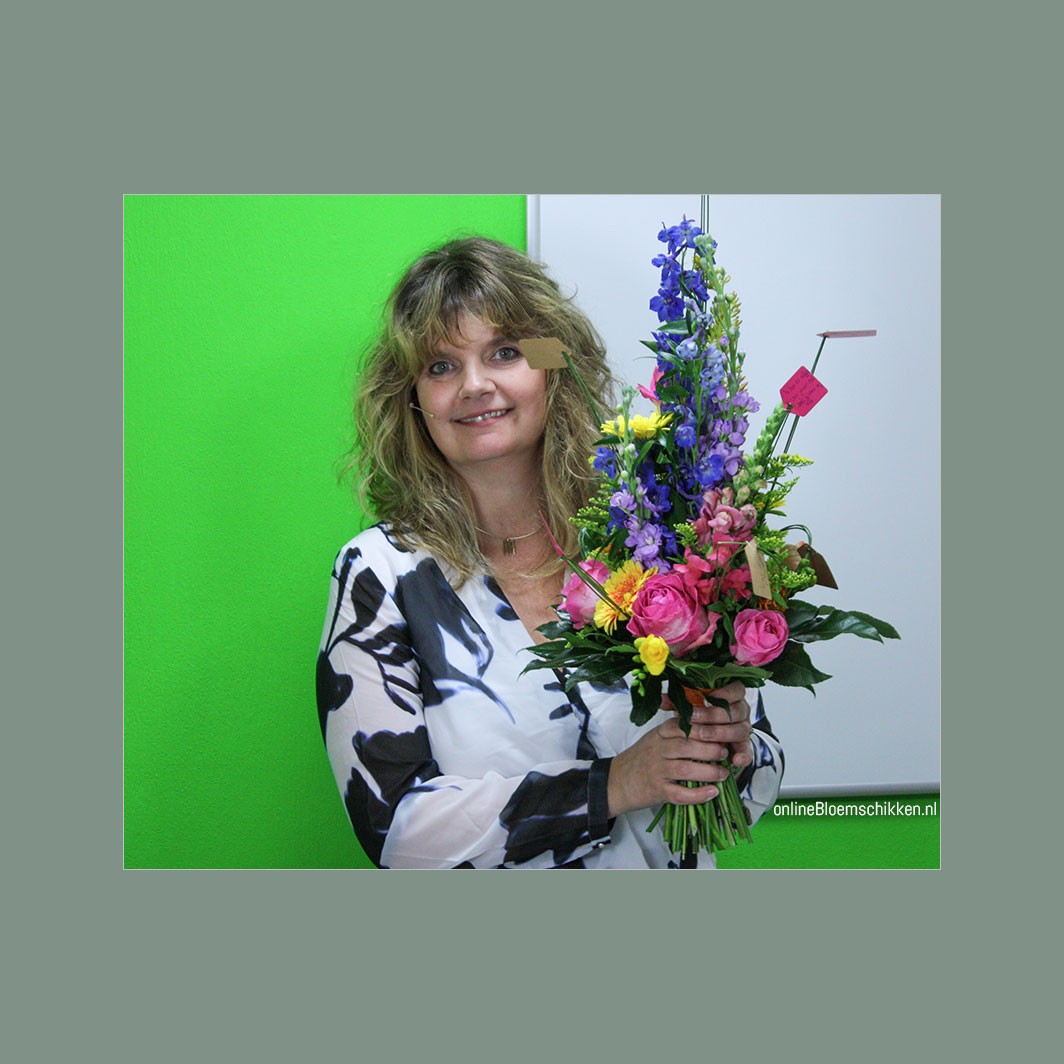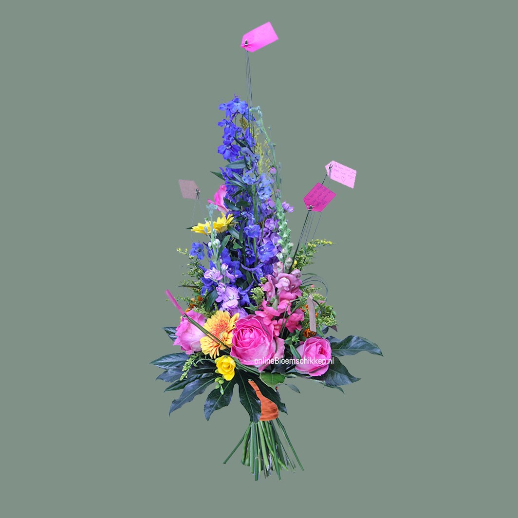 In dit boeket gebruik je zowel de parallel- als de korenschooftechniek. Een vrolijk boeket, waarin je mooi lange bloemen zoals Delfhiniums én ronde bloemen kan gebruiken. Ze komen allemaal tot hun recht.