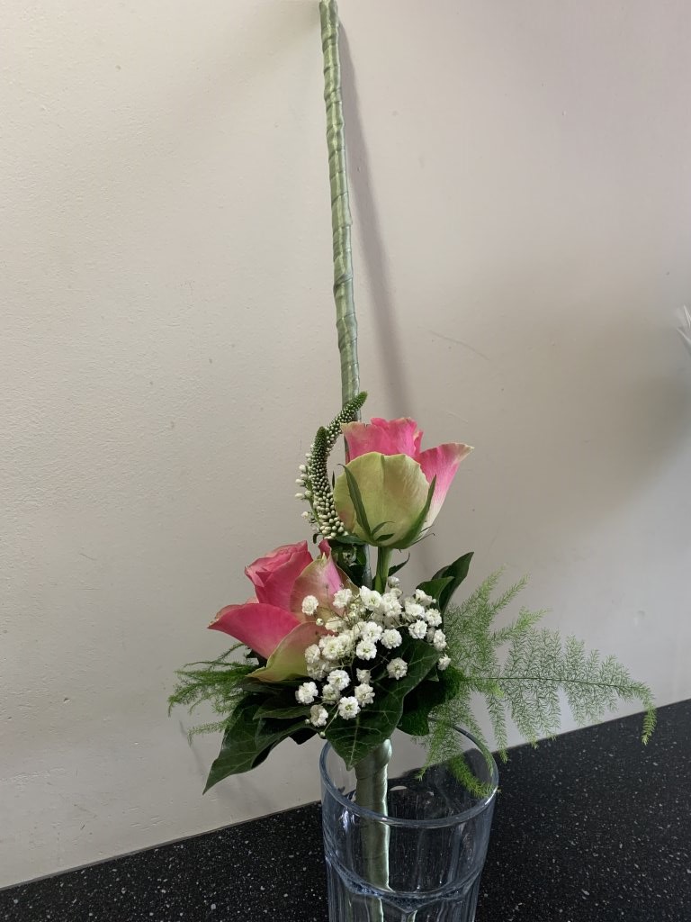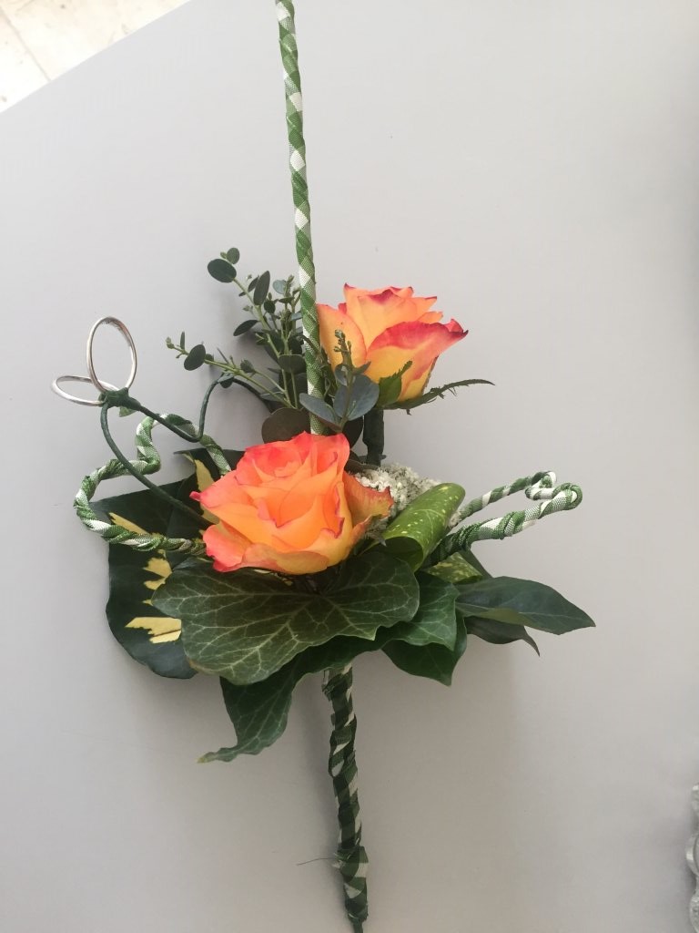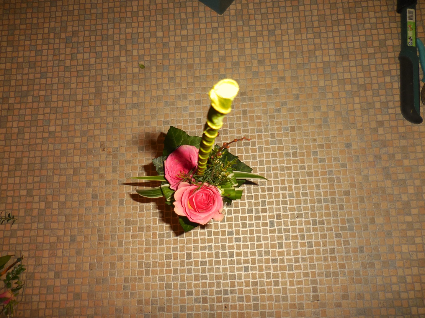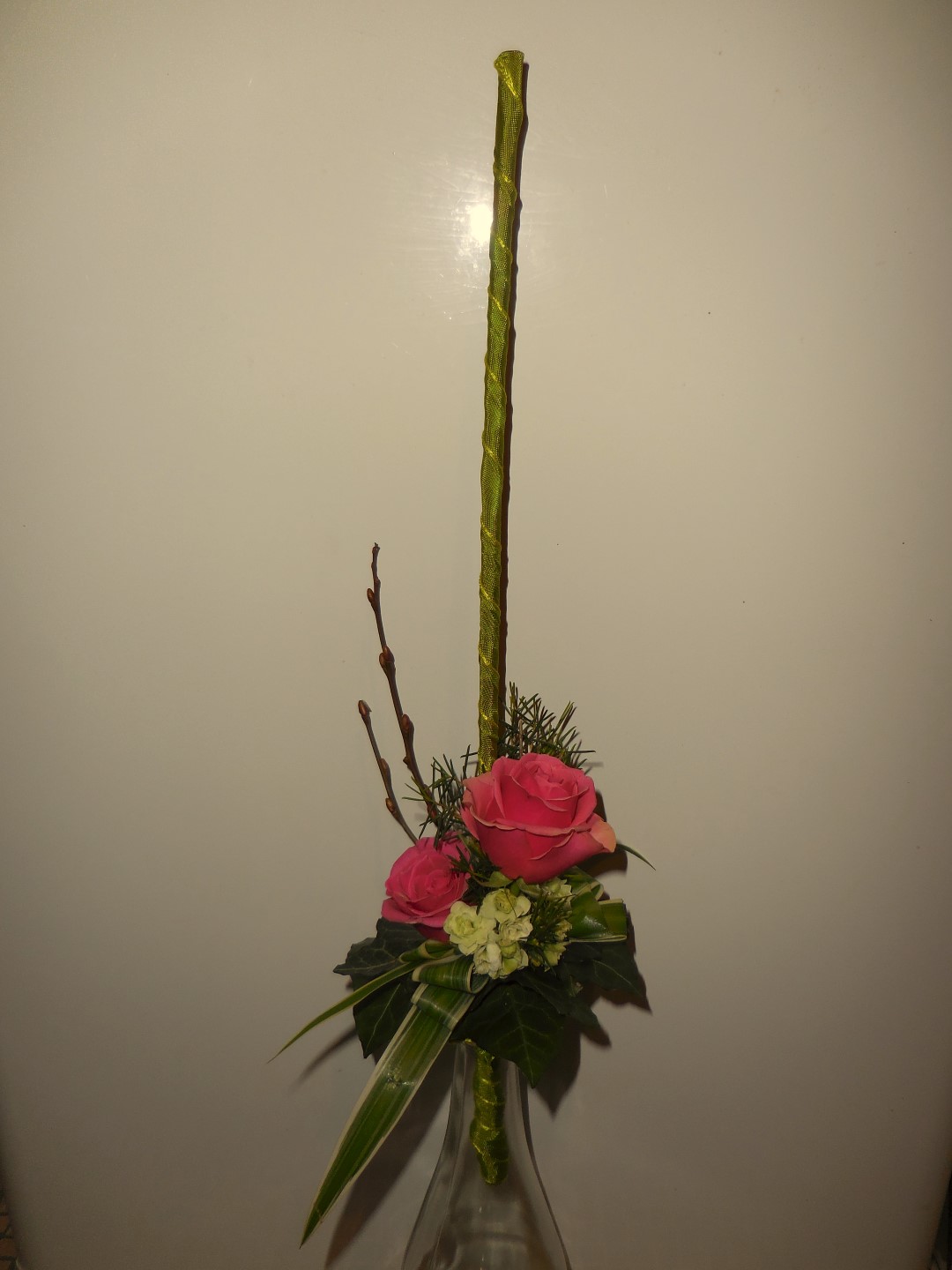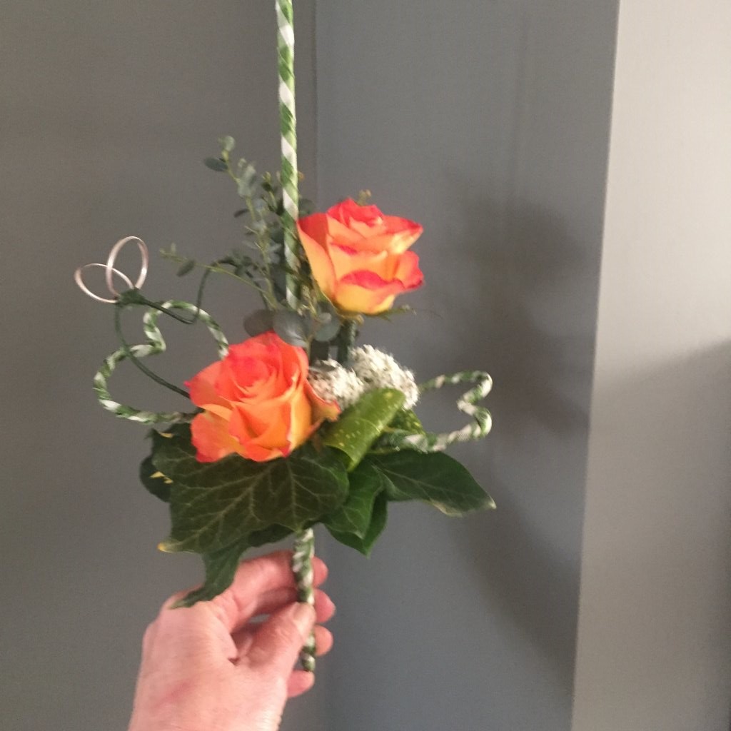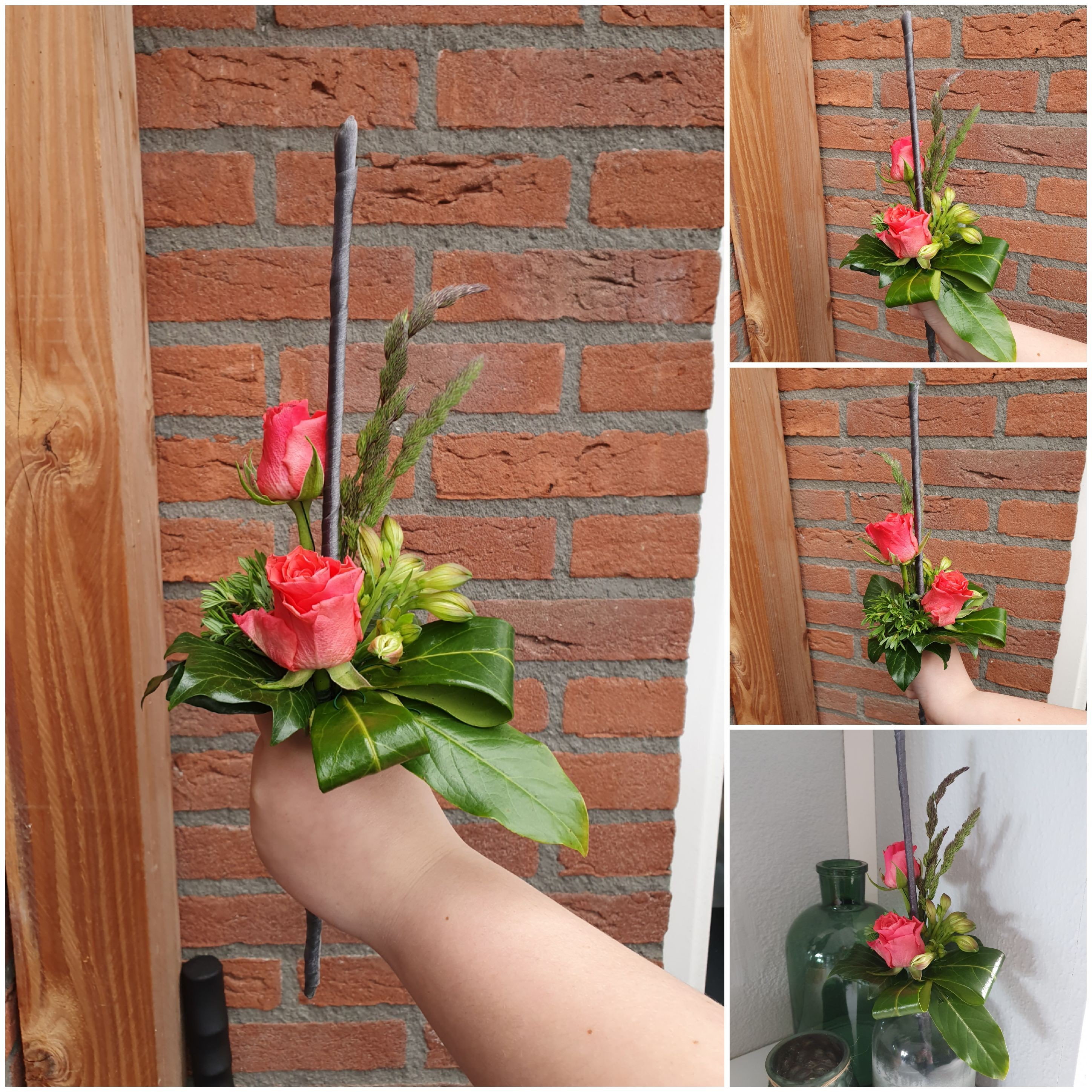 Het Jonkerstafje ziet er goed uit. Had je het stokje helemaal getapt? Dan is hij minder glad. Ik zie aan je langste roos en je Eucalyptus dat je je draden nog iets meer moet buigen. Dus haaks op je bindpunt, dan blijven ze makkelijker rechtop staan. Verder zijn je lijntjes en afwerking prima.