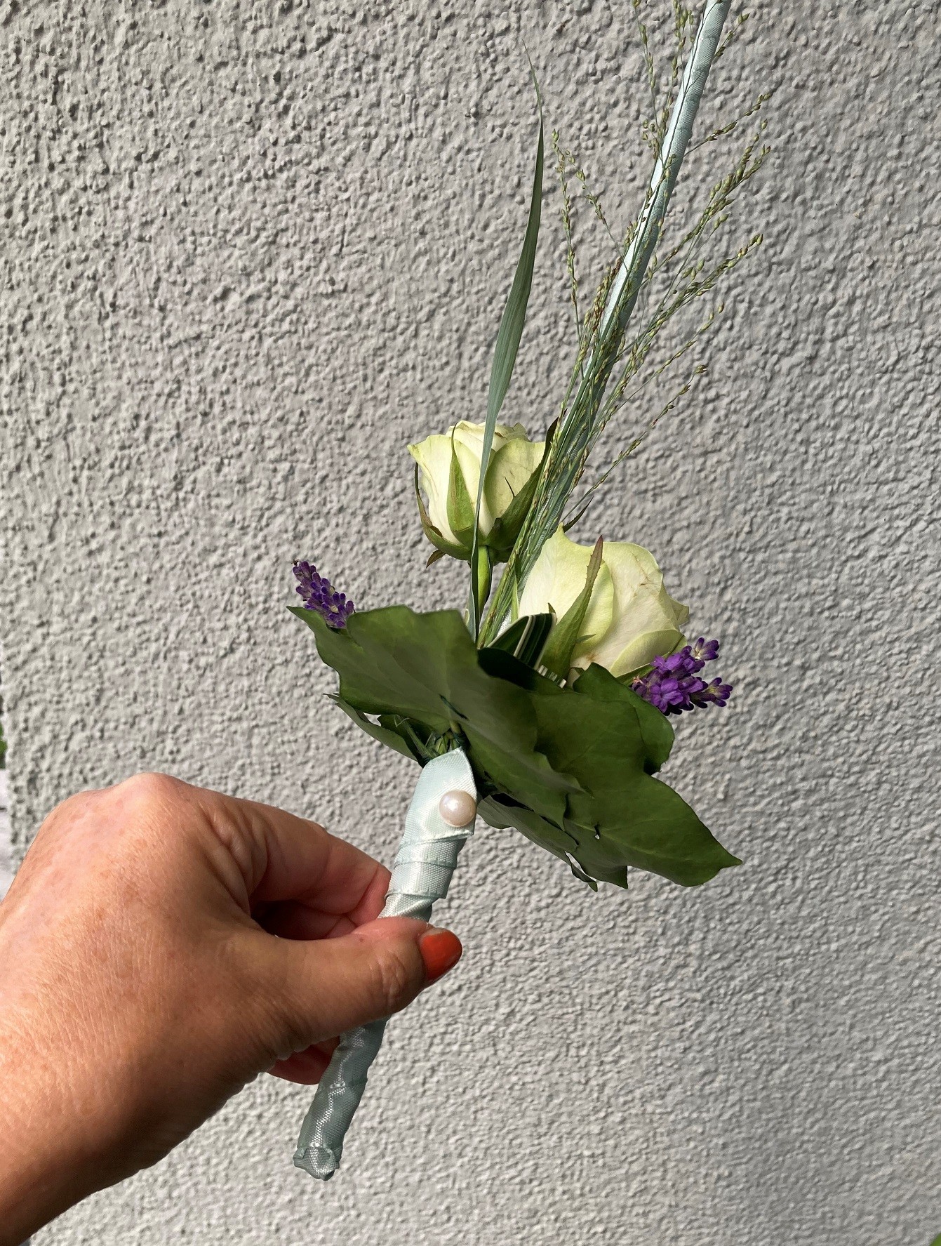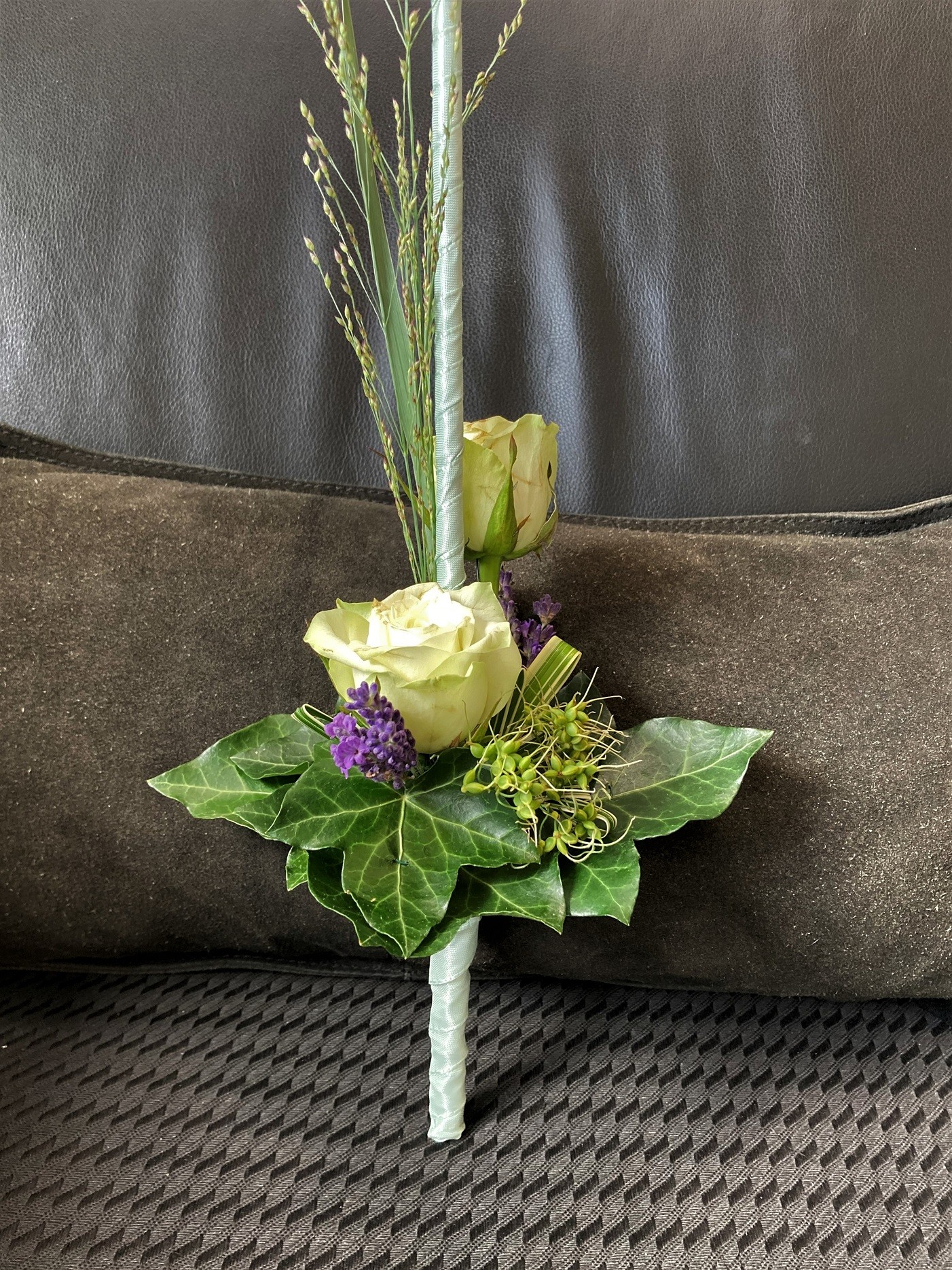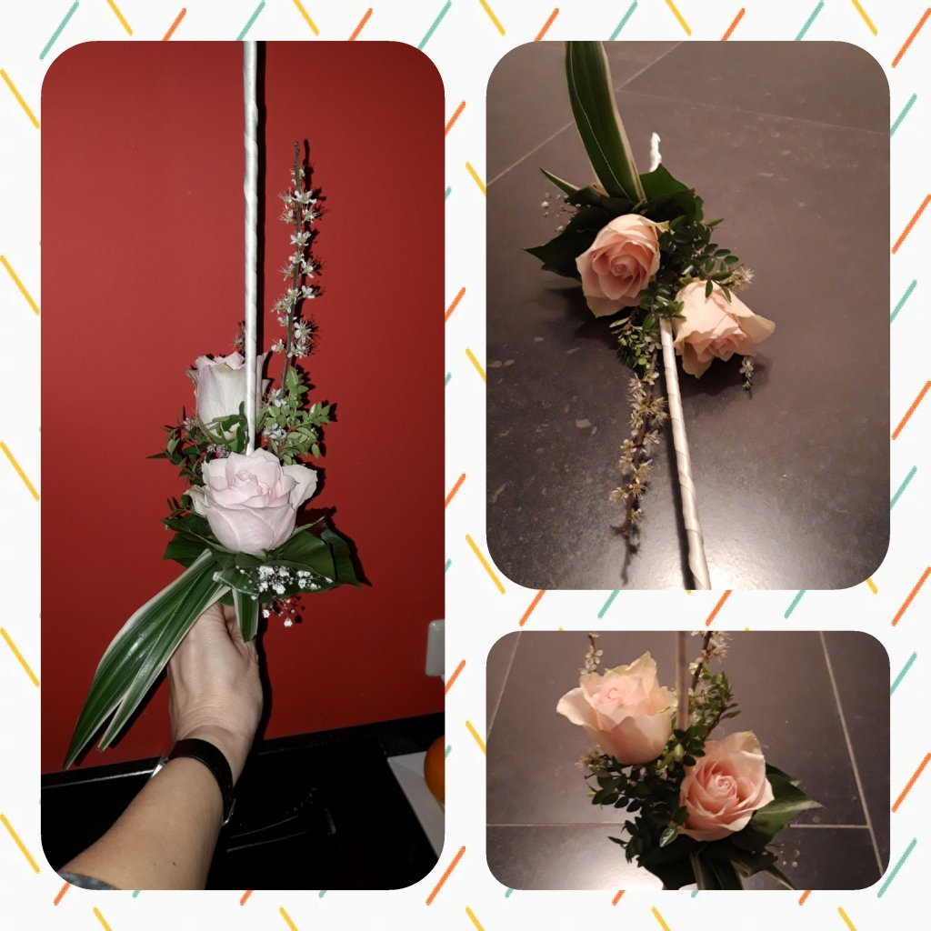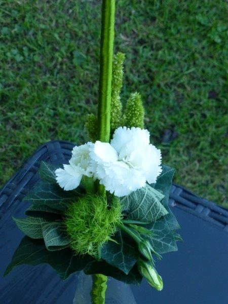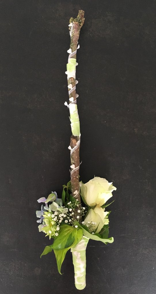 Ook het Jonkerstafje moet je een keer gemaakt hebben. Als iemand zich verdiept in de etiquette van het trouwen, dan zal ook het Jonkerstafje genoemd worden. Wie weet komt het weer eens terug. De lijnen en verhoudingen zijn hetzelfde als bij de damescorsage, maar het is toch nog even lastig met je techniek.