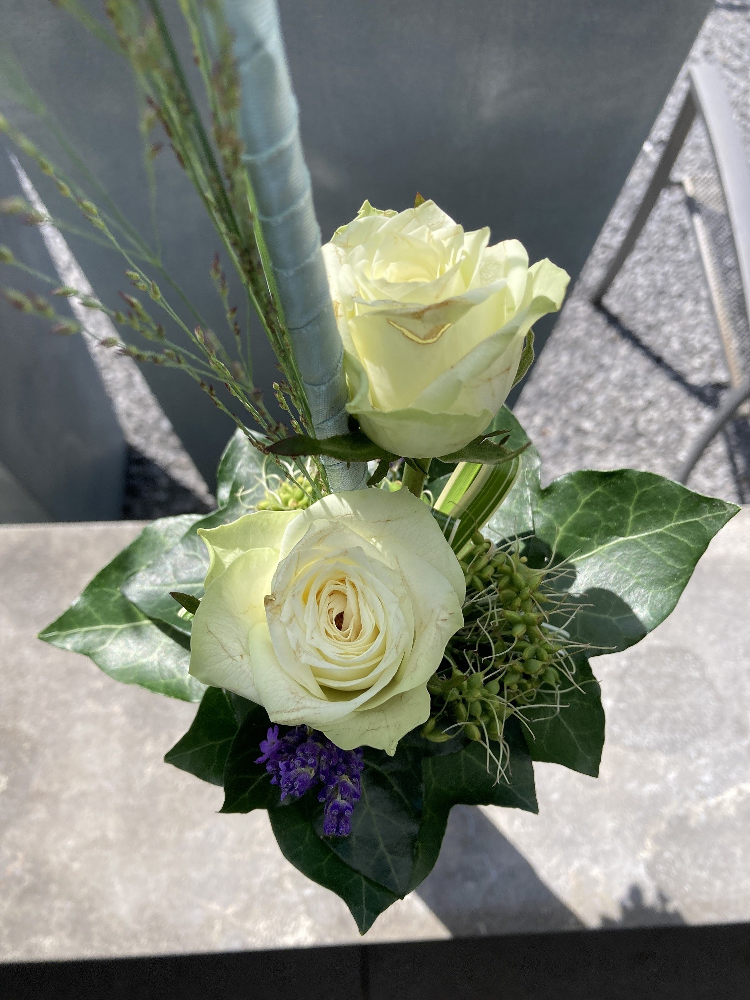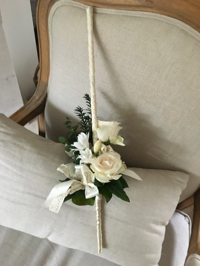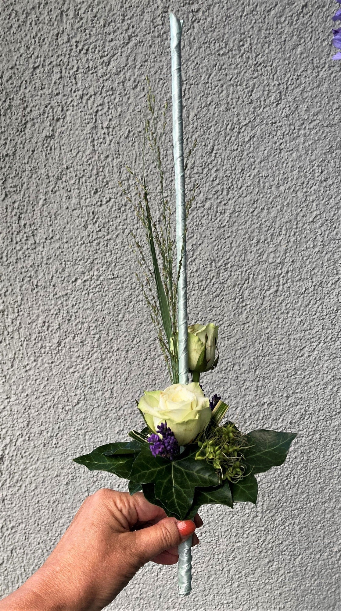 Ook het Jonkerstafje moet je een keer gemaakt hebben. Als iemand zich verdiept in de etiquette van het trouwen, dan zal ook het Jonkerstafje genoemd worden. Wie weet komt het weer eens terug. De lijnen en verhoudingen zijn hetzelfde als bij de damescorsage, maar het is toch nog even lastig met je techniek.