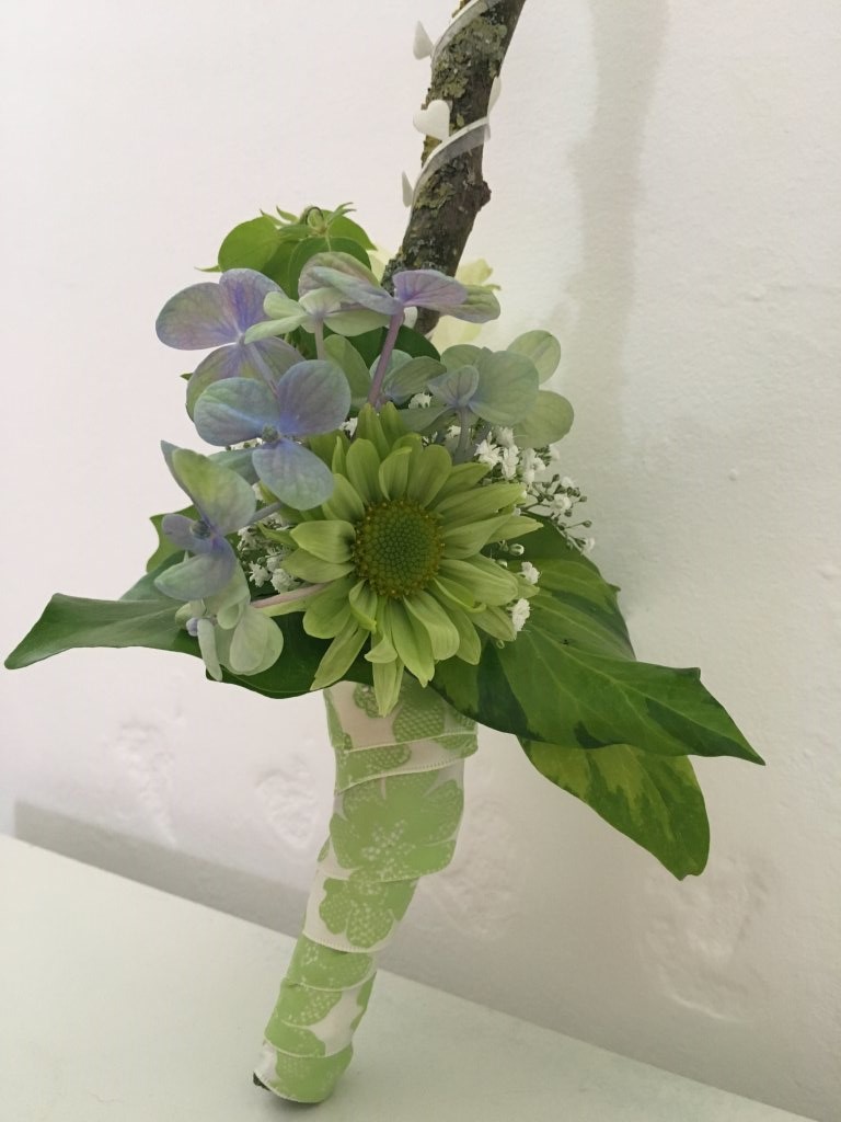 Ik loop wat op de lessen vooruit, maar had veel materiaal over van corsages en bruidsboeket, dus dacht: mooi in dezelfde sfeer blijven en deze opdracht ook invullen. Ik vind de oude bemoste magnolia tak zo mooi, dat ik hem niet helemaal heb ingepakt.Nog meer over, dus ga zo nog een maagdenkrans maken en kleine biedermeier voor bruidsmeisje. Kortom: heerlijk bezig! Ik hoor het wel weer van je. Grtz, Mirjam.