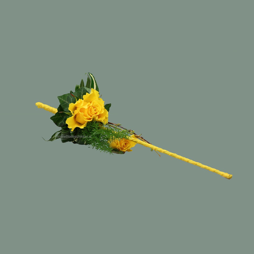 Hij is erg leuk geworden. Keurige lijntjes. Misschien is je bladrozet wat groot voor een jongetje van een jaar of 6, maar dat kan je je vast wel voorstellen. Je corsage mag ook nog iets lager zitten dat het handvat net lang genoeg is voor een kinderhandje. Voor de rest is hij echt prima. Heel goed gedaan.