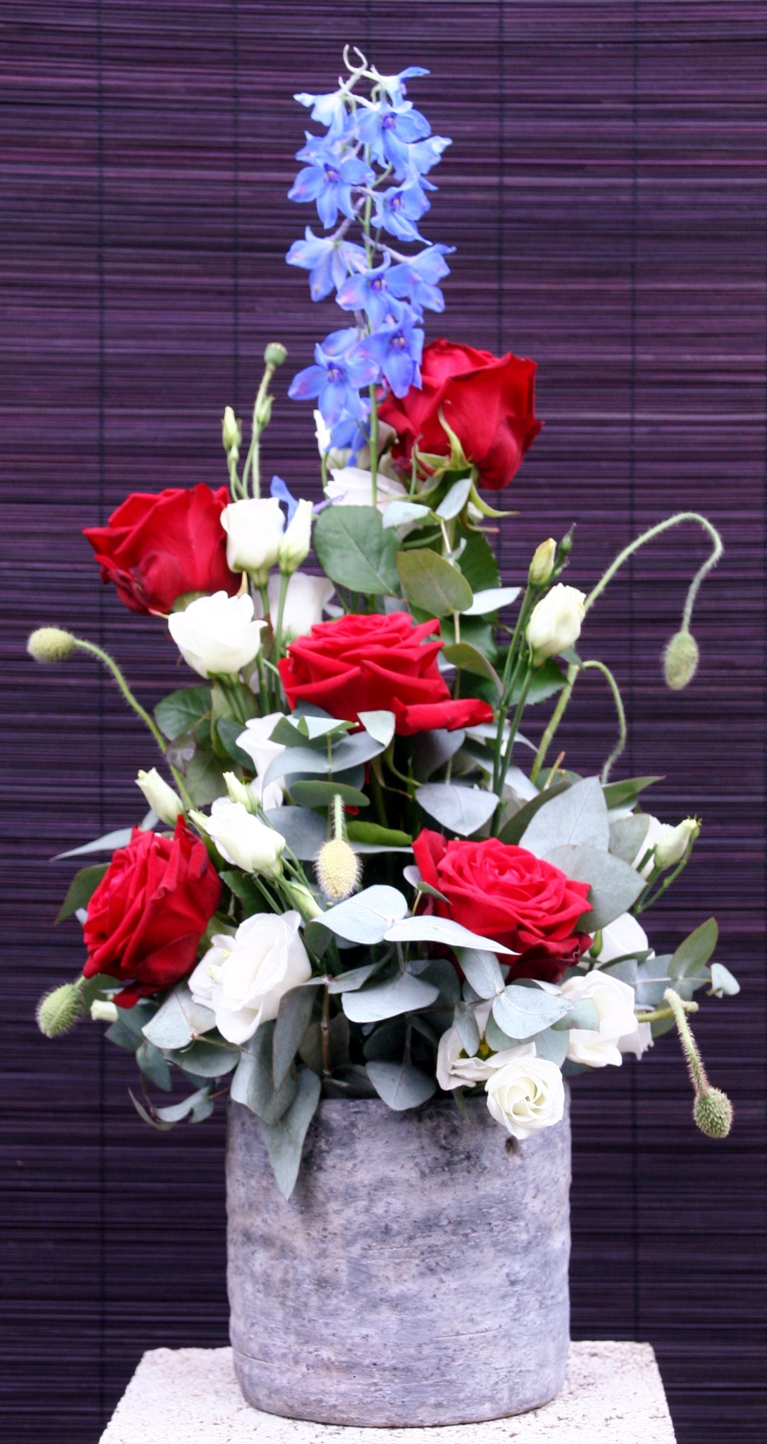 Je vorm heb je mooi slank gelaten en past goed bij de vaas. De rozen en het groen zijn ook mooi verdeeld. Ik zou alleen de roos of de Eustoma als hoogste gebruikt hebben. Ik ben gek op blauwe Delphinium, maar nu trekt hij erg veel aandacht. Zonder hem zou je stuk meer in balans zijn en de aandacht krijgen wat het verdiend.