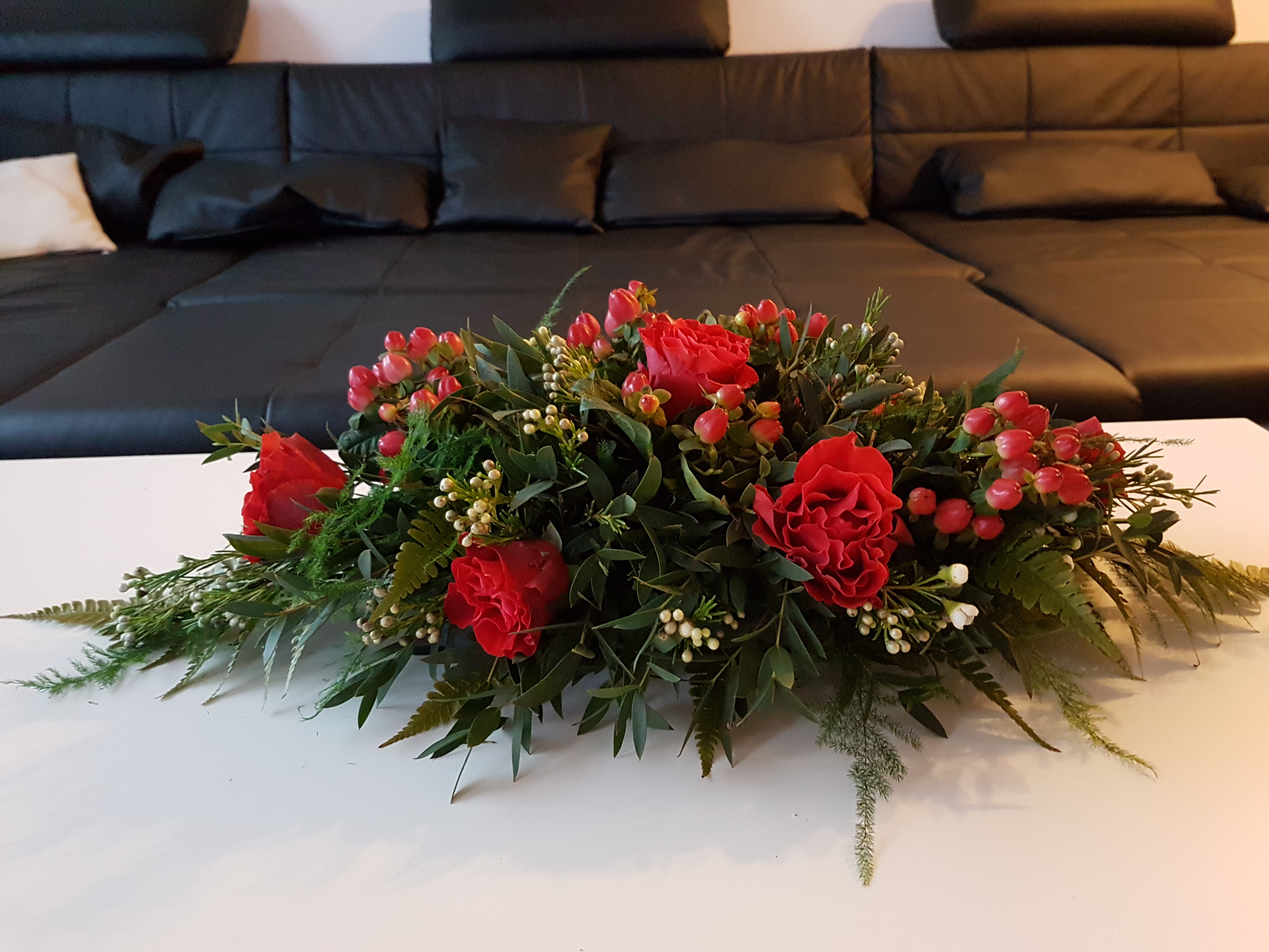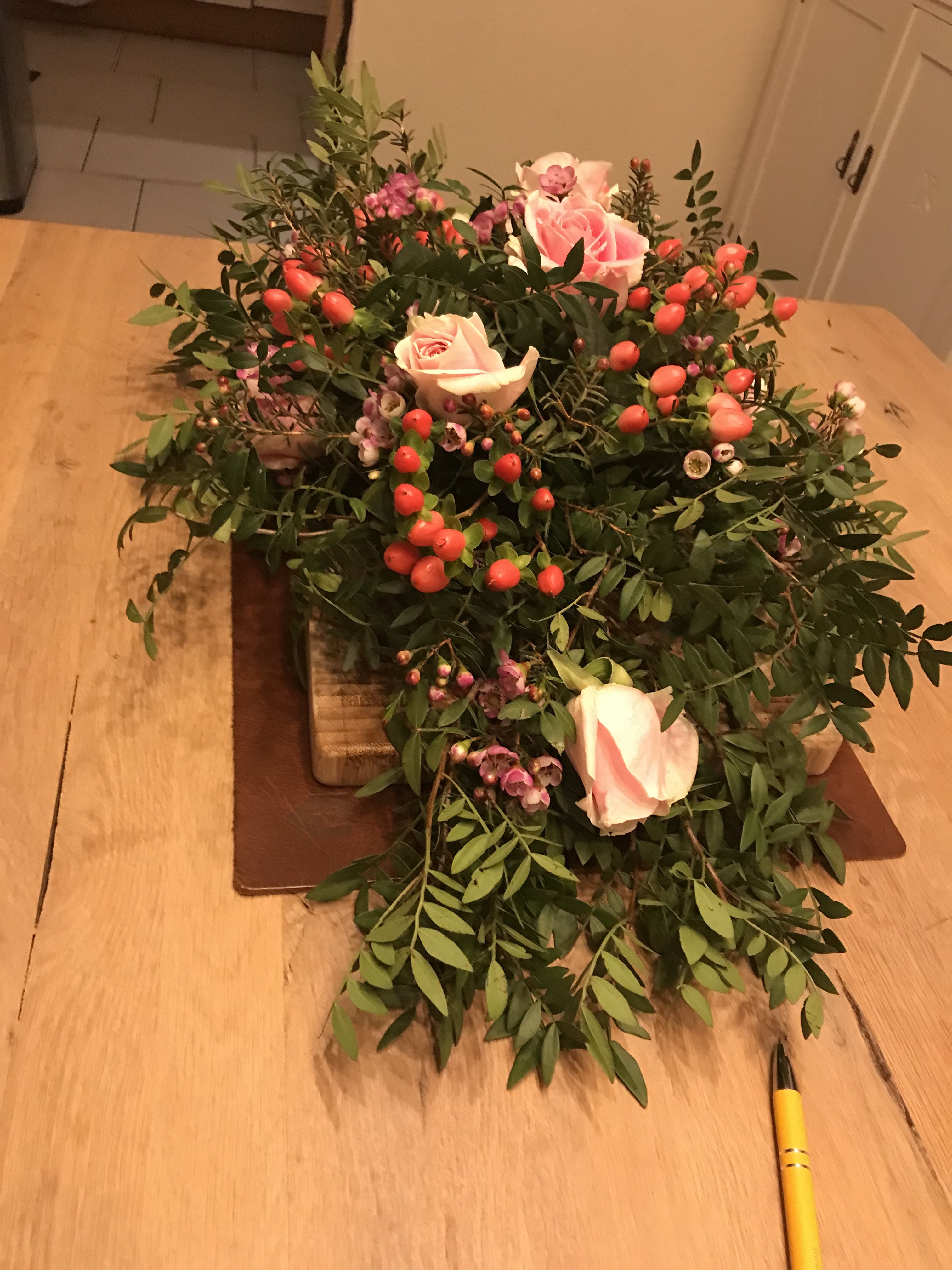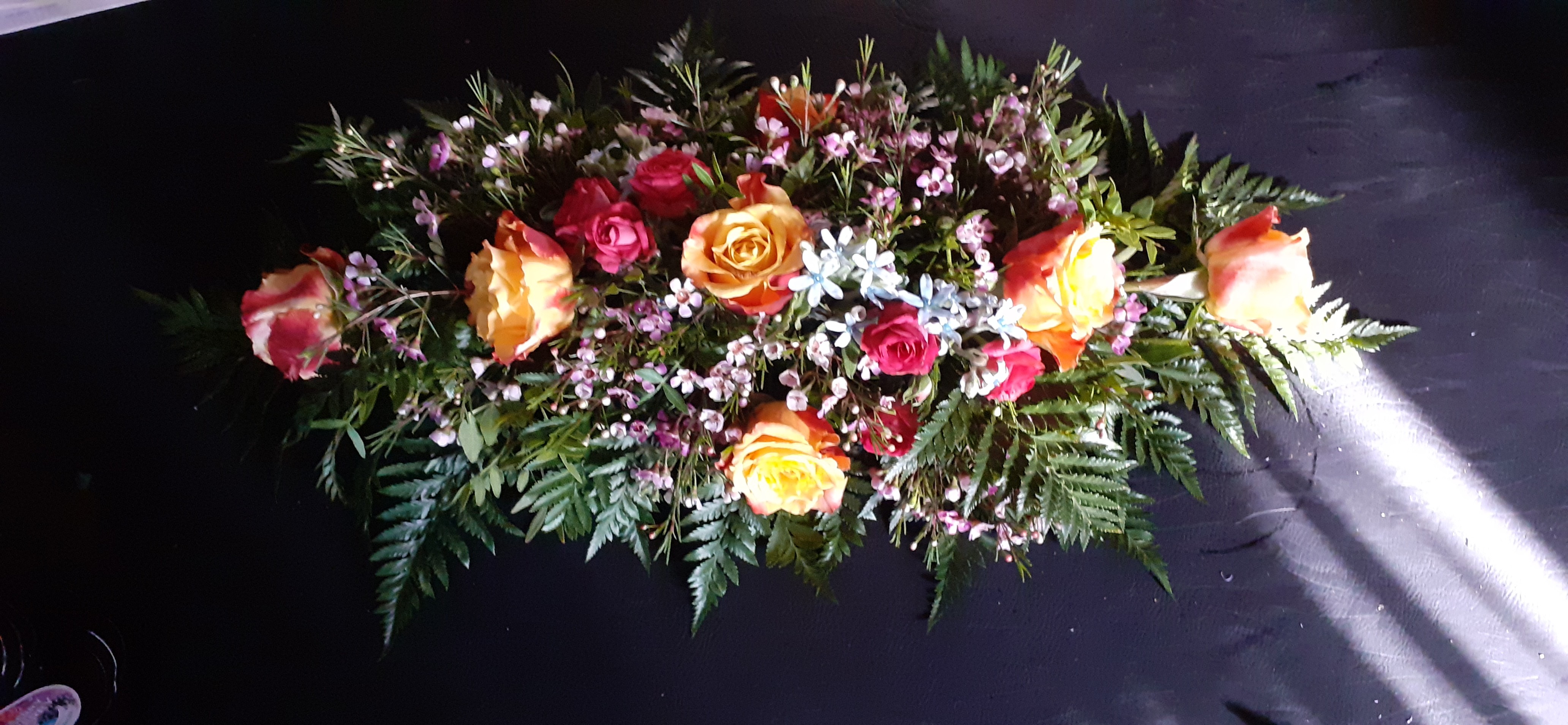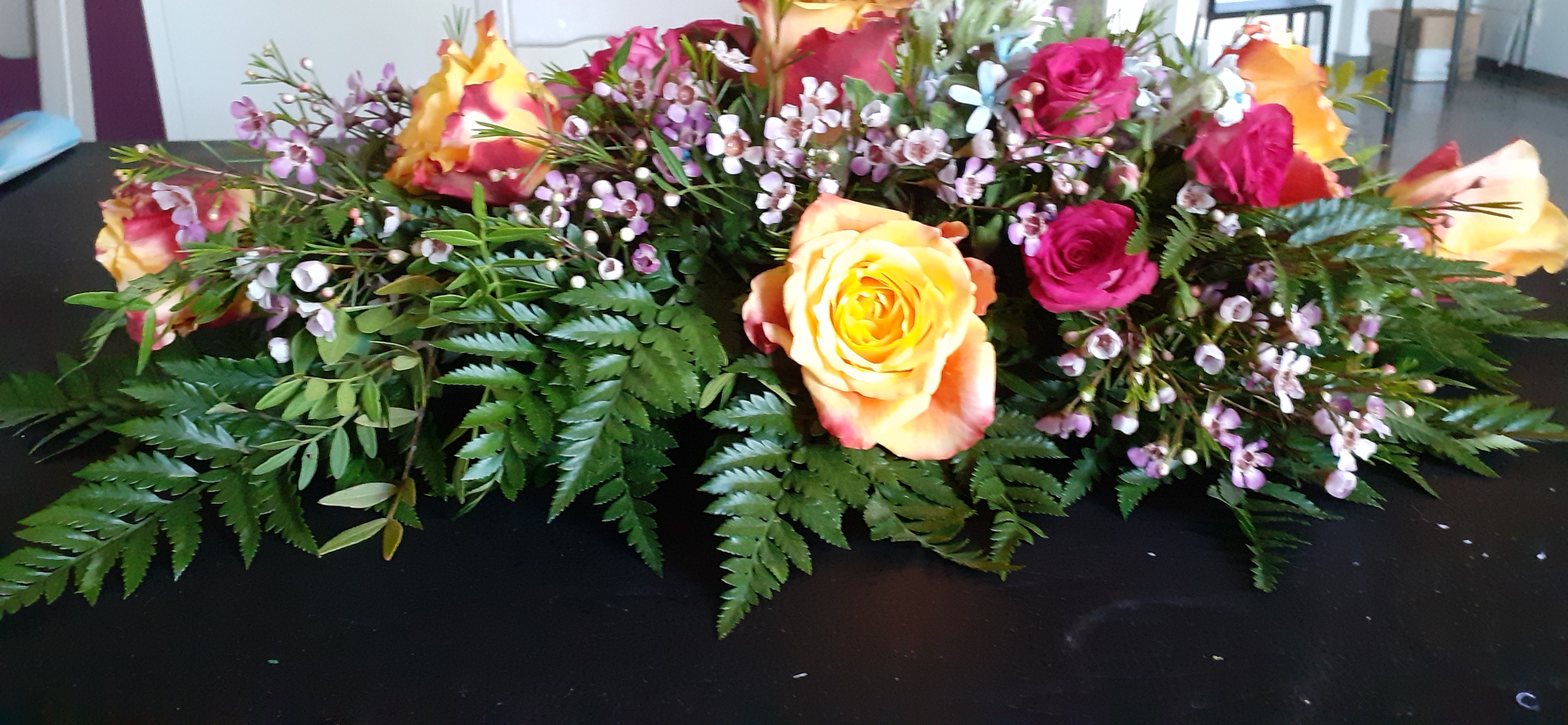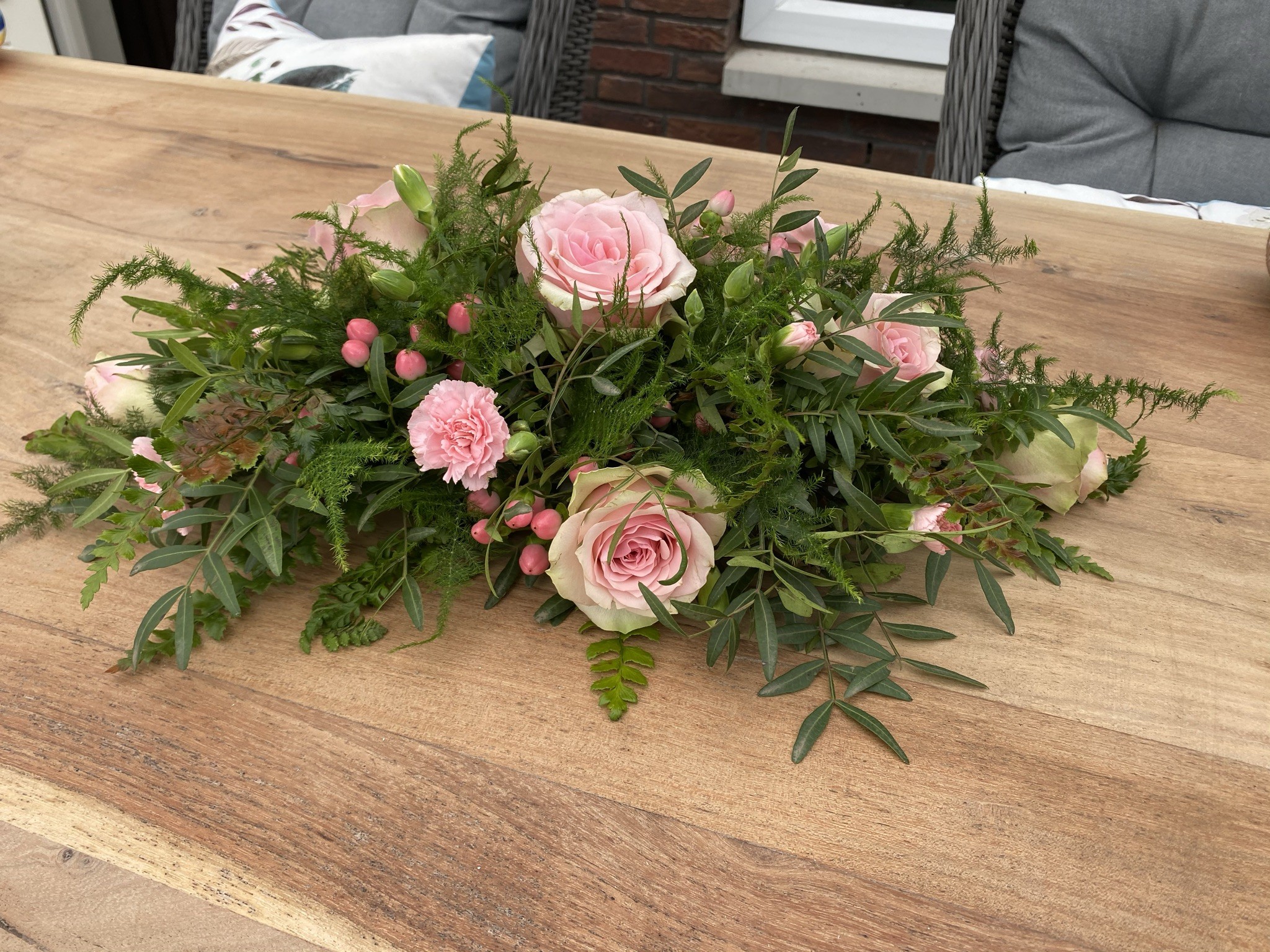 Hierbij heb ik het bloemstuk verbeterd met de rozen aan de lange zijkant meer uit te doen komen en wat grotere varens in gestopt.