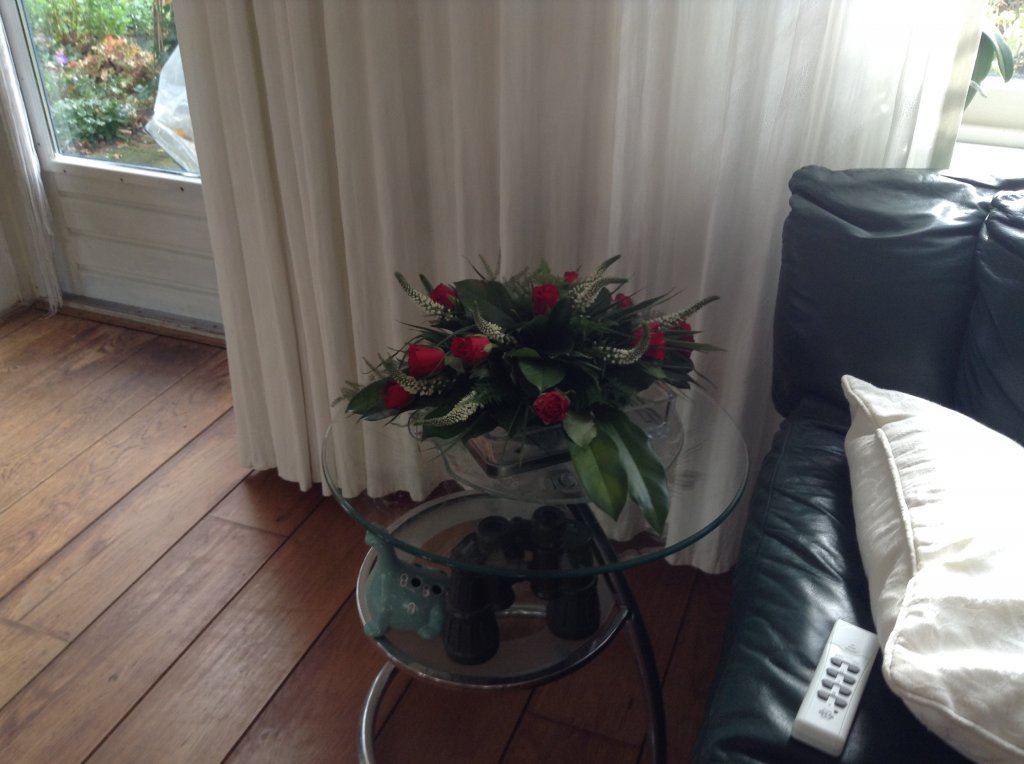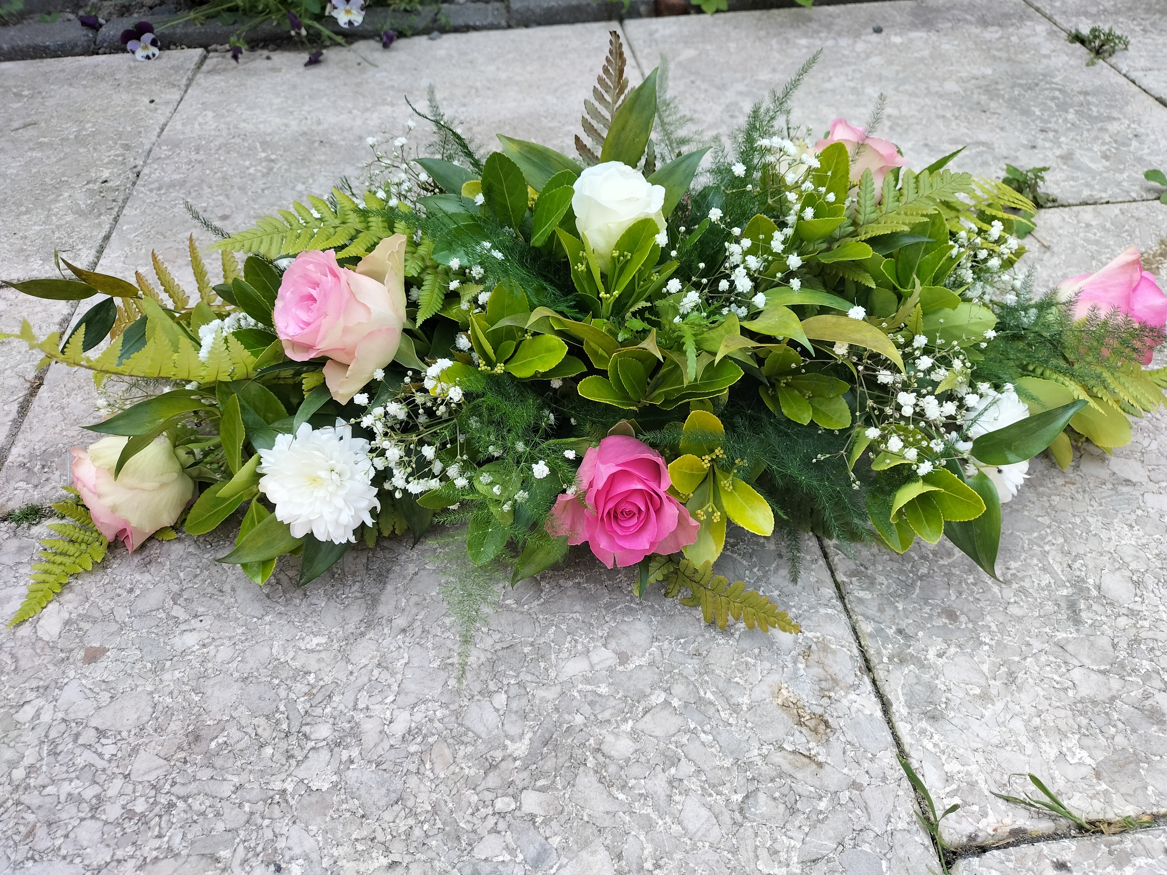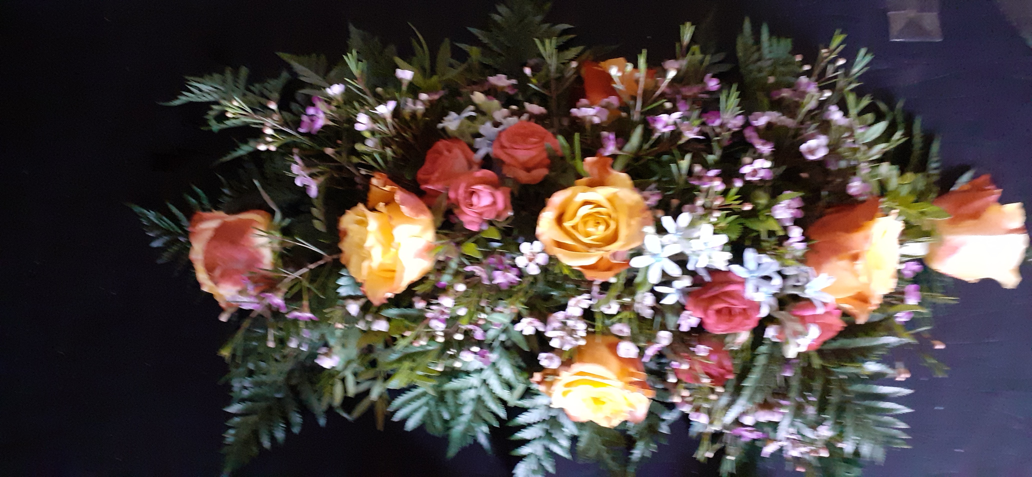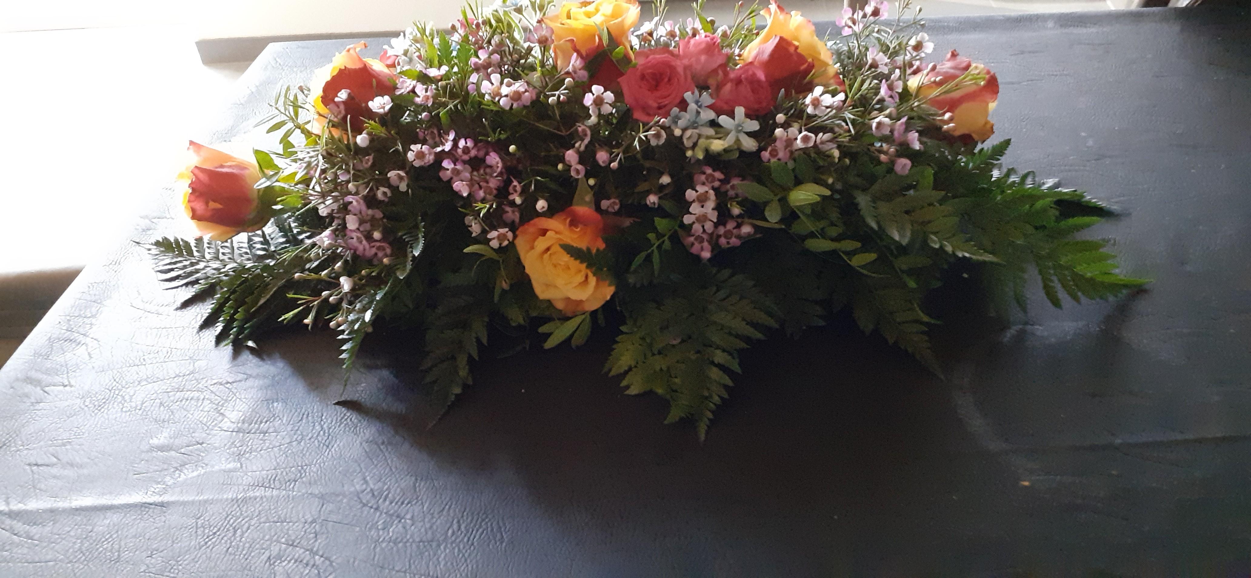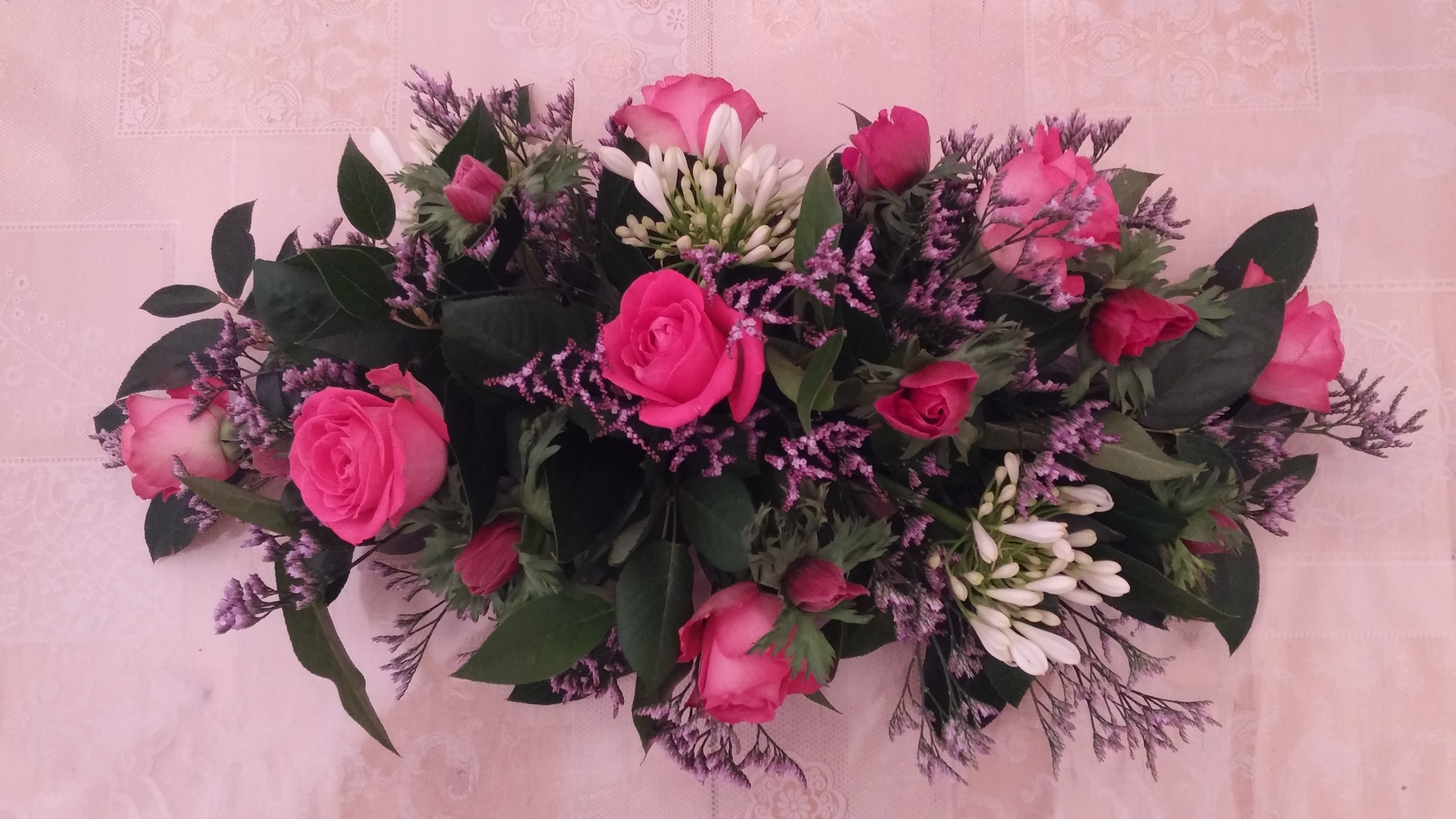 Hierbij heb ik het bloemstuk verbeterd met de rozen aan de lange zijkant meer uit te doen komen en wat grotere varens in gestopt.