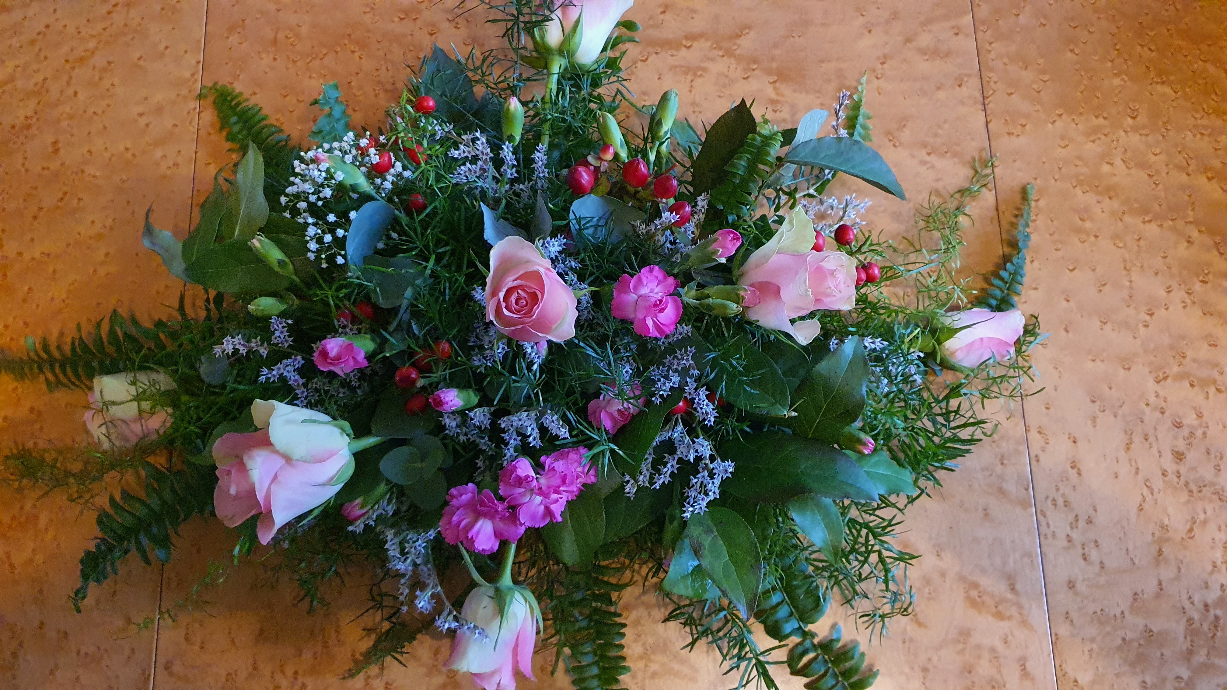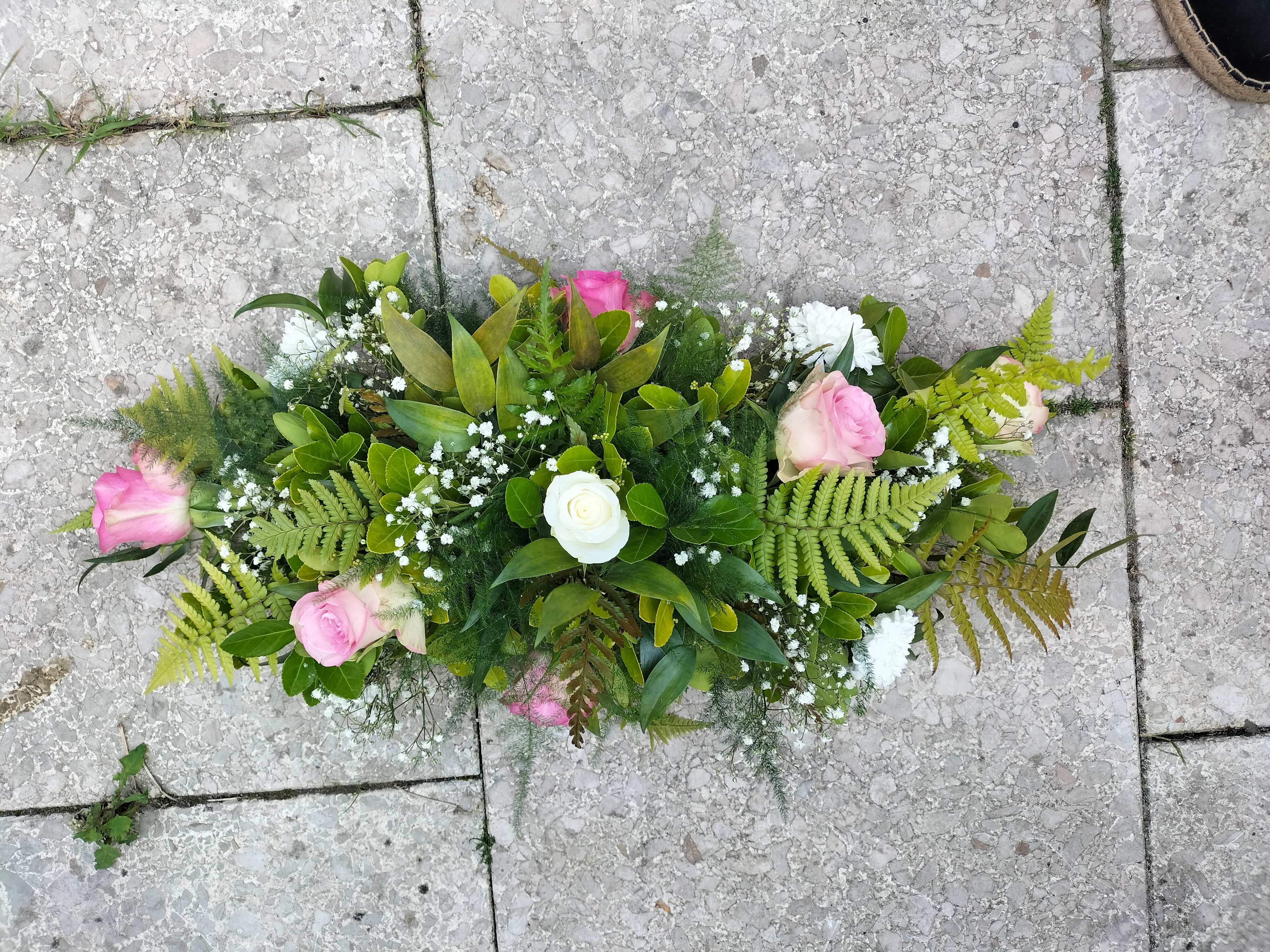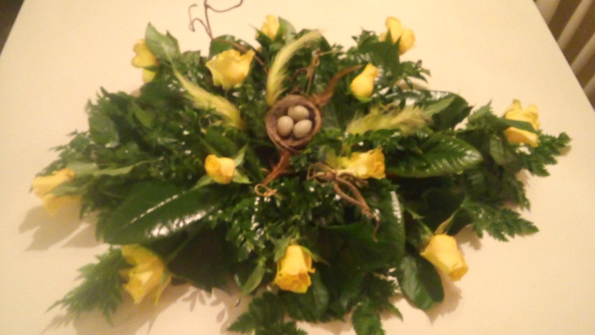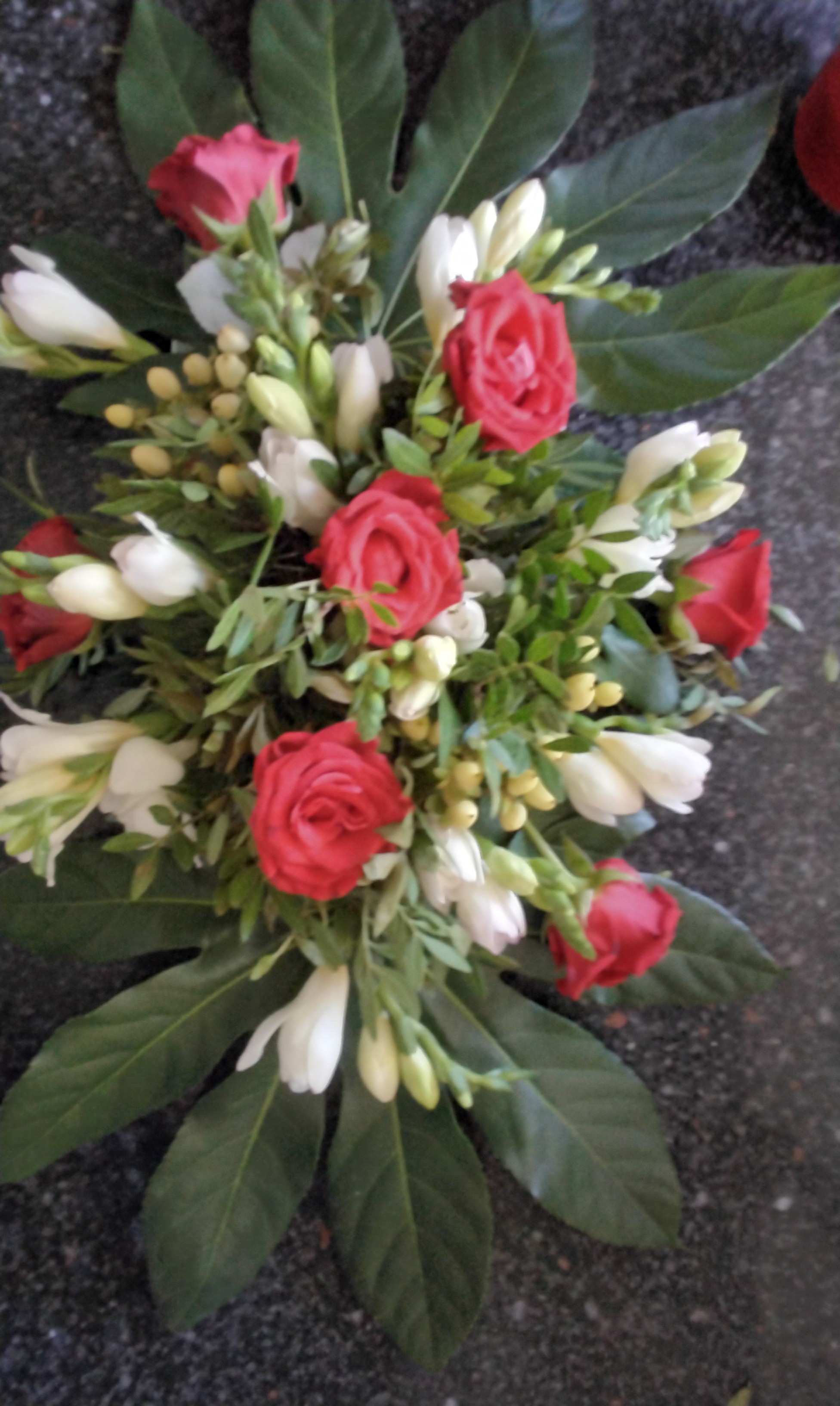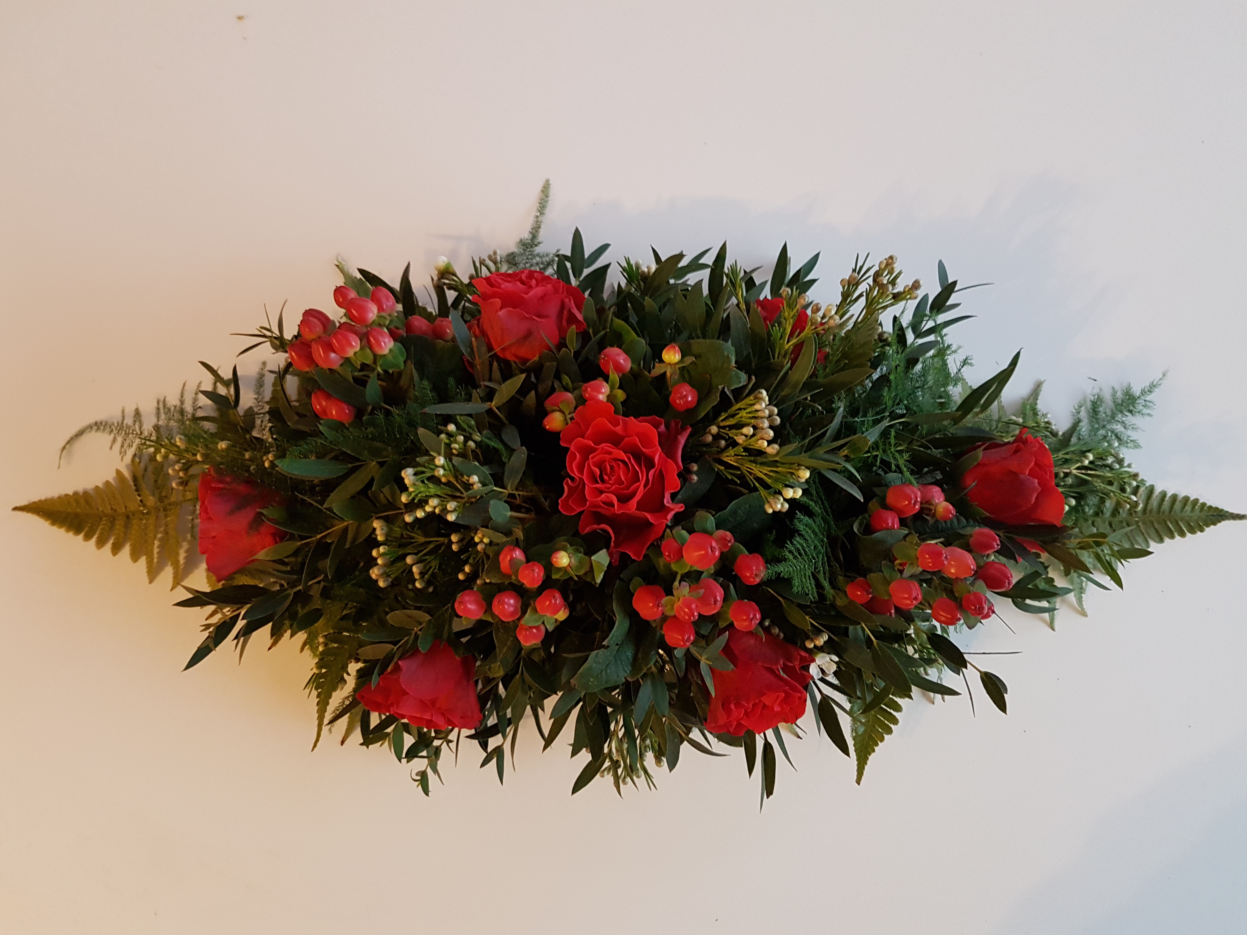 Hierbij heb ik het bloemstuk verbeterd met de rozen aan de lange zijkant meer uit te doen komen en wat grotere varens in gestopt.