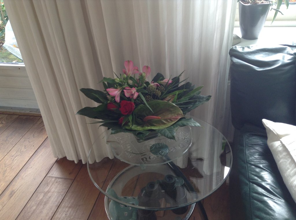 Dank je wel voor je foto. Fijn dat je er van geniet, dat is ook het belangrijkste. Hij ziet er ook al erg leuk uit. Volgende keer gaat het vast makkelijker als je andere bloemen hebt dan Germini's. Deze zijn erg groot en rond als hoofdbloem in dit arrangement.
