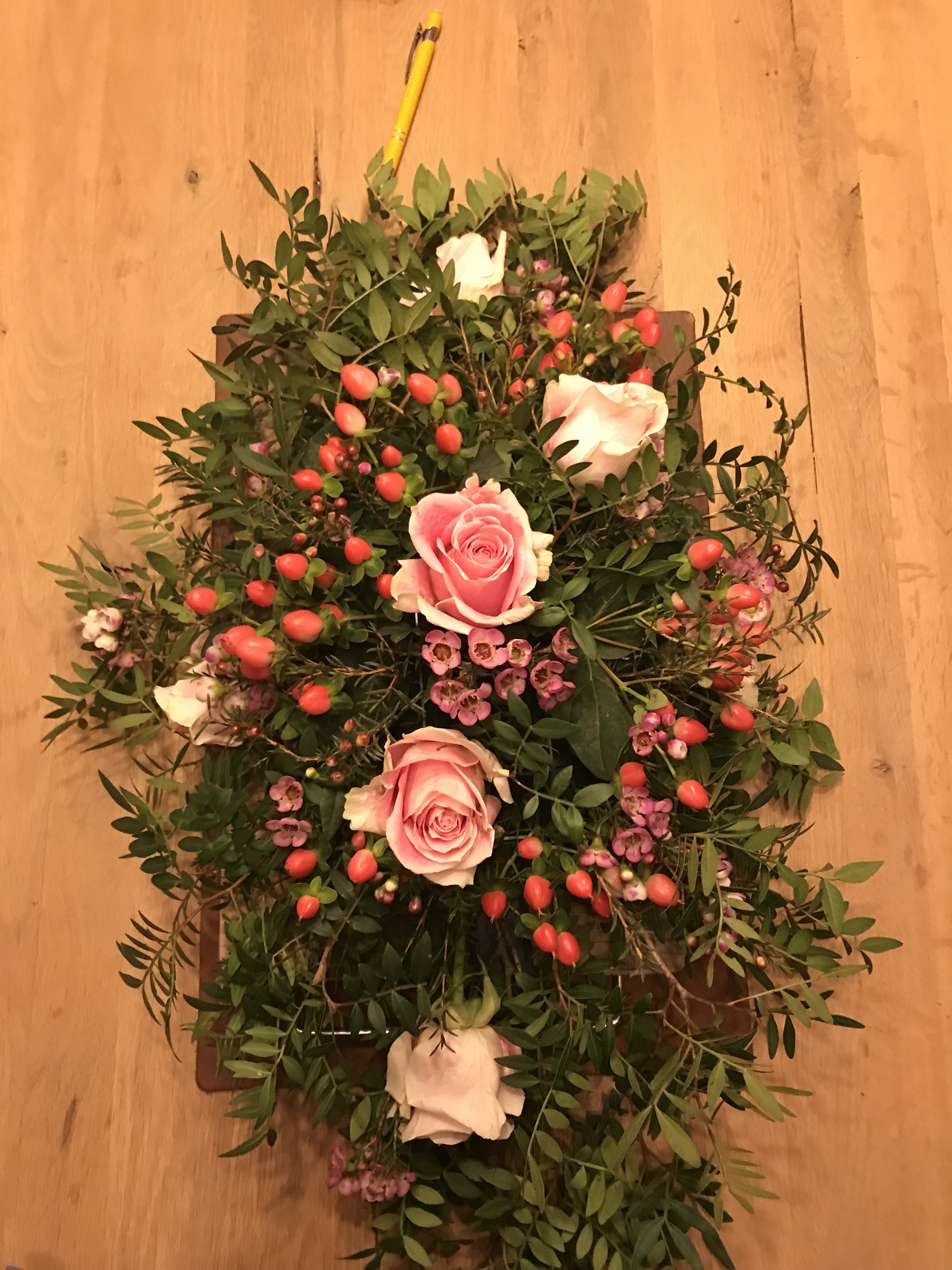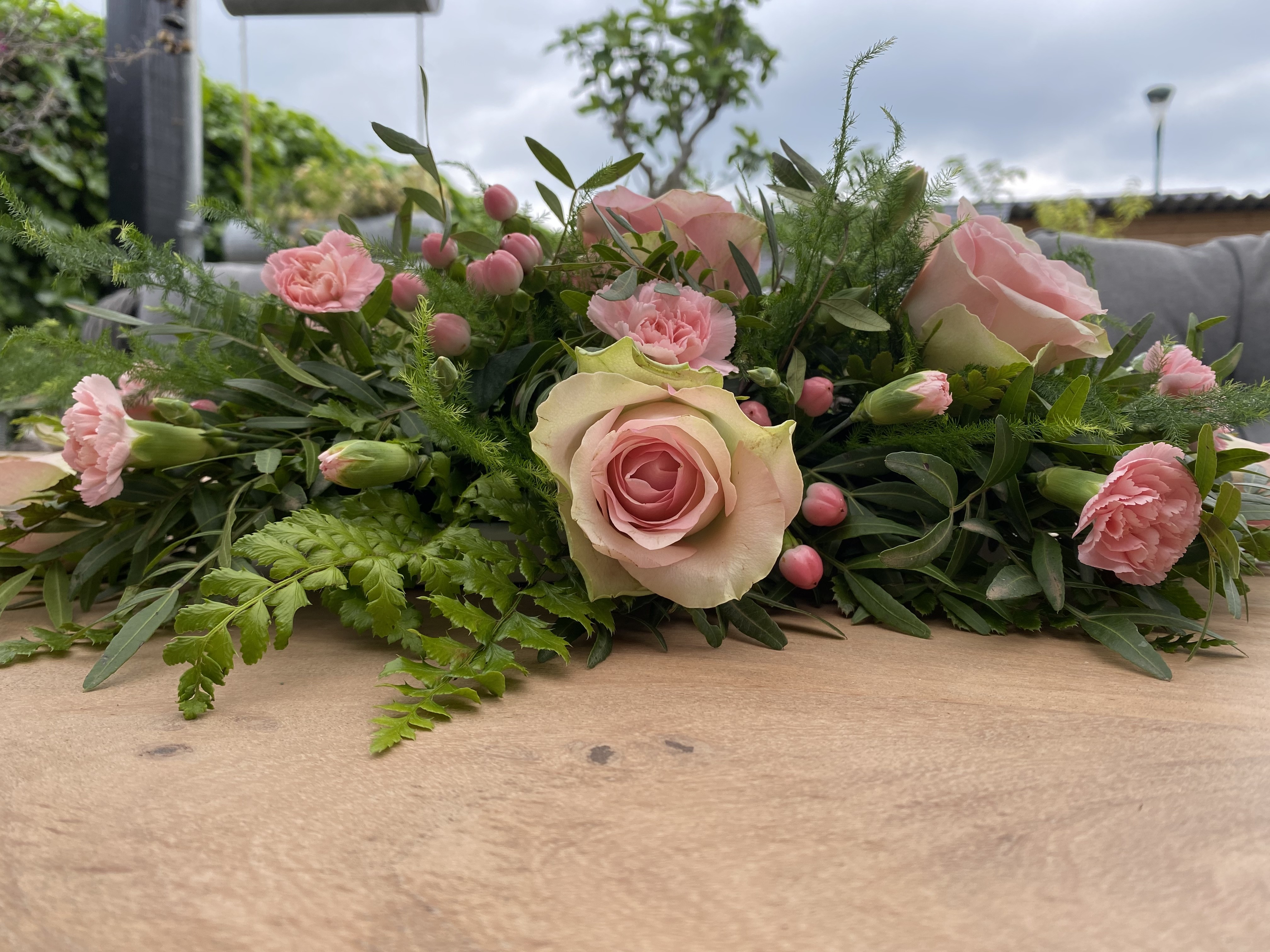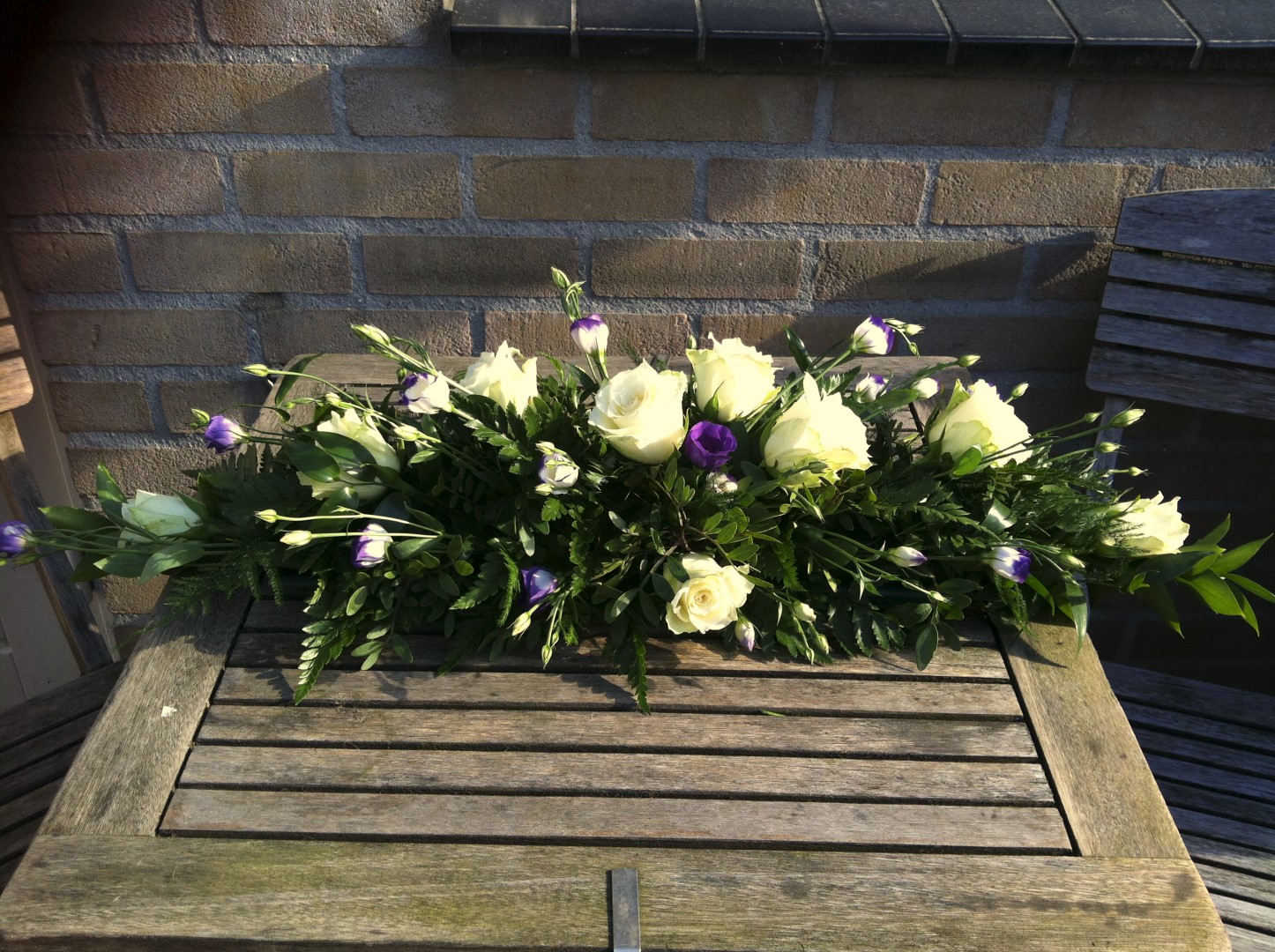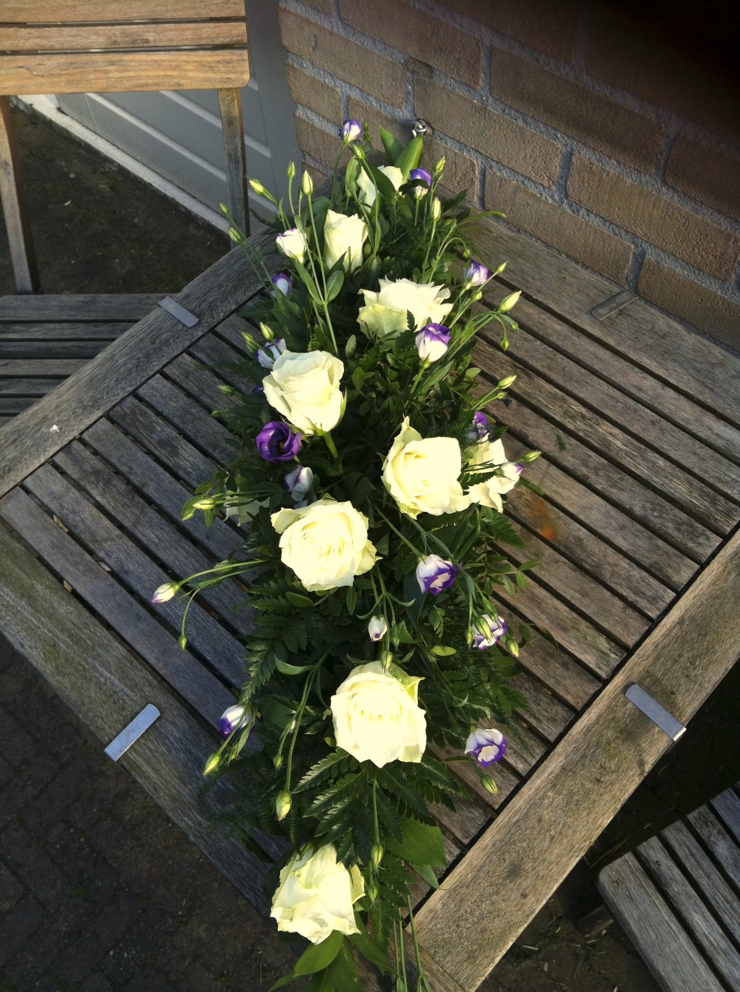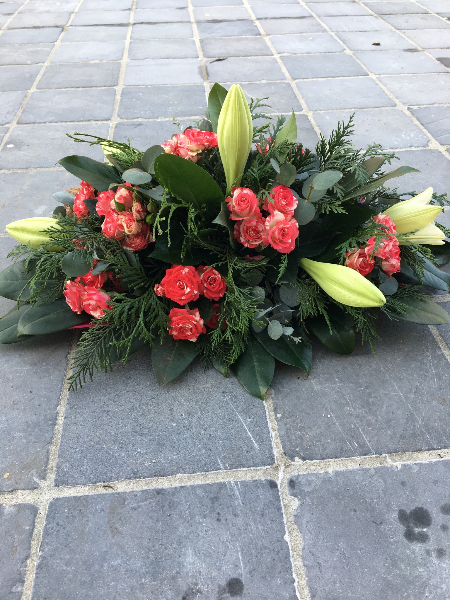Met veel ervaring en een 'één meter oasishouder' kan je er in deze stijl ook een kistbedekking van maken.
