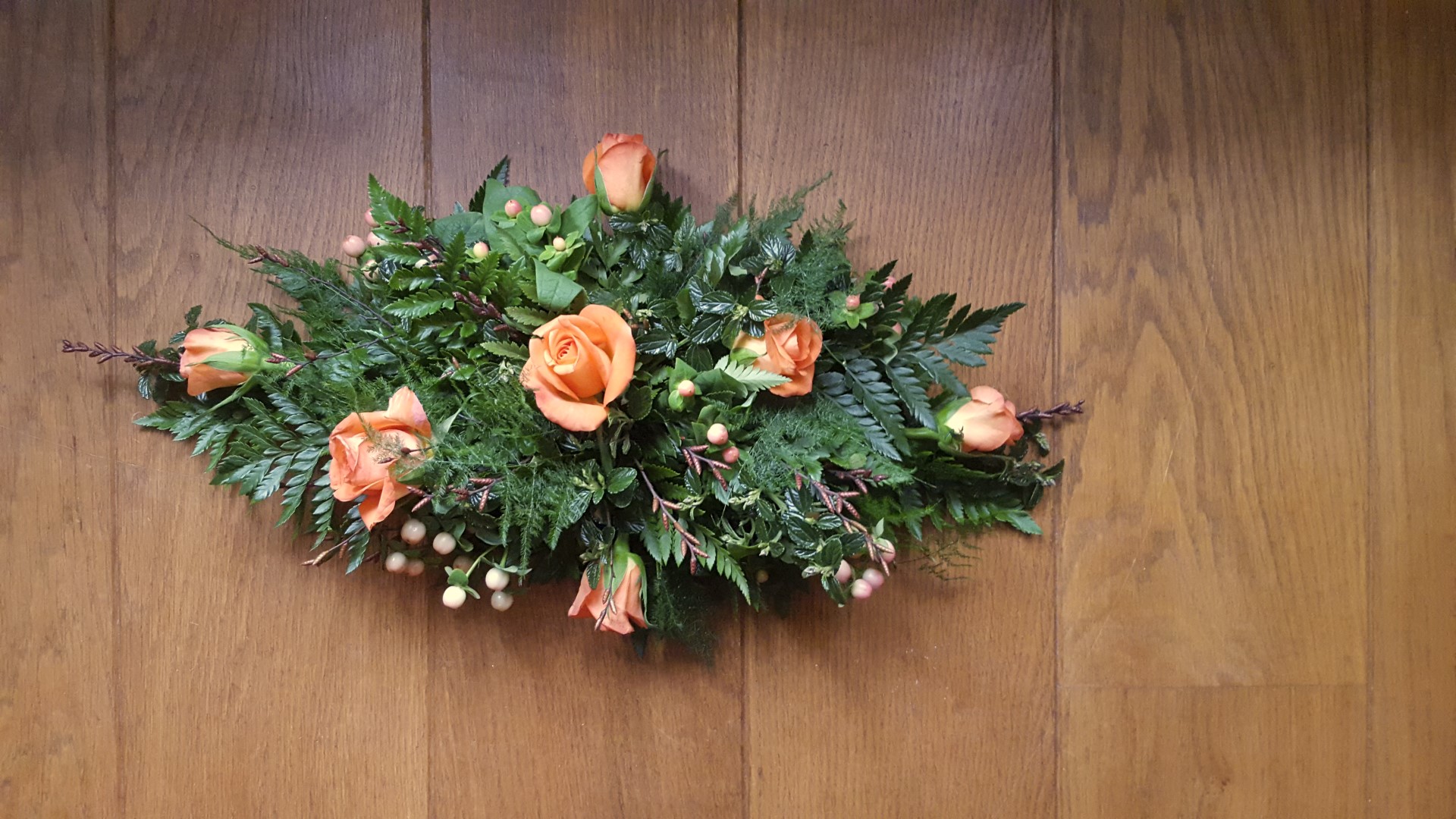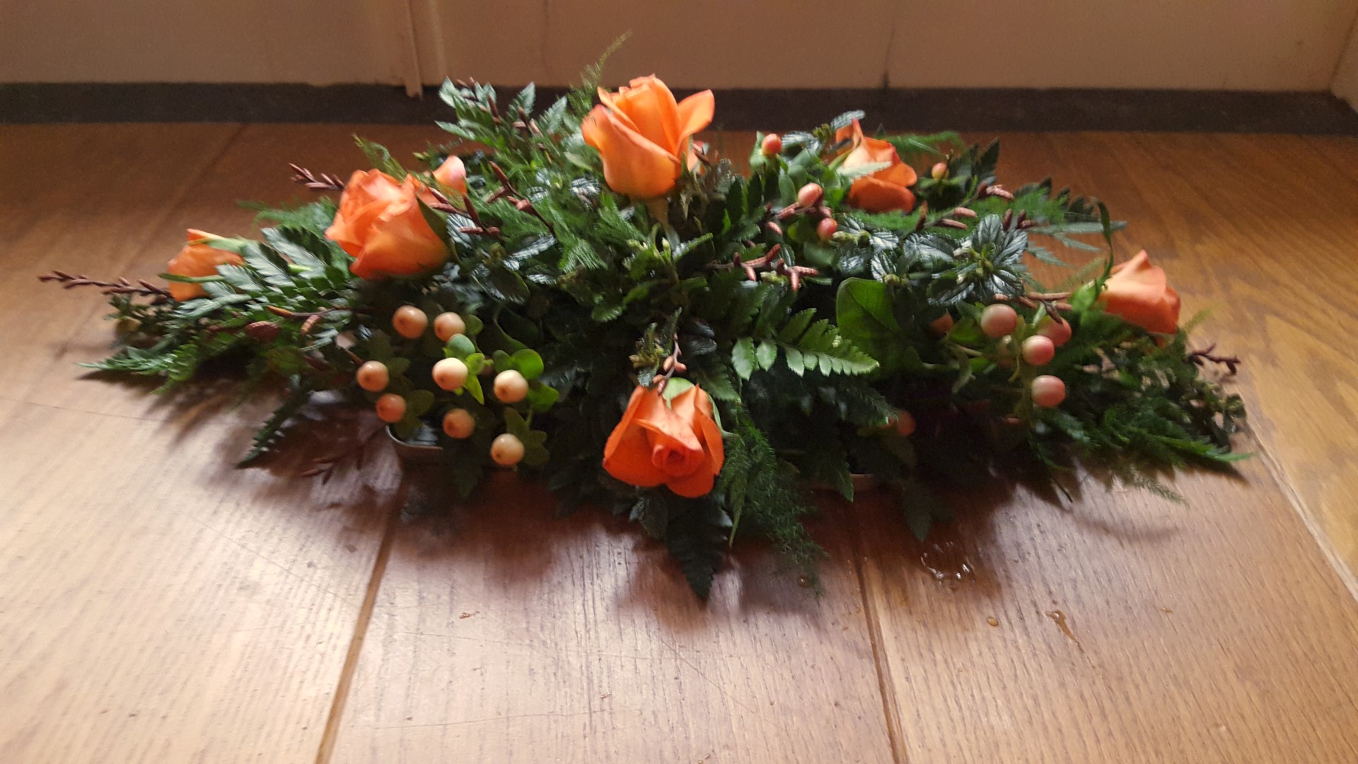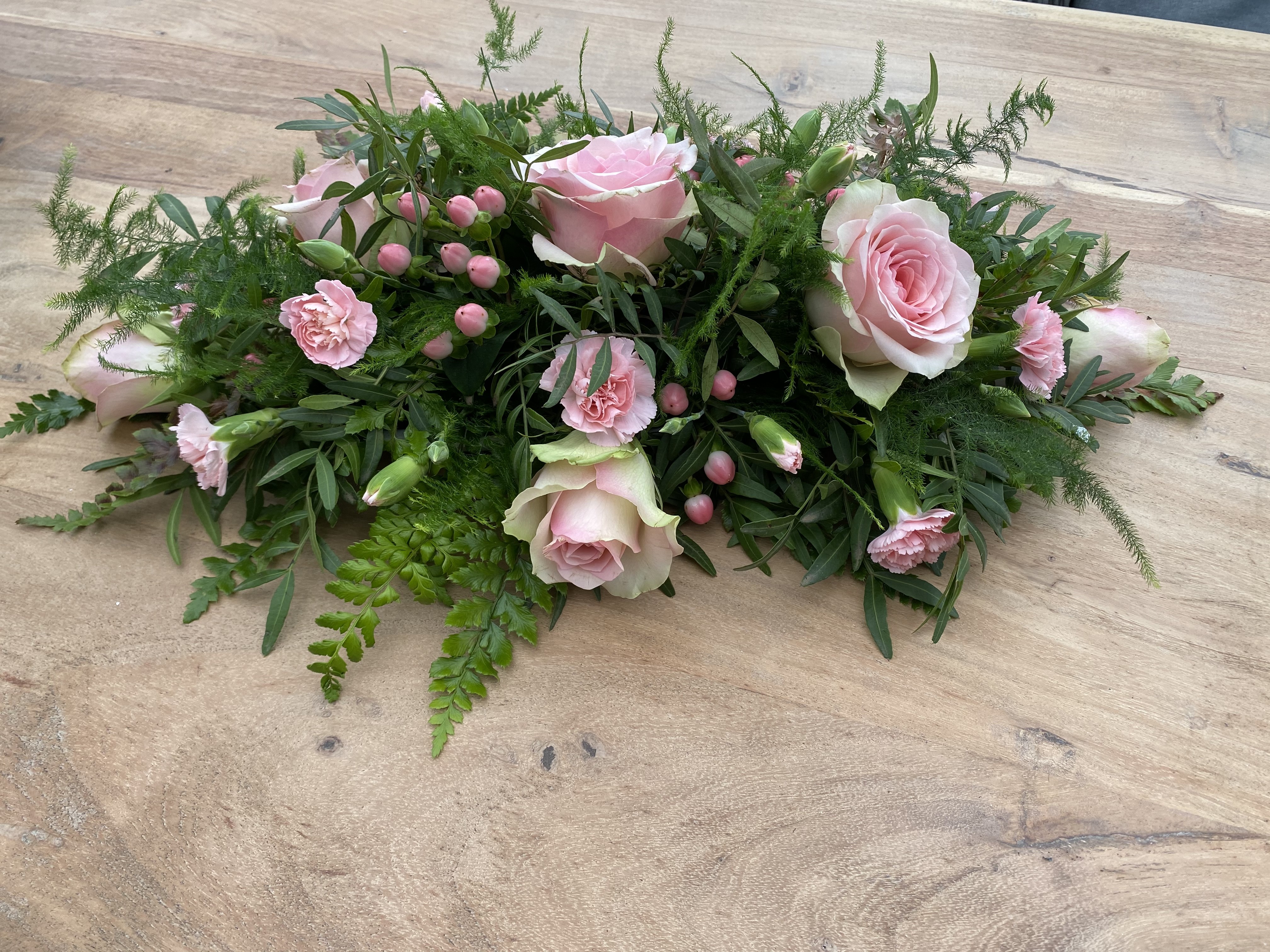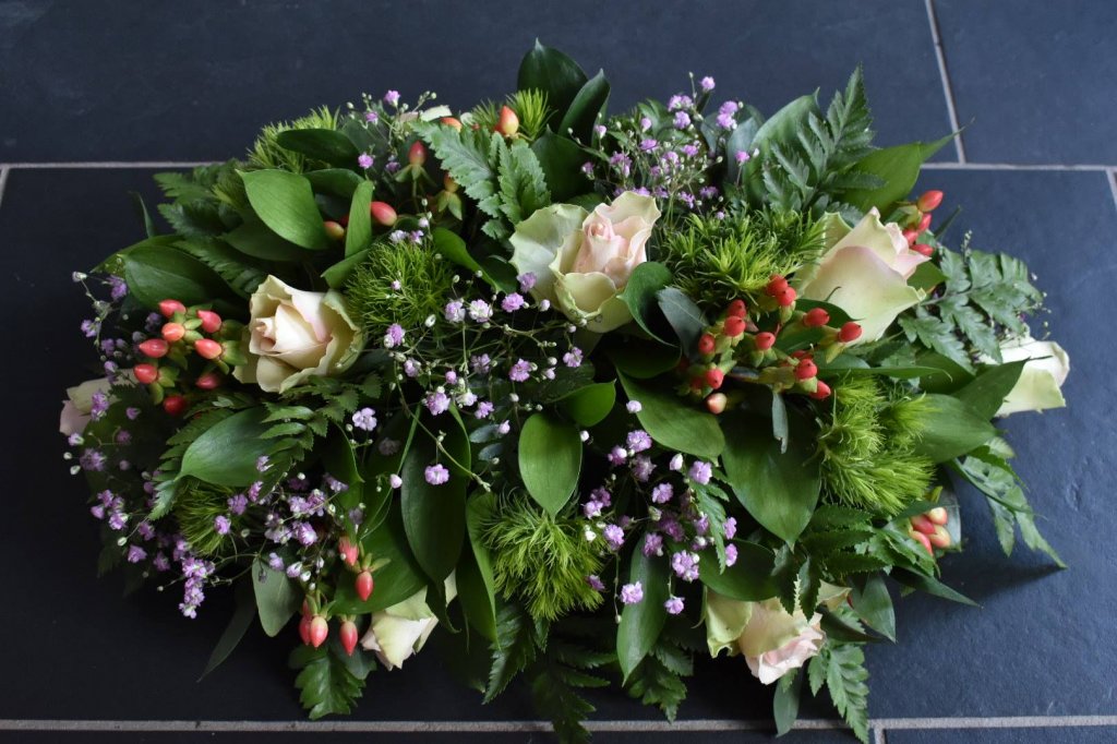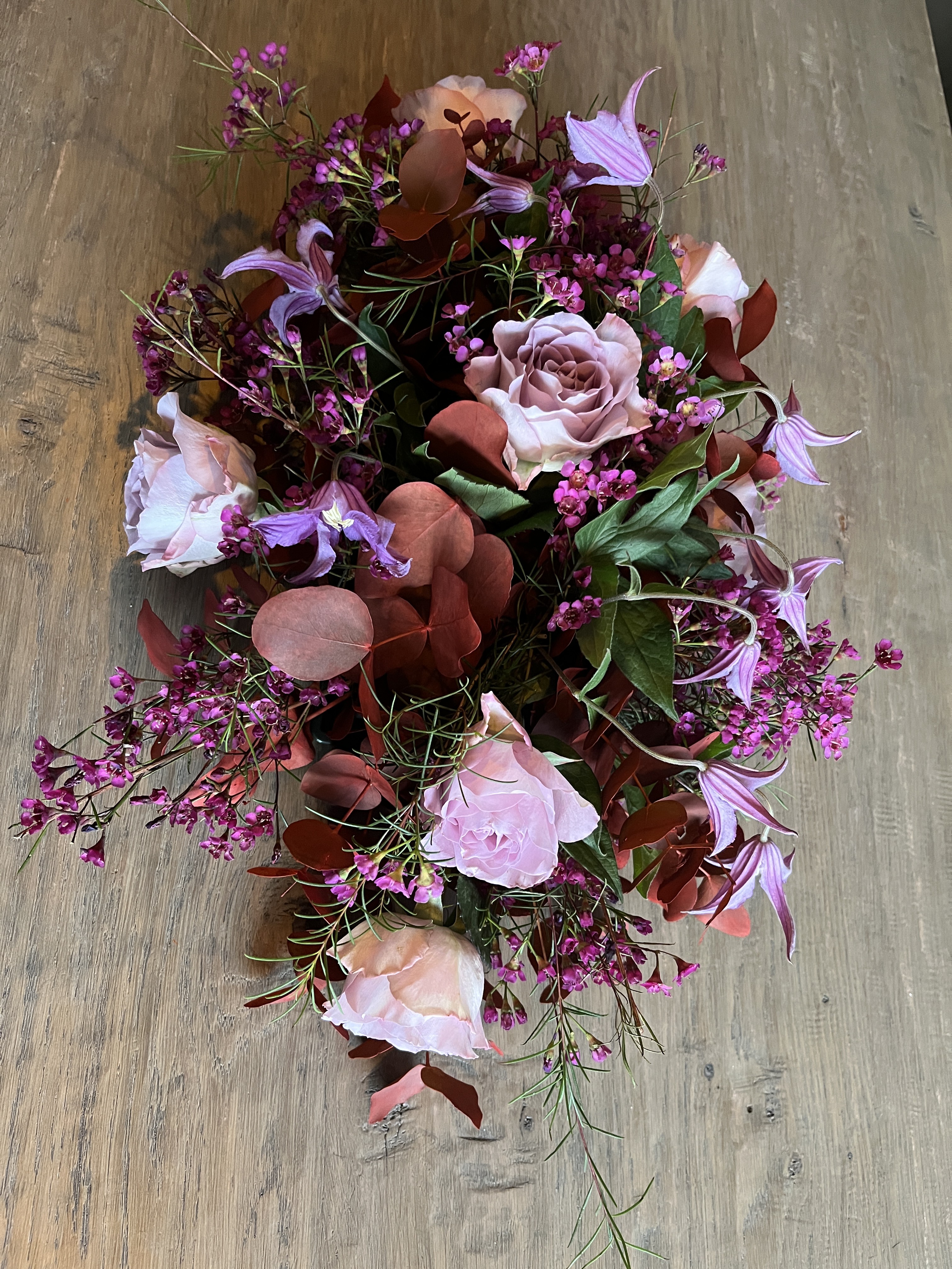 Met veel ervaring en een 'één meter oasishouder' kan je er in deze stijl ook een kistbedekking van maken.
