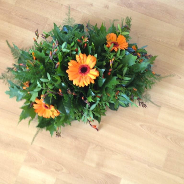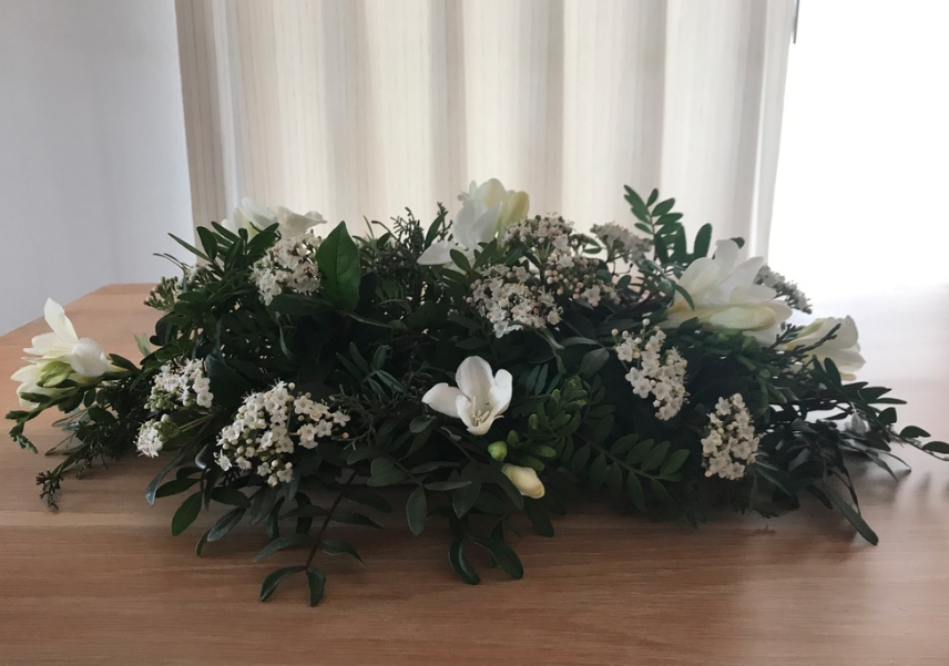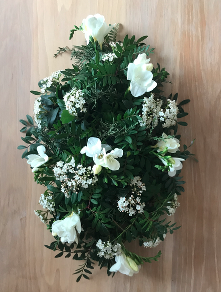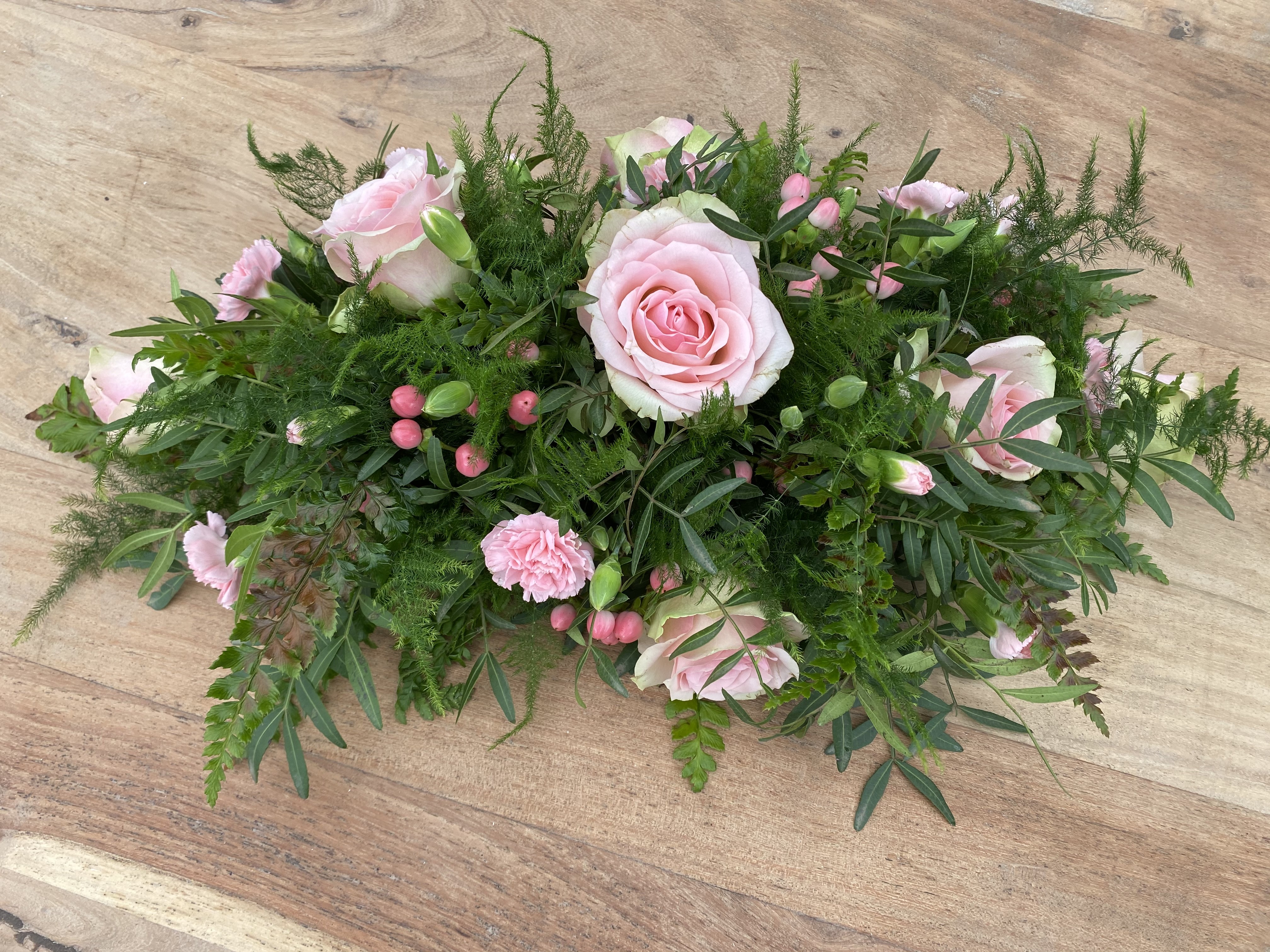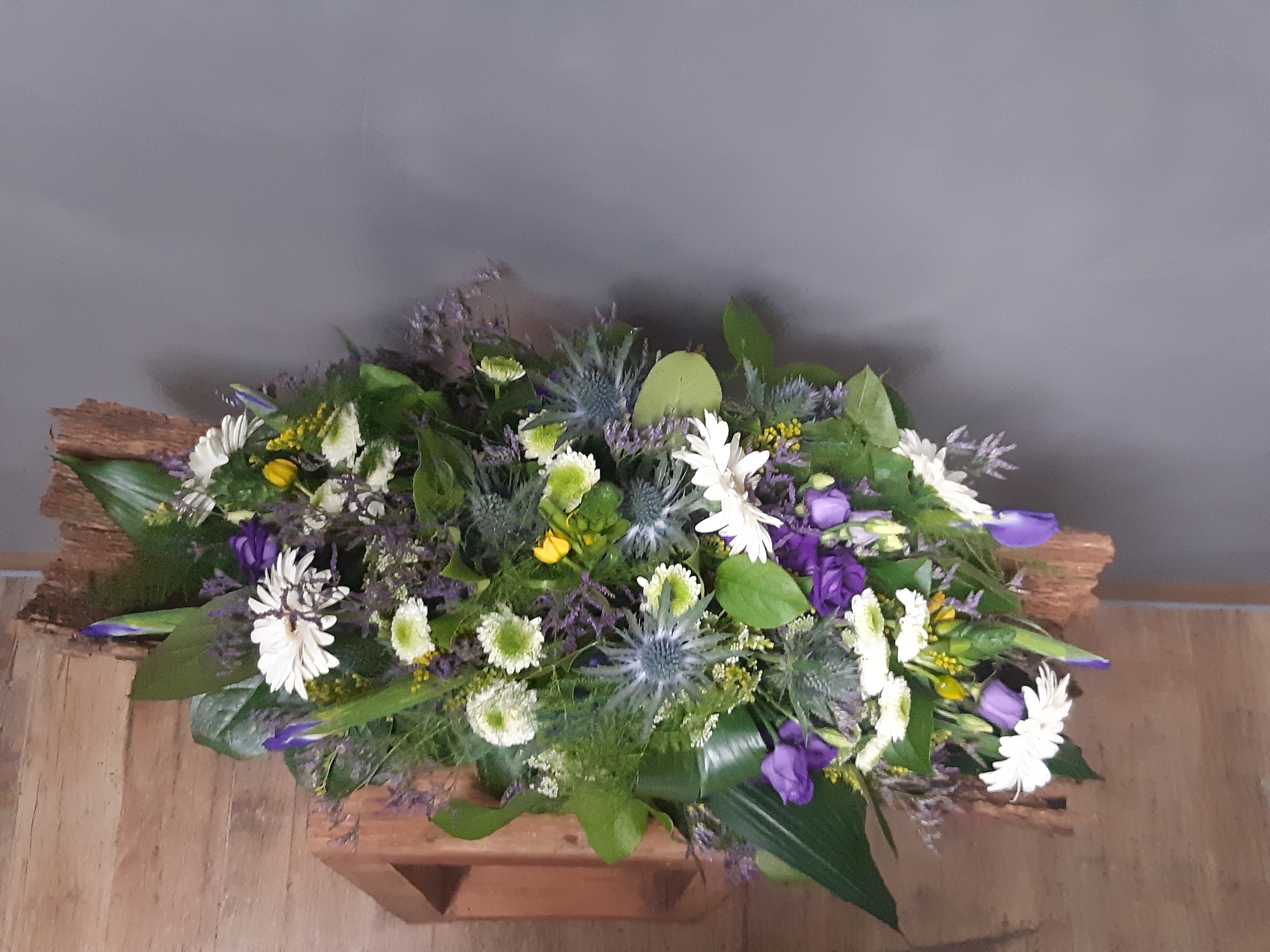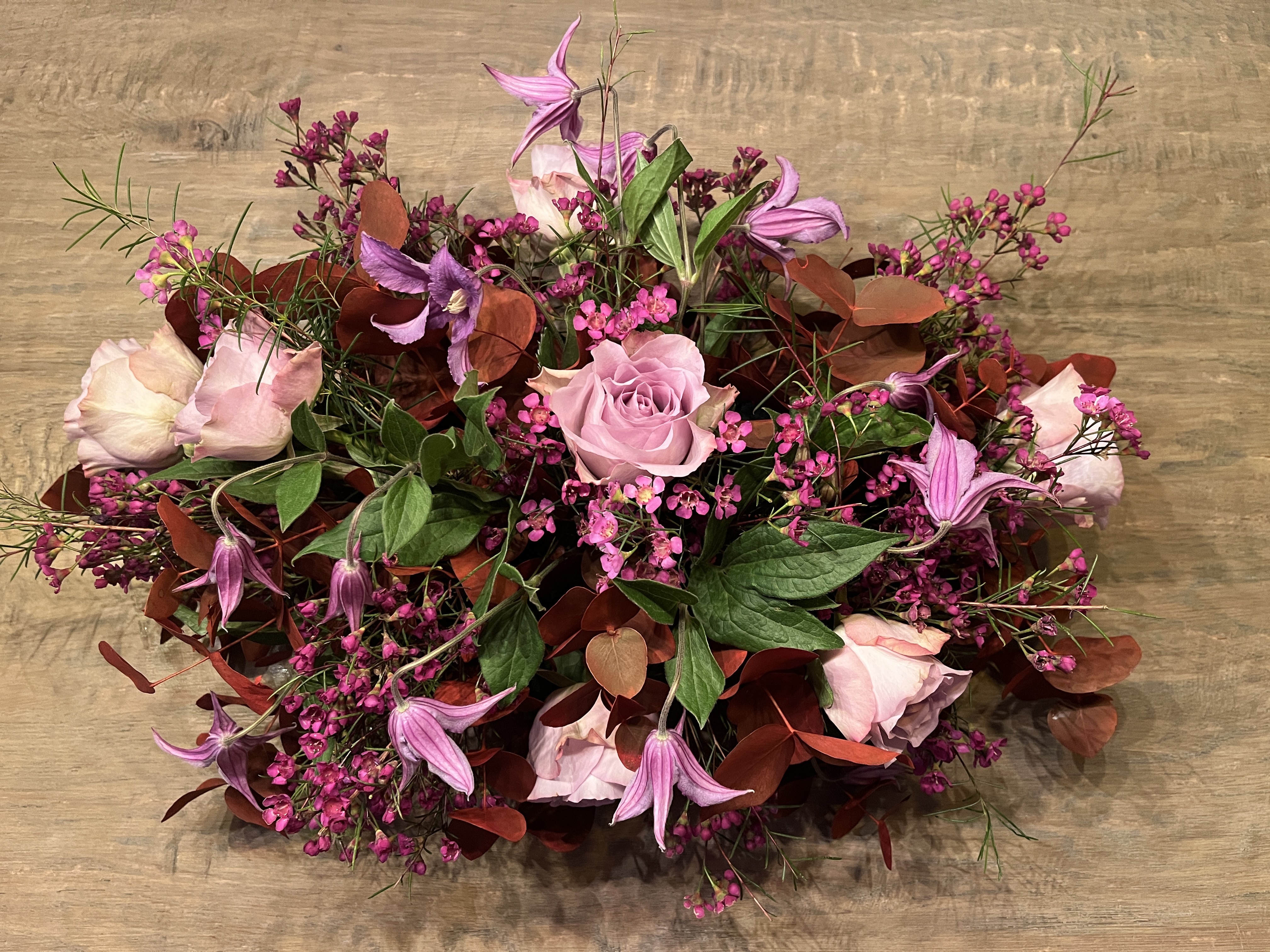 Met veel ervaring en een 'één meter oasishouder' kan je er in deze stijl ook een kistbedekking van maken.