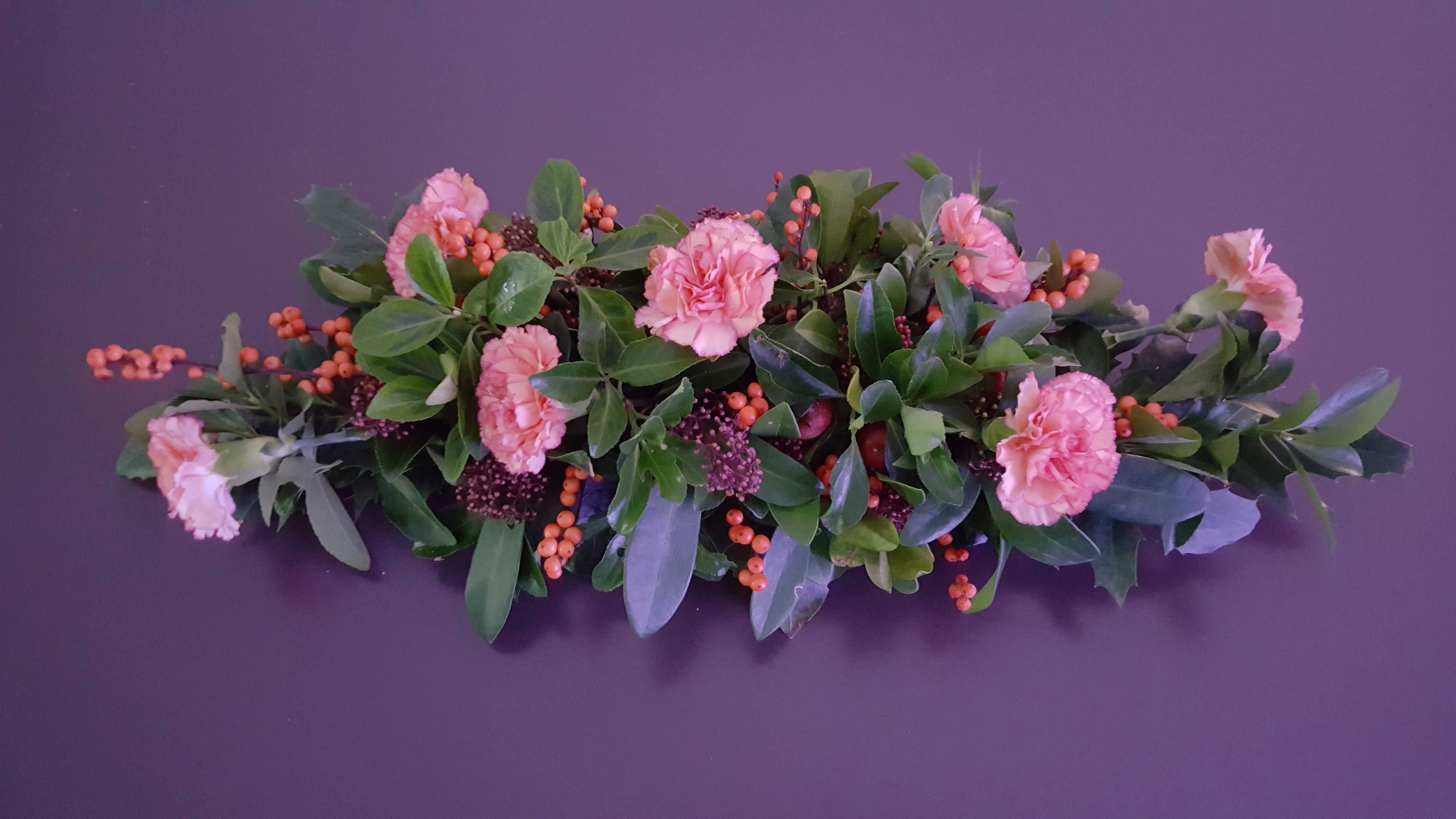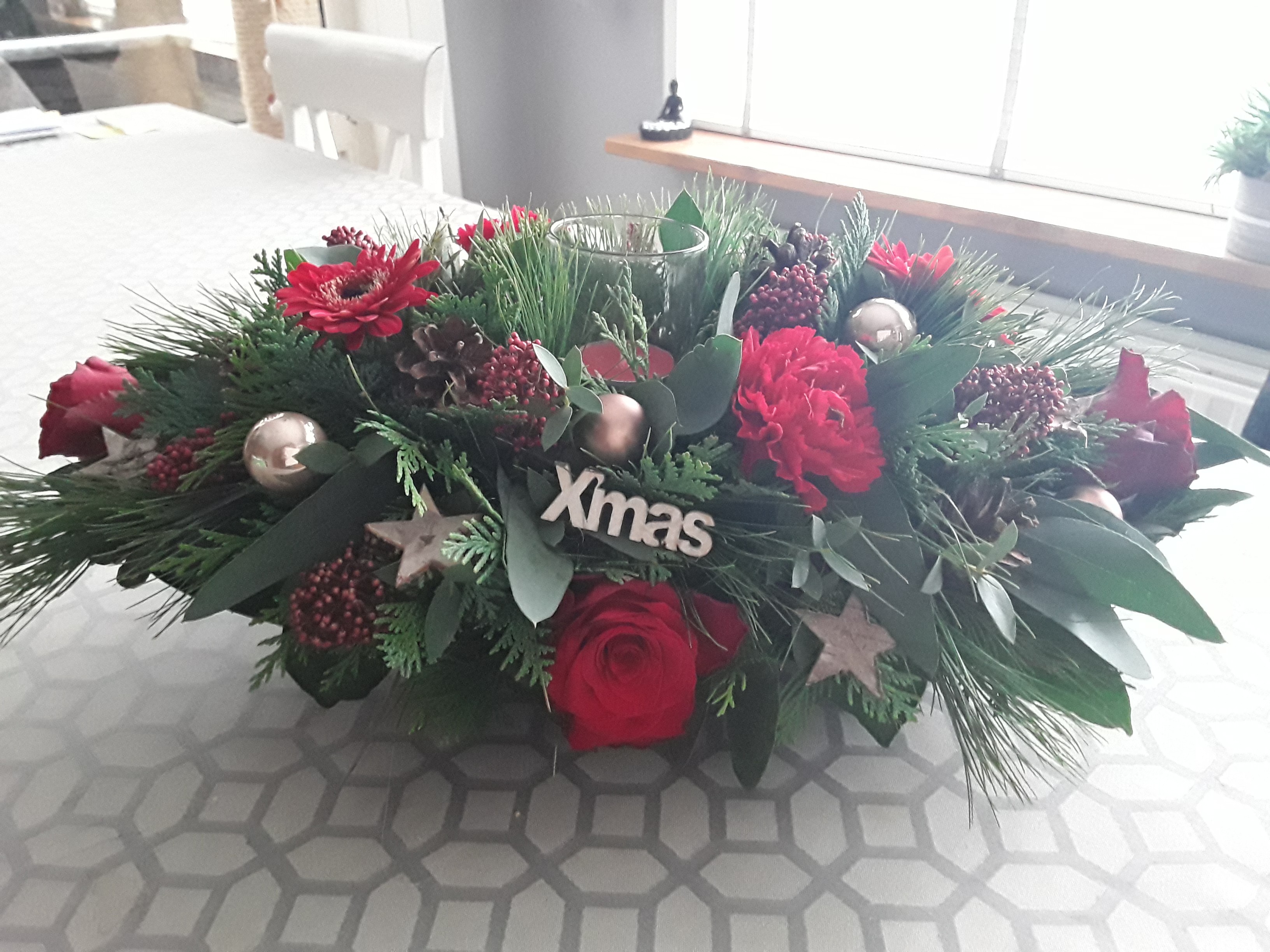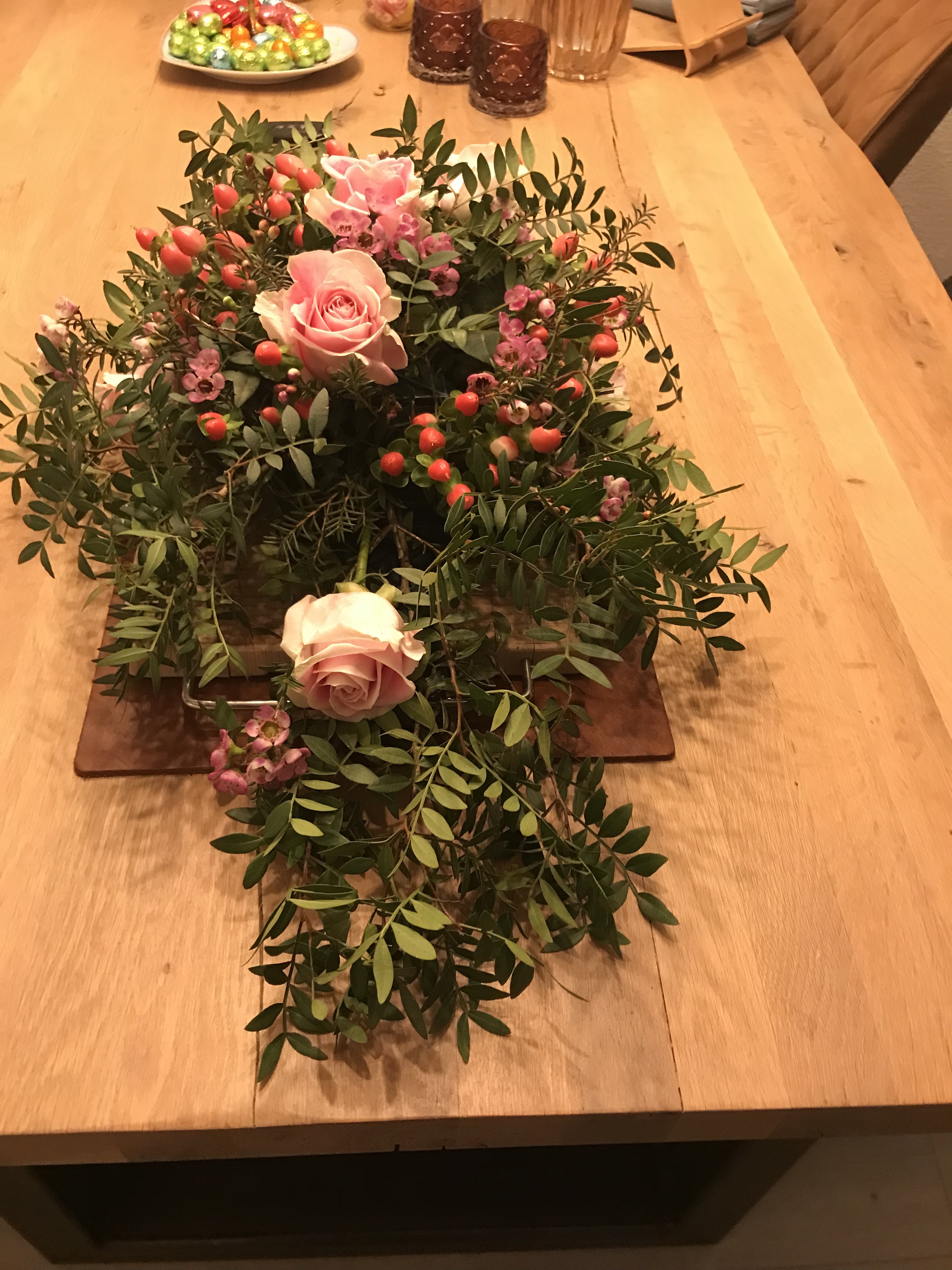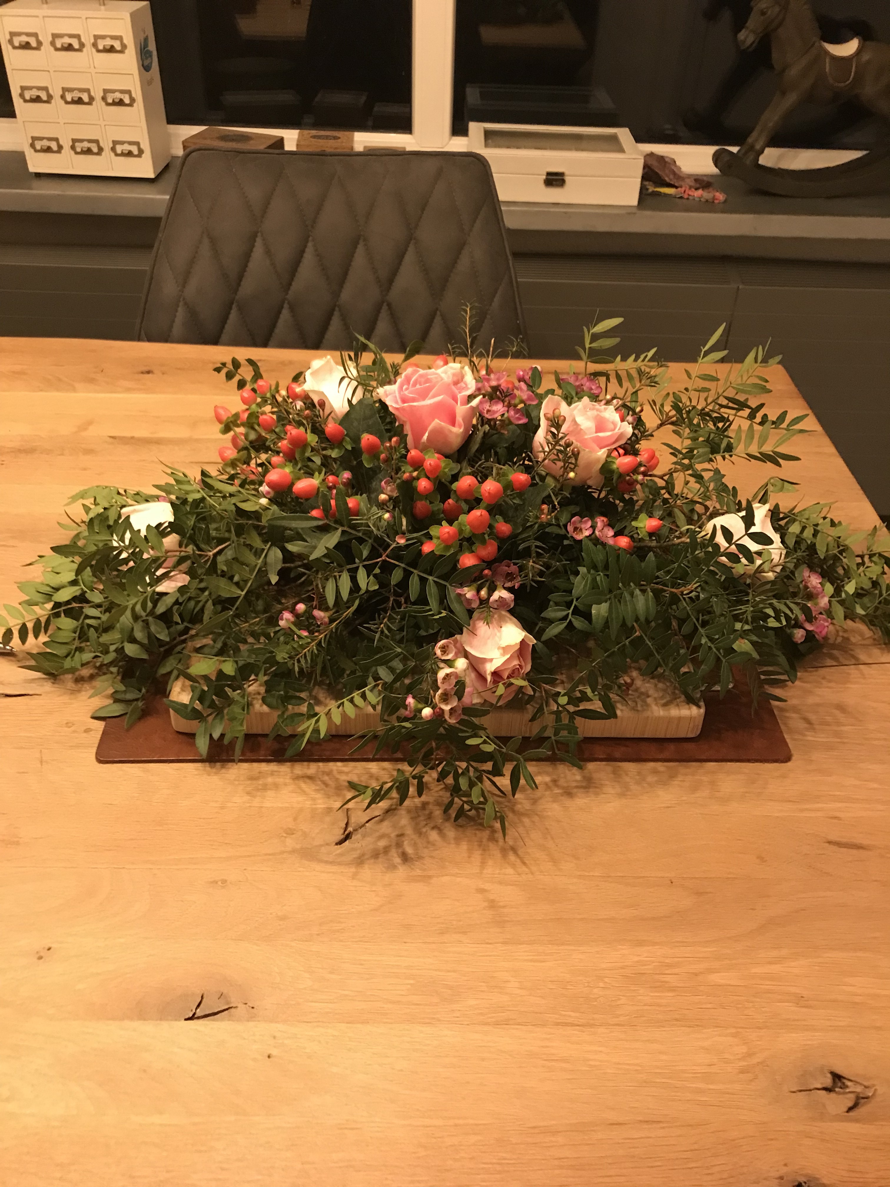 Je hebt zeker een vrolijk en lekker ruikend stuk op tafel staan. Ik ben er wel tevreden mee hoor. Je leert er toch weer van. De bloemen die je ervoor hebt gekozen zijn ook prima. Misschien kan je volgende keer Conifeer en rode of groene Beuk van buiten gebruiken. Die zijn vaak wel voorhanden.