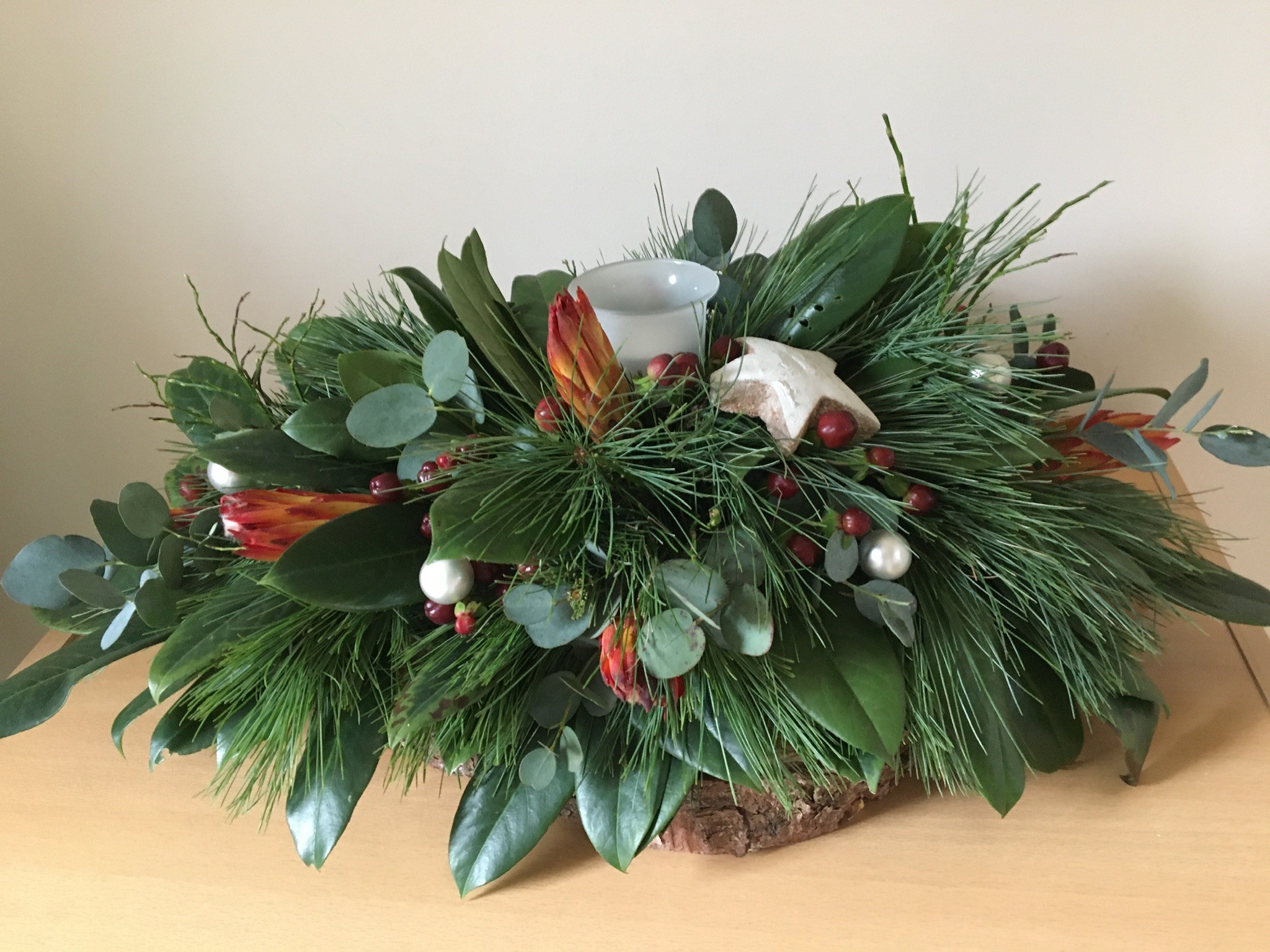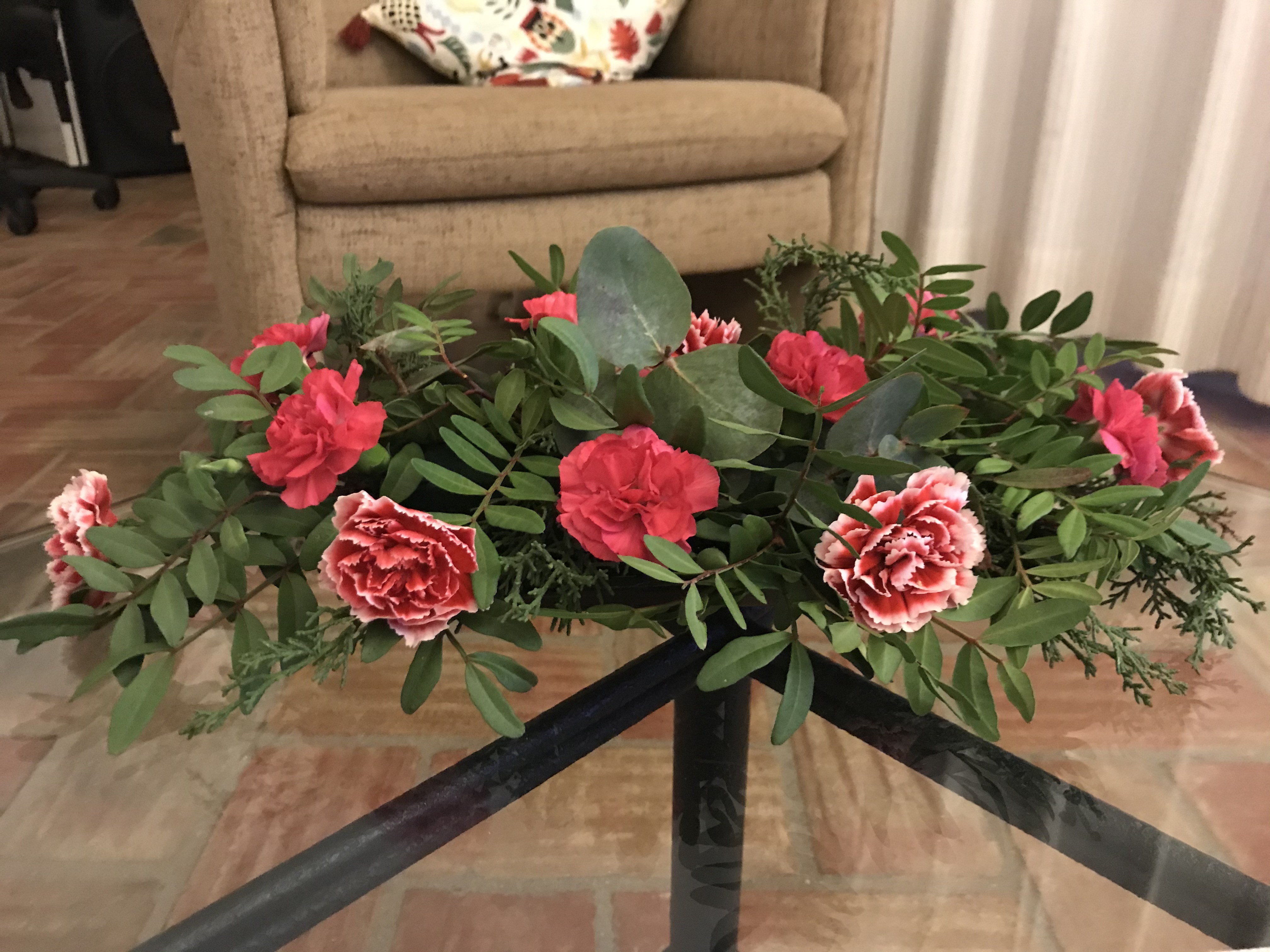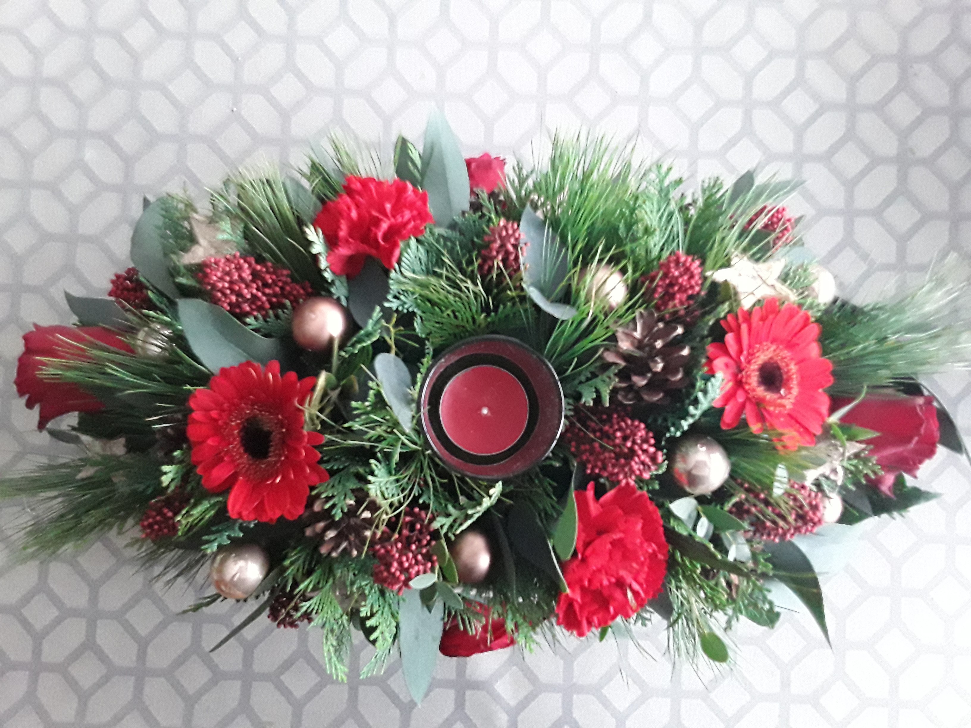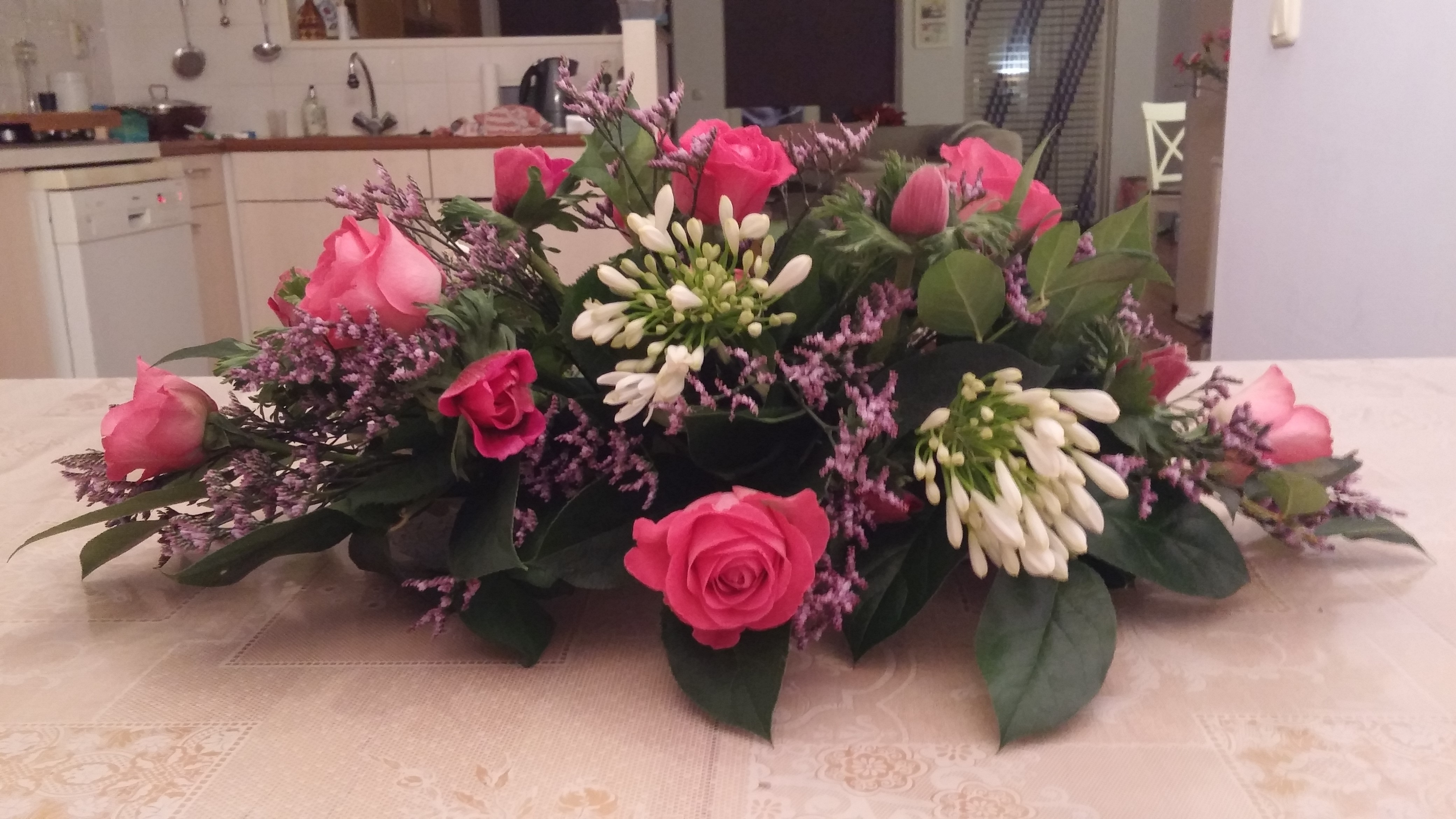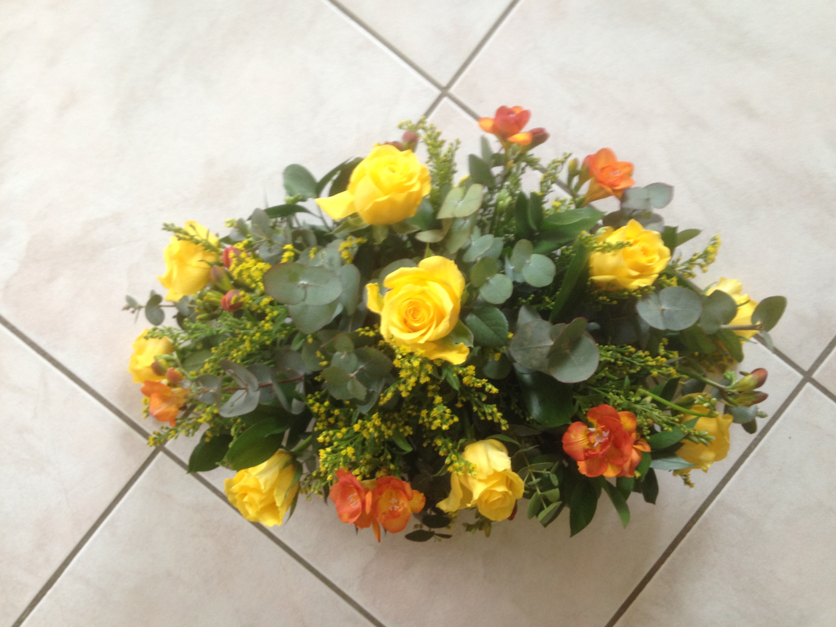 Je hebt zeker een vrolijk en lekker ruikend stuk op tafel staan. Ik ben er wel tevreden mee hoor. Je leert er toch weer van. De bloemen die je ervoor hebt gekozen zijn ook prima. Misschien kan je volgende keer Conifeer en rode of groene Beuk van buiten gebruiken. Die zijn vaak wel voorhanden.