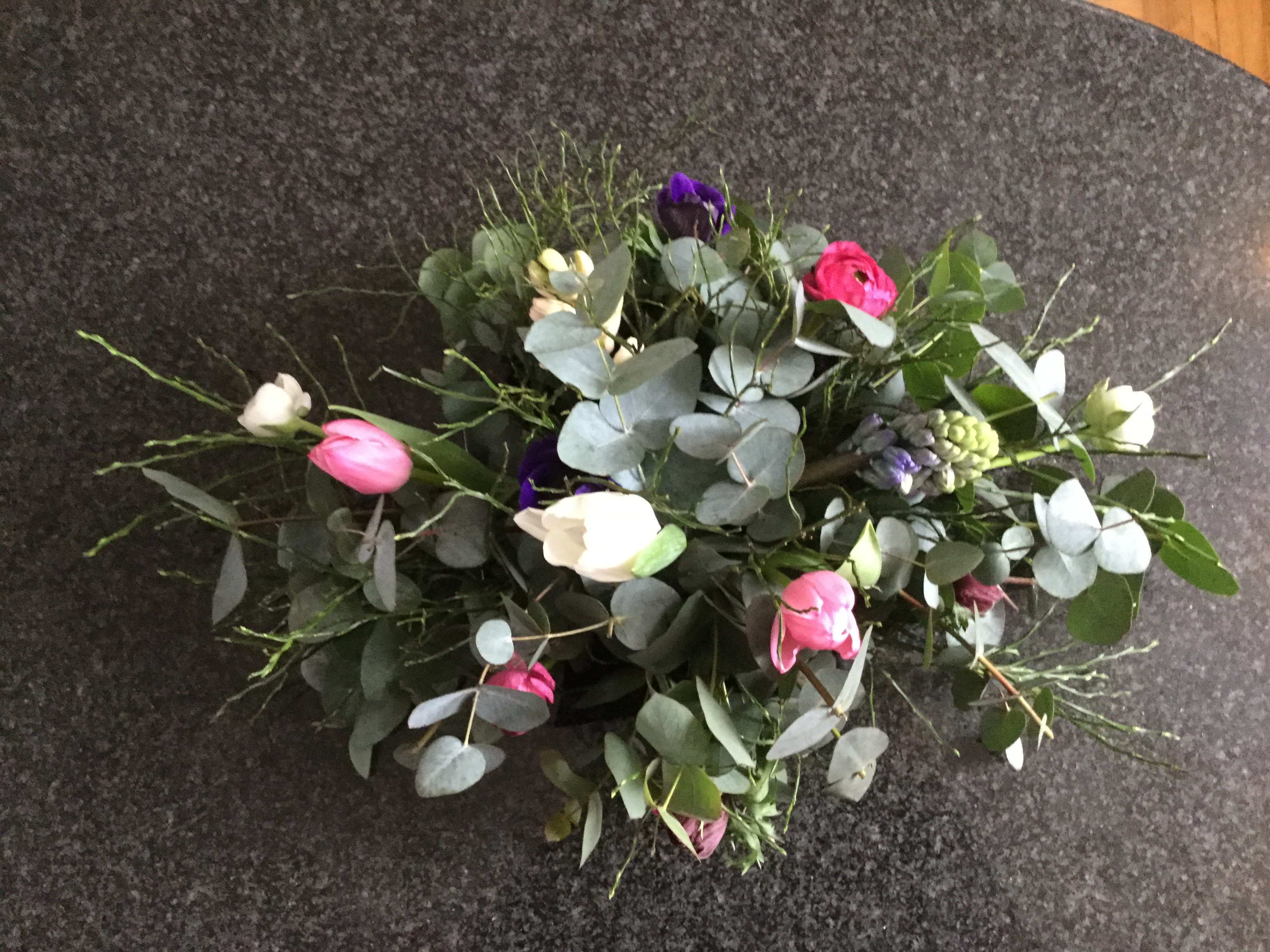 Dank je wel voor je foto. Ik vind het een mooi voorjaarsstuk geworden. Misschien is Eucalyptus wat rommelig om mee te werken, maar het kleurt wel erg mooi. Ik denk ook dat het prima gaat als je bloemen ook wat grover zijn of wanneer er wat meer zijn. Dan vallen ze iets meer op. Je hebt vast elke dag weer van je stuk genoten, want alles groeit erin.