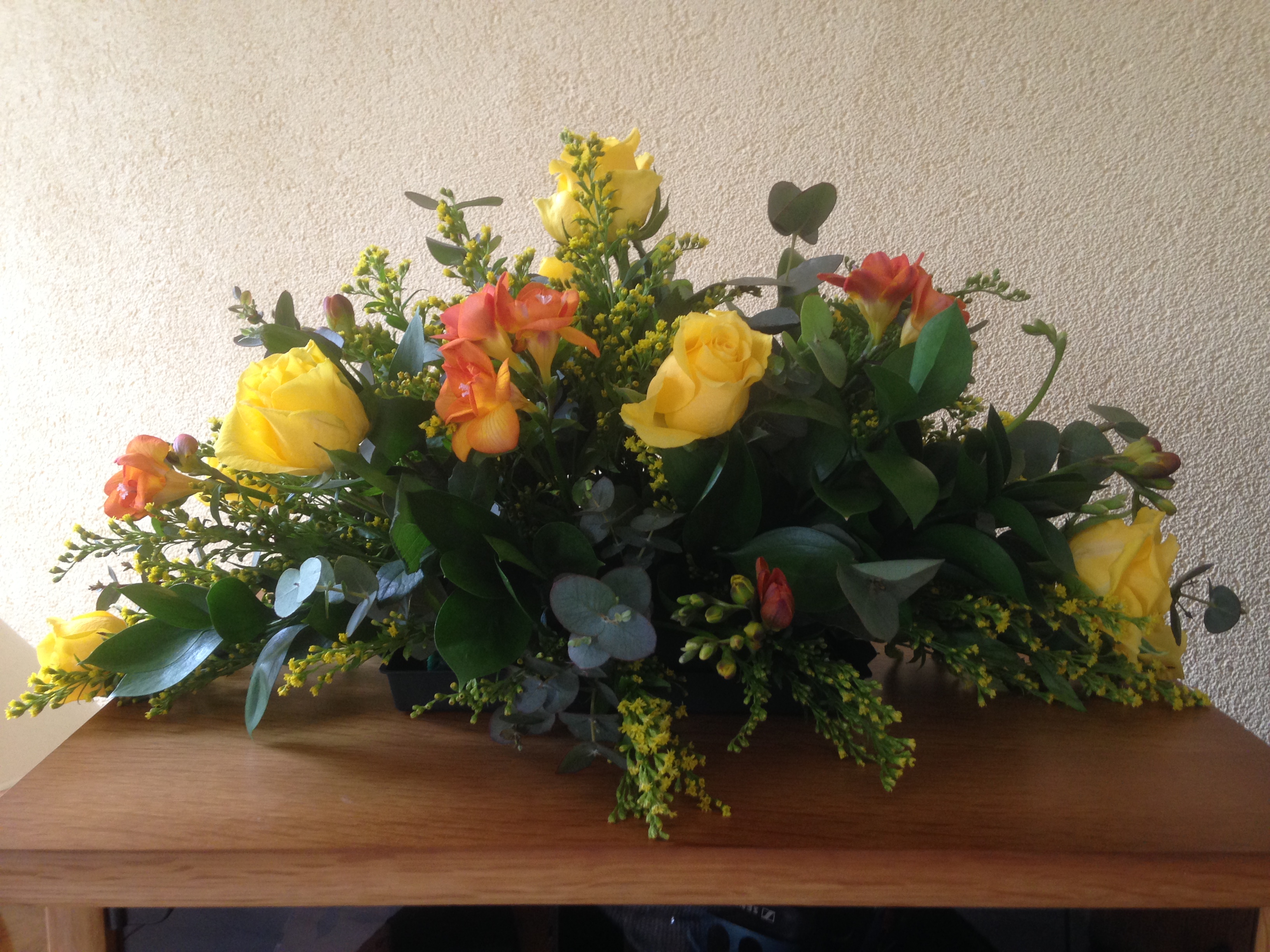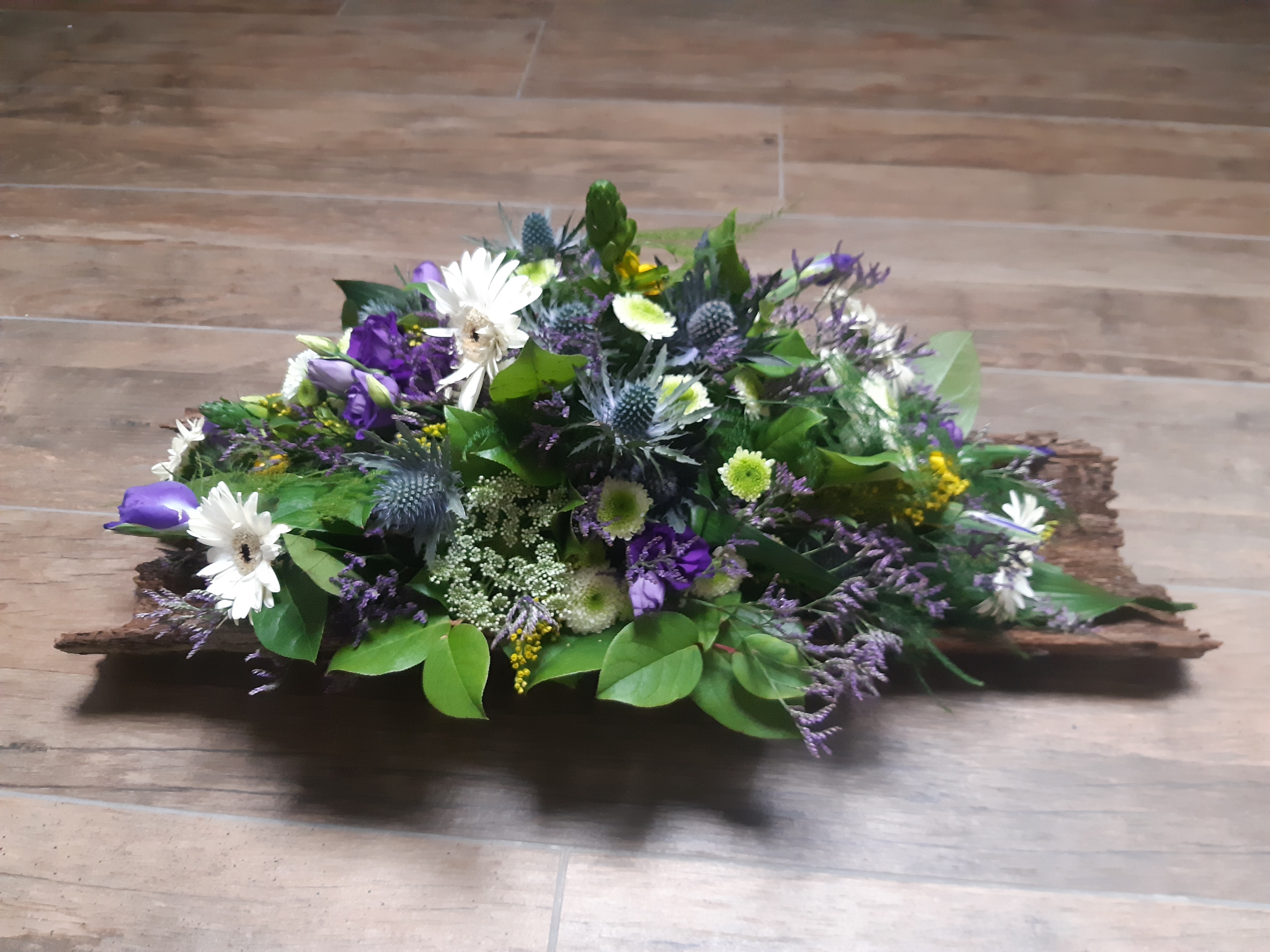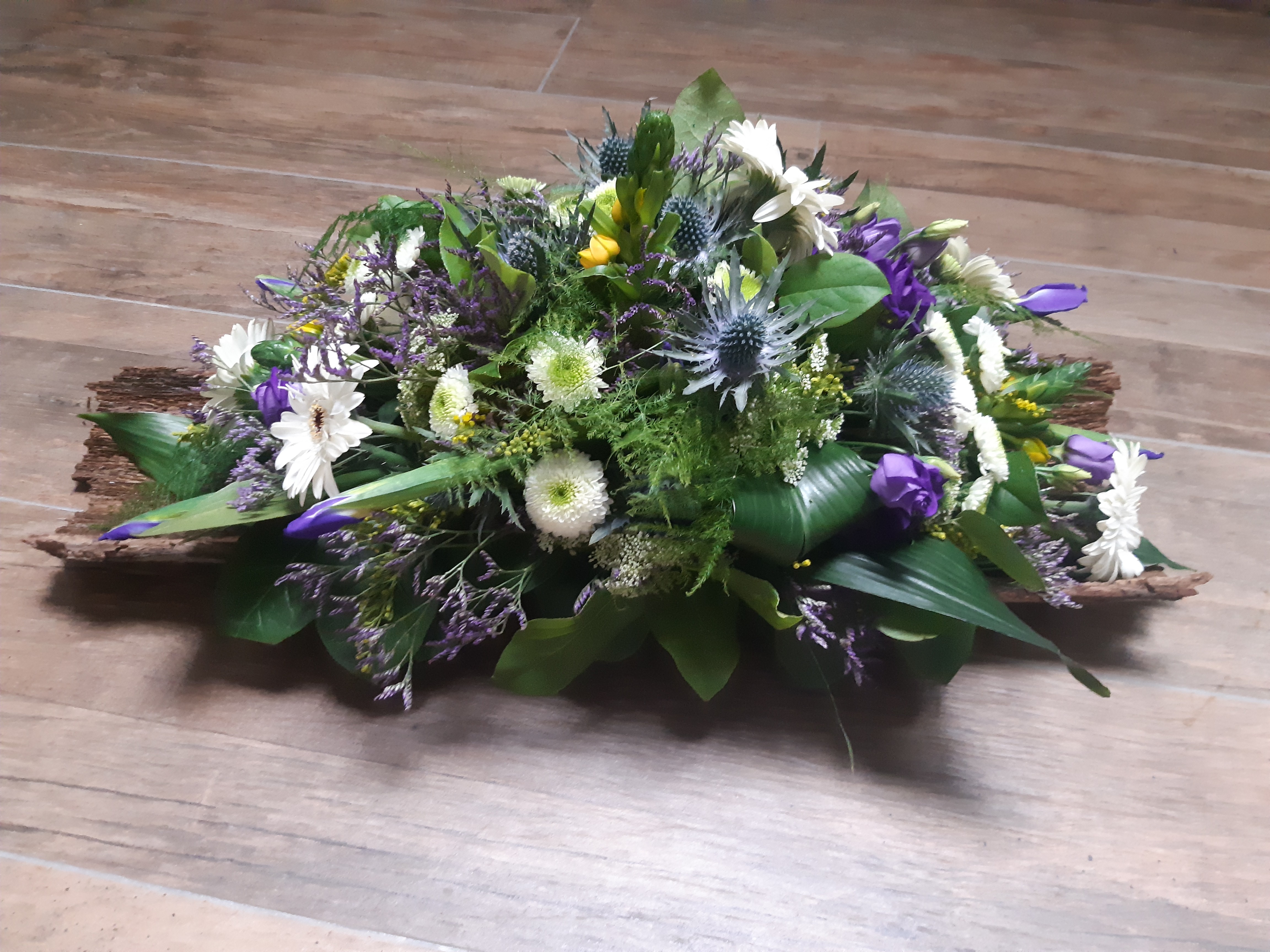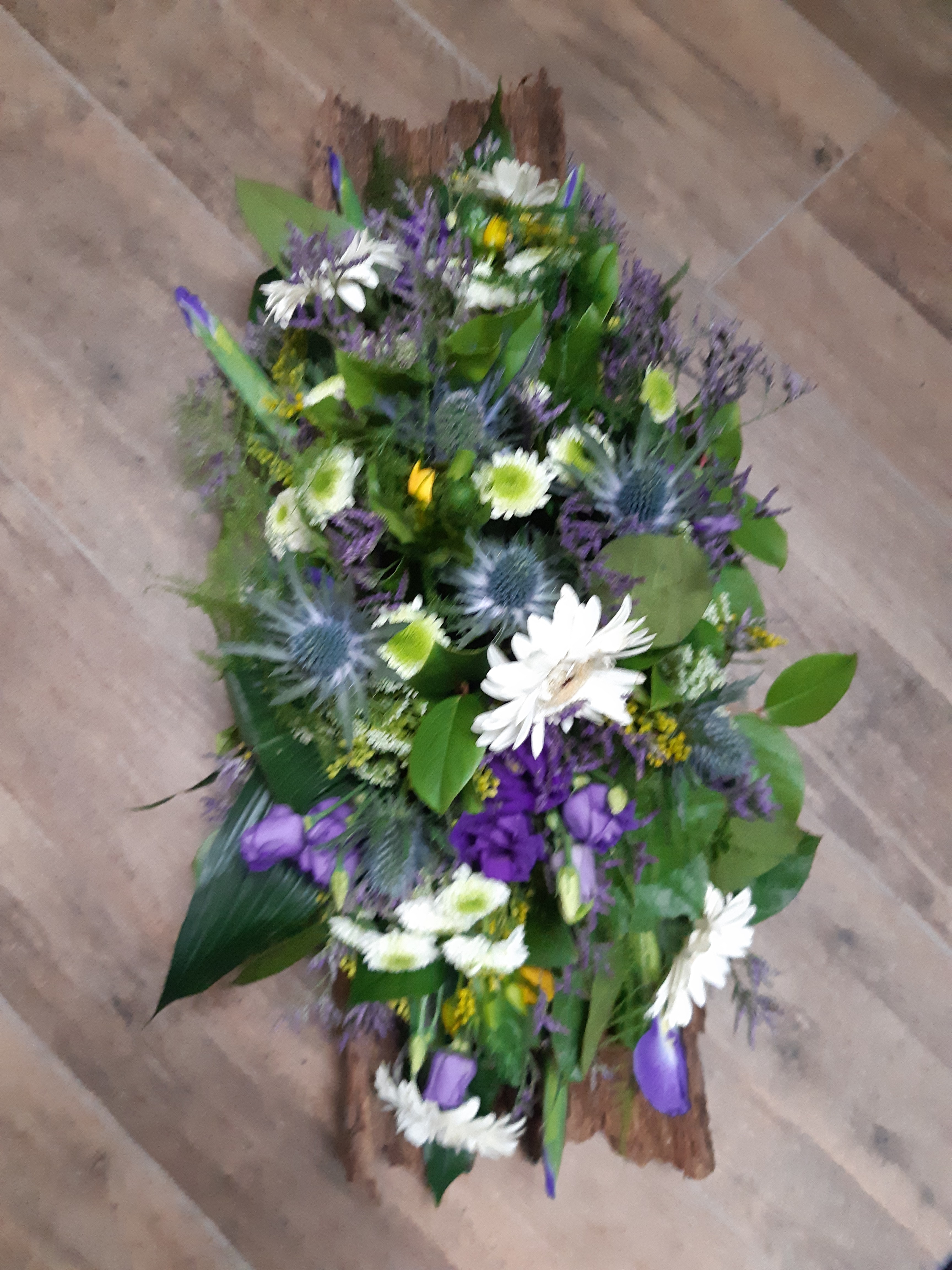 Hierbij een rouwarrengement gestoken in oase, dat gemaakt is op een frame van boomschors met daarop vastgelijmd ( stevig) een oasehouder. De persoon voor wie dit gemaakt is wilde graag witte, gele en blauwe bloemen verwerkt. Gezien een korte voorbereidingstijd waren dit de enige bloemen die ik gevonden kreeg die voldeden aan de wensen van de persoon. Hopelijk gaan de Iris en Zuiderzeewind mooi open. Heb je tip/ tops voor me? Ik hoor ze graag zodat ik die voor een volgende keer kan toepassen.
