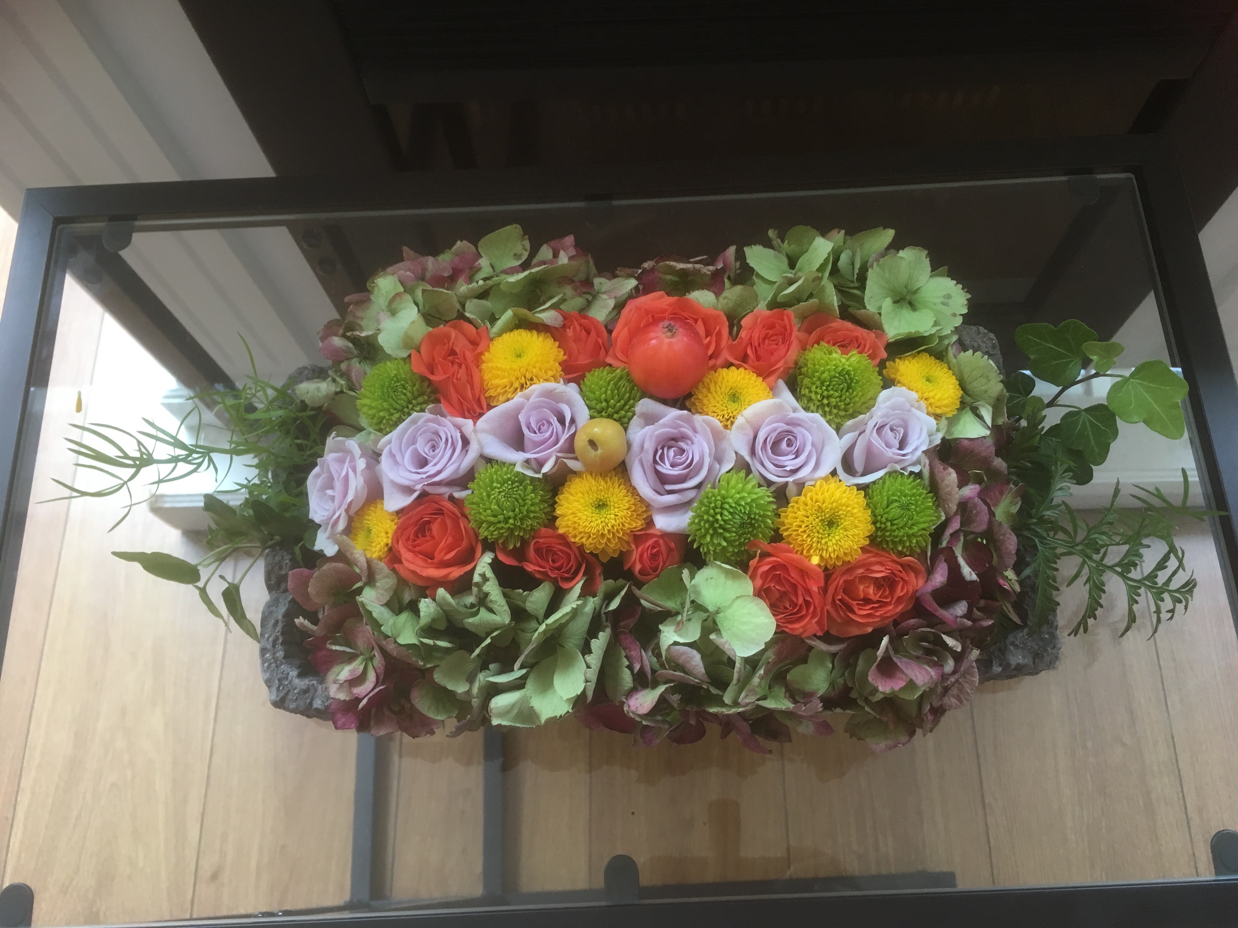 Hoi Nicolle, Het was spannend om een groter stuk te maken. Ik heb de verdeling van de hoofdbloem, de rozen als blikvanger heel klassiek gehouden op een basis van conniferengroen. Om er toch wat speelsheid in te brengen de tussenruimtes opgevuld met verschillende soorten bloemen, zoals herfstasters in wit, Statice in wit, lila en donkerpaars, hortensia, Hemelsleutel, bloemhoofdjes van de Rudbeckia enz. Ik verkeek me alleen op hoeveel werk het groen opsteken was. Drie kwartier. Maar het resultaat is nu na drie dagen nog steeds mooi. Hoewel ik zie dat een enkel wit herfstastertje al aan het verwelken is. Hmmm. Ik heb de gastheer laten weten dat hij een gil mag geven als de rozen verwelkt zijn, dat ik ze dan ga vervangen (door een droogbloem). Maar ik weet eigenlijk niet of dat wel zo'n goed idee is.... Het zou fijn zijn als men wat langer dan 7 dagen van dit stuk kan genieten.... Heb jij tips, Nicolle? Groetjes Monique