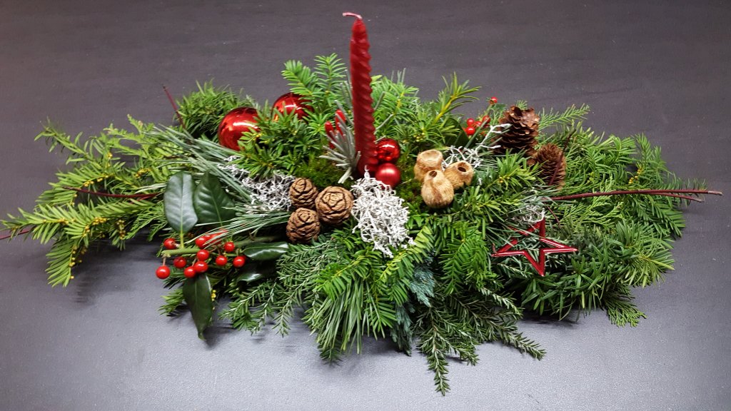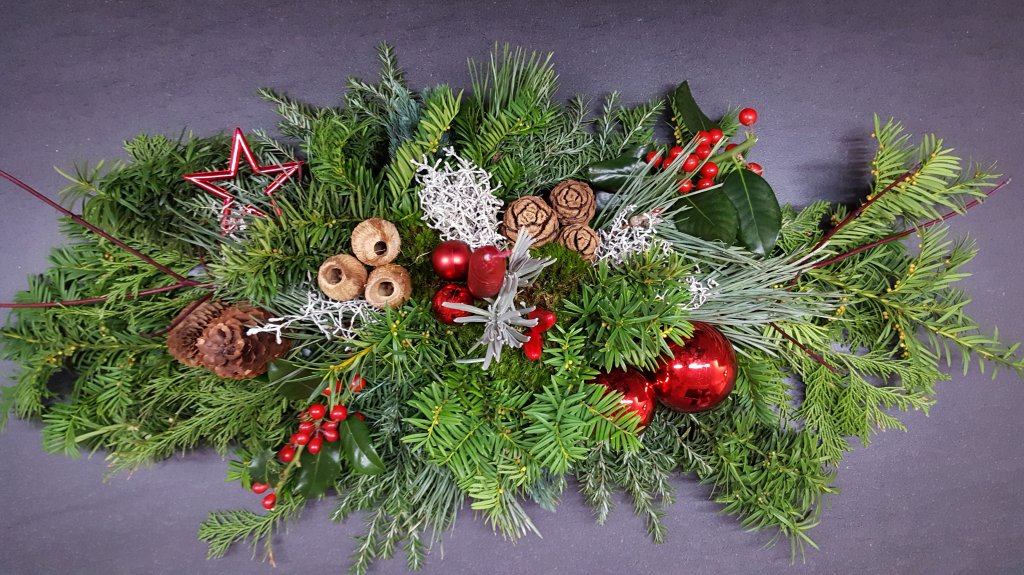 Wat een goed idee van je om met dezelfde materialen ook nog een klassiek tafelarrangement te maken. Ik vind hem mooi, maar voor deze heb ik eigenlijk dezelfde tip als bij de krans. Probeer rechte lijnen te voorkomen, want dat ziet er sneller onnatuurlijk uit. Werk om en om met hetzelfde materiaal dan krijg je een mooie verdeling.