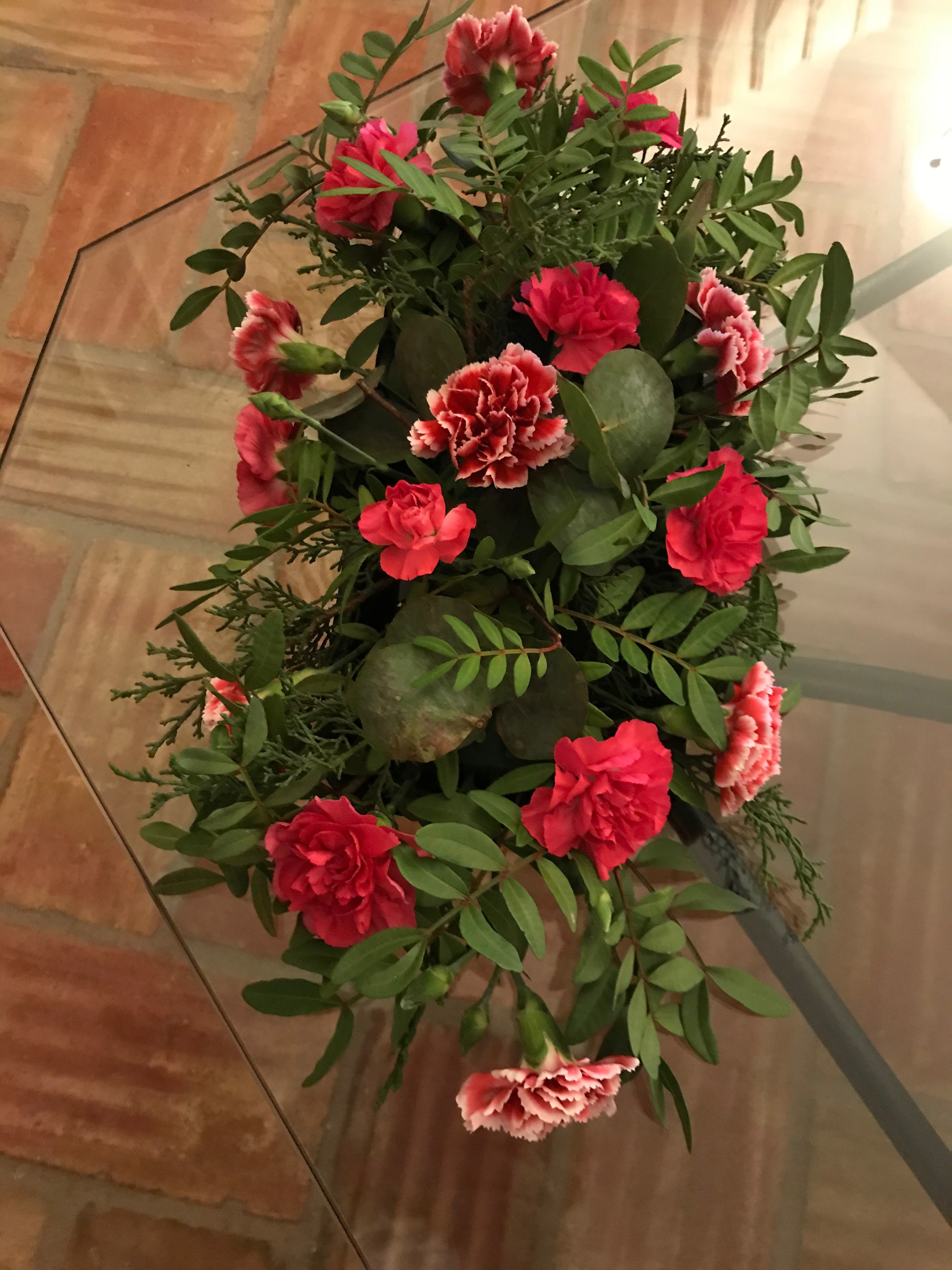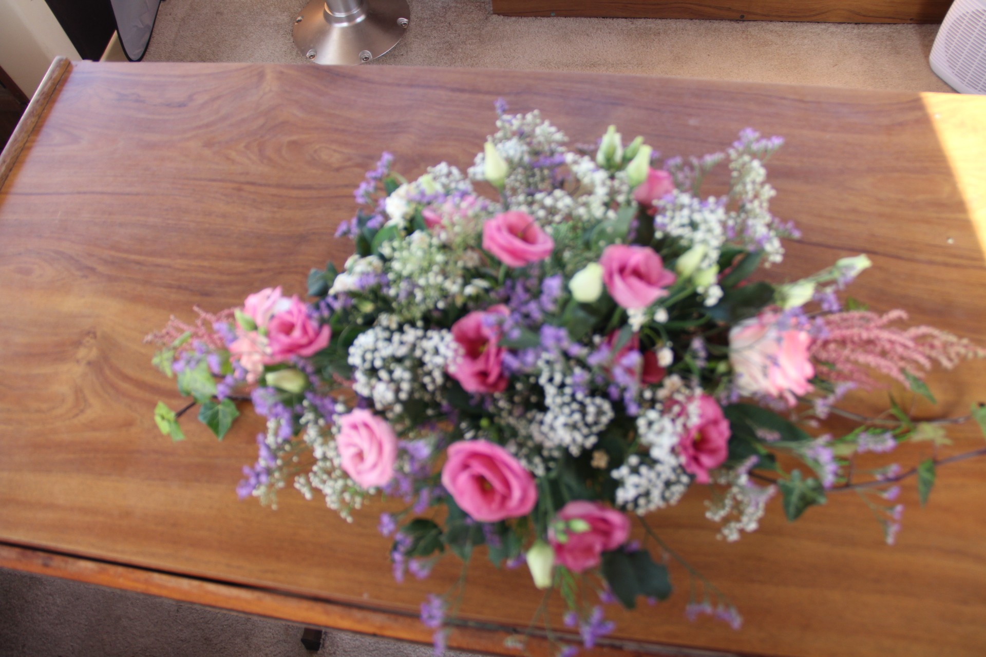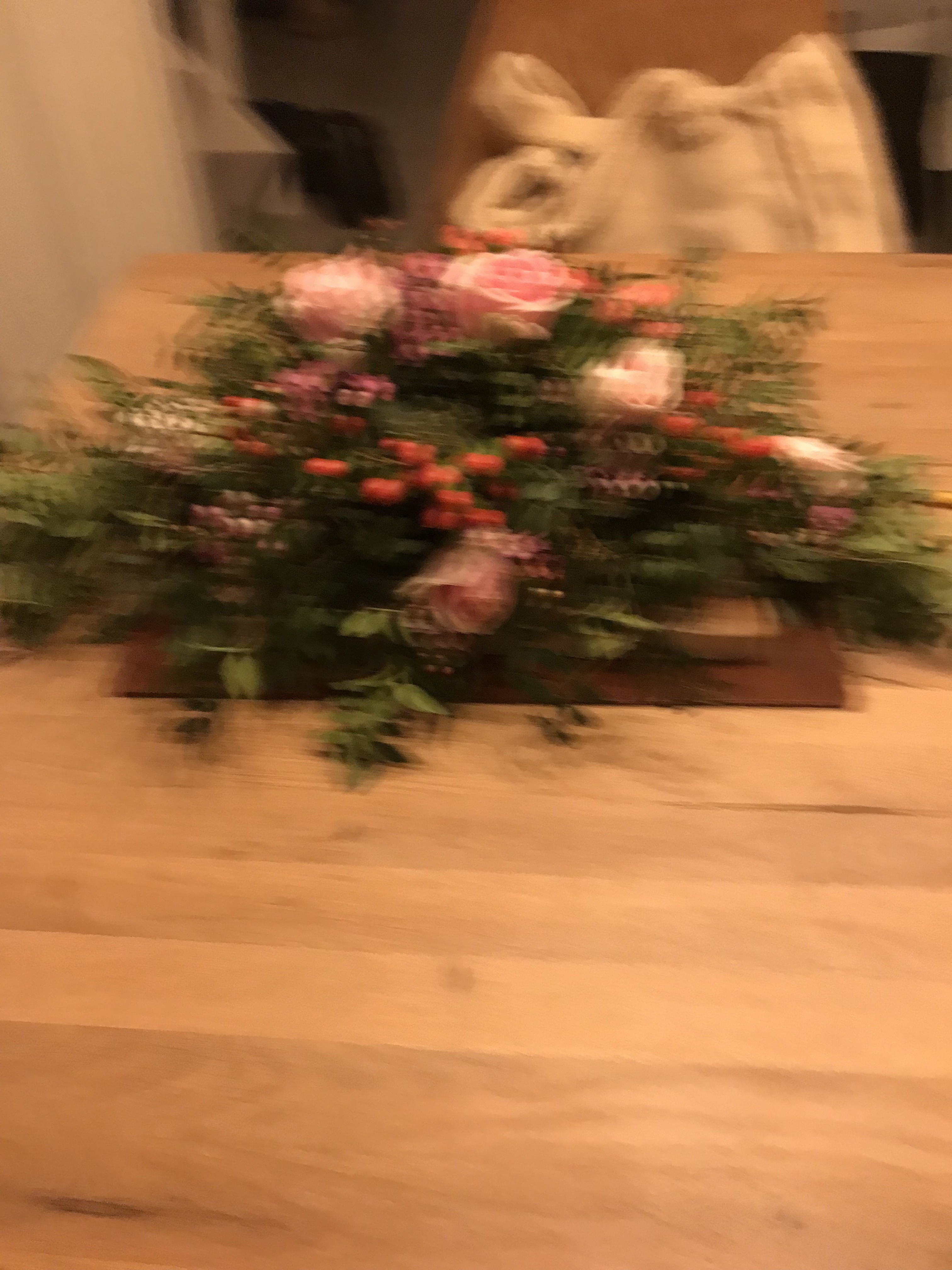 Ik vind persoonlijk wel dat je Lelie's iets te veel uitsteken. Nou zou je de rest allemaal langer kunnen steken (de Lelies kunnen niet korter), maar het had ook één materiaal kunnen zijn, bijvoorbeeld je Eucalyptus dan was het stuk nog wat losser en speelser geweest ook als de Lelie's open gaan. Het is maar een tipje. Het is ook zo een heel mooi stuk en je vader zou vast trots op zijn gewwest dat jij dat hebt gemaakt!