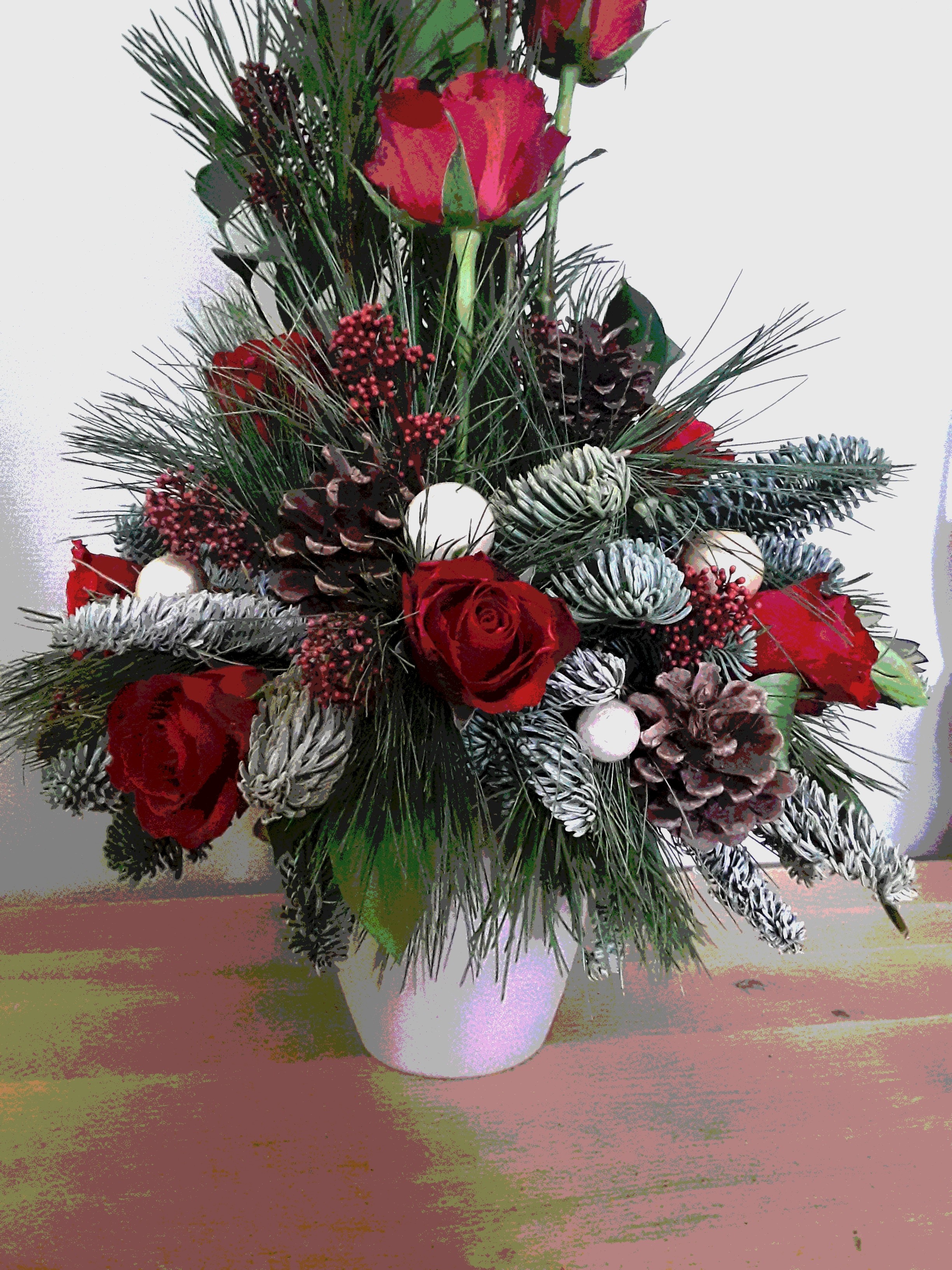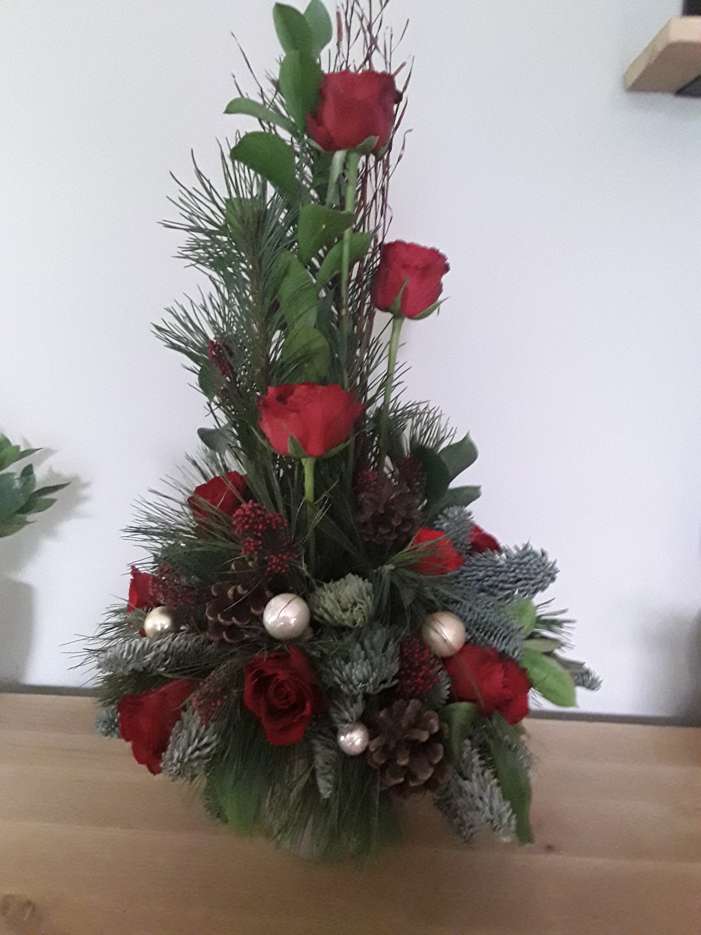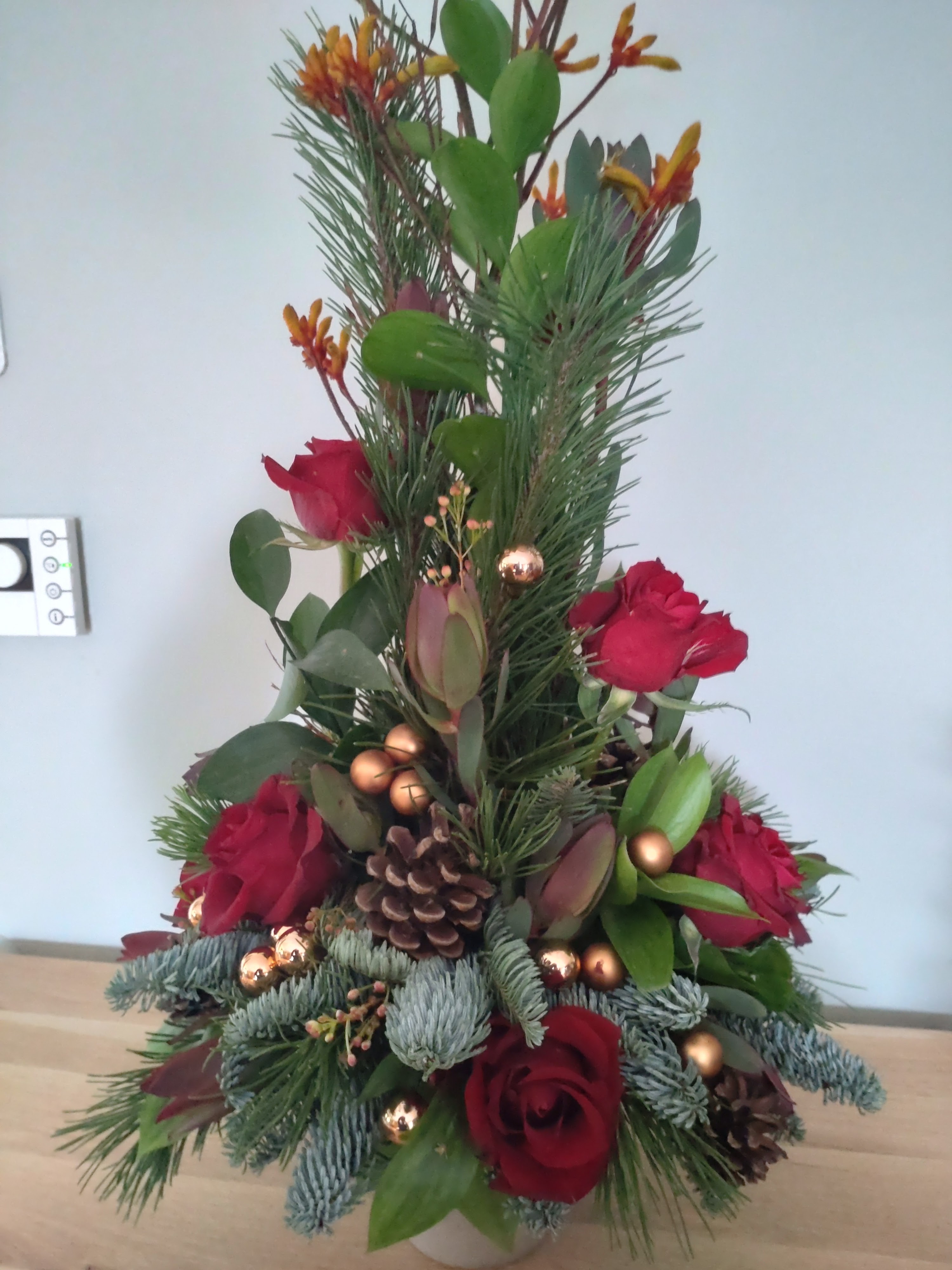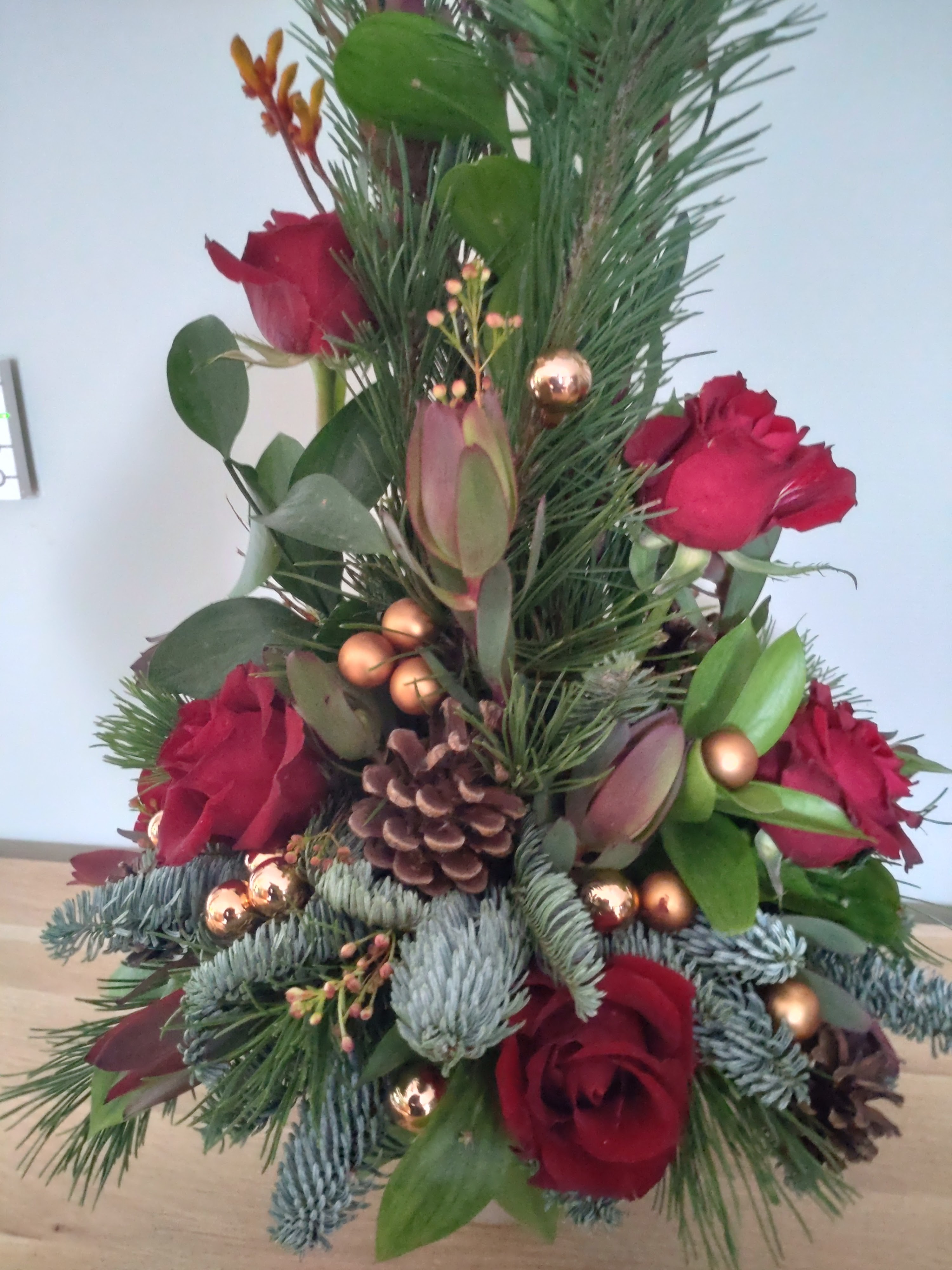 Je zou katjes en Cornus in de hoogte kunnen gebruiken en wat (bonte) Hulst geeft je misschien nog iets meer kerst gevoel. Grijze Kochia en tros Anjers zijn er ook mooi in. Ik hoop dat ik je nog wat inspiratie heb kunnen geven. Je maakt heel mooi bloemwerk, ga lekker zo door. Hele fijne feestdagen en een bloemrijk 2024!