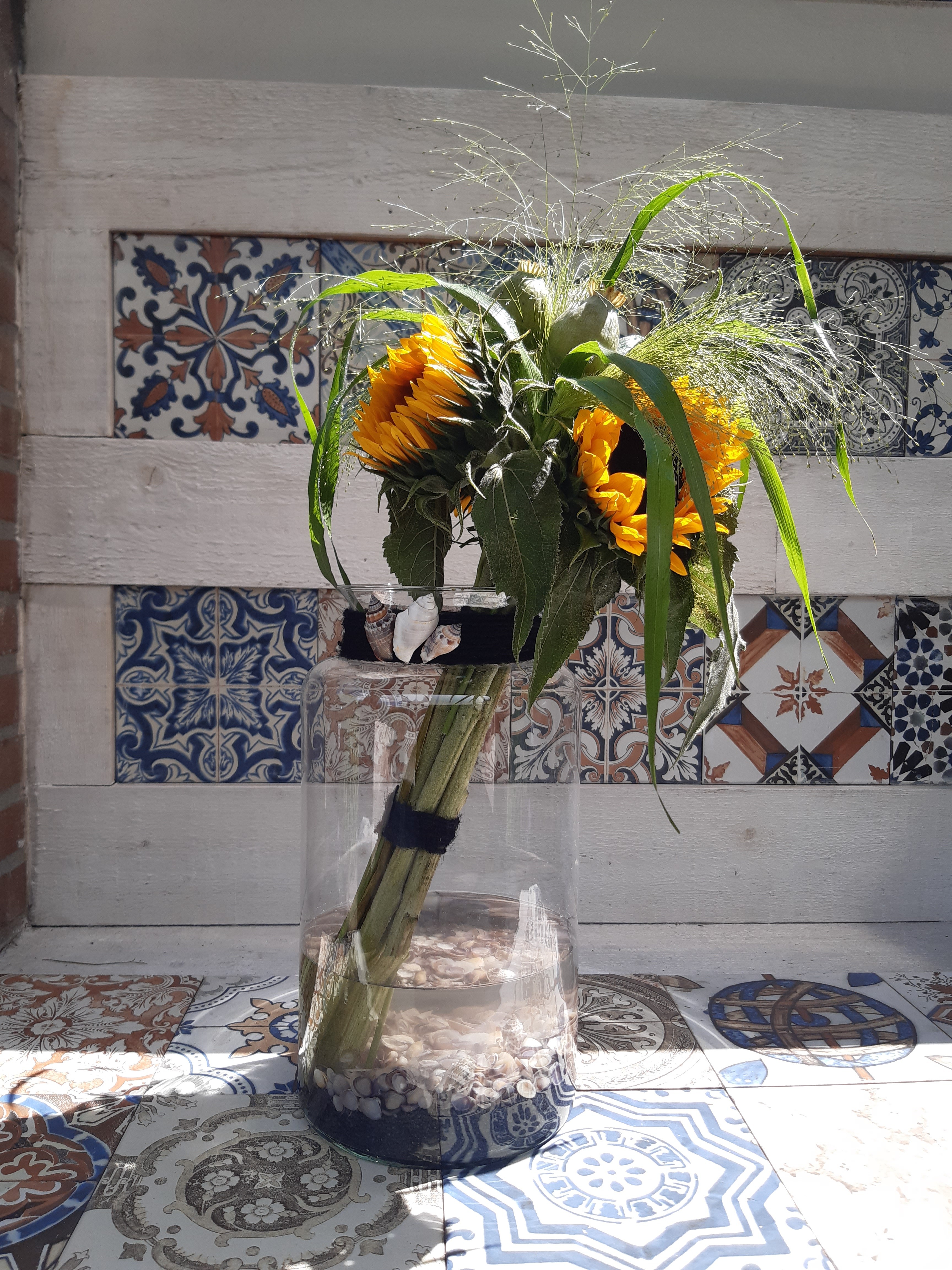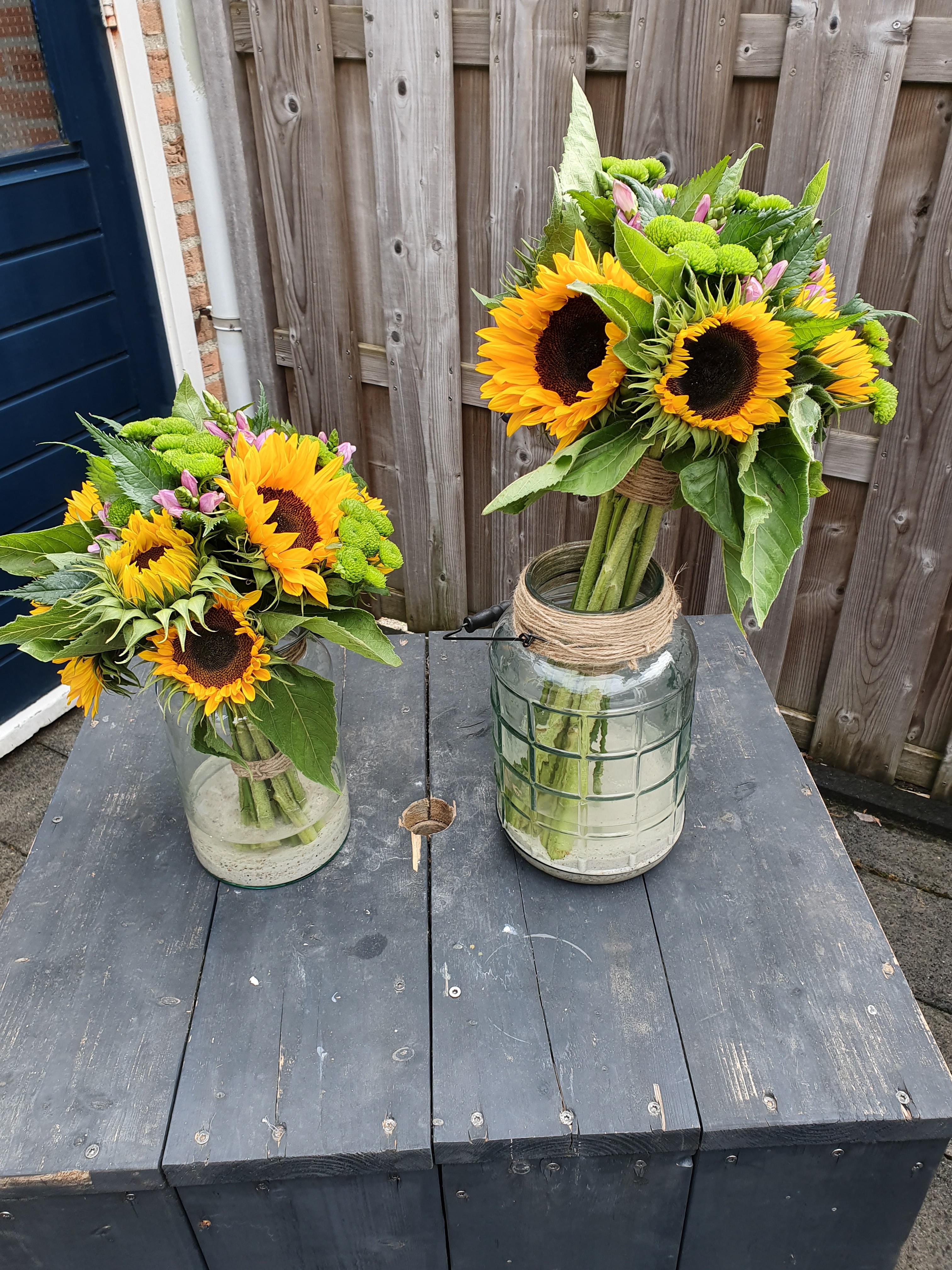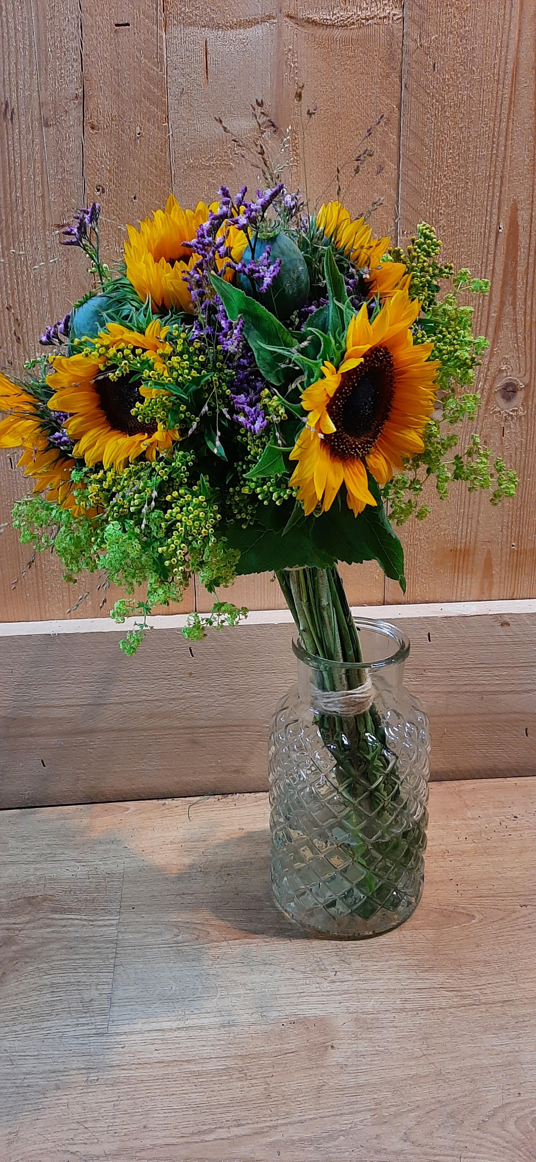 Hoi Karin, Ook dit boeket is prachtig geworden net als je zonnebloemen (Hellianthus) met hoefblad. Iets later kan je ook nog die vaas met zonnebloemen en pompoenen maken. Die ga je ook vast leuk vinden en die blijft ook heel lang staan. Geniet van de zomer. Groetjes, Nicolle