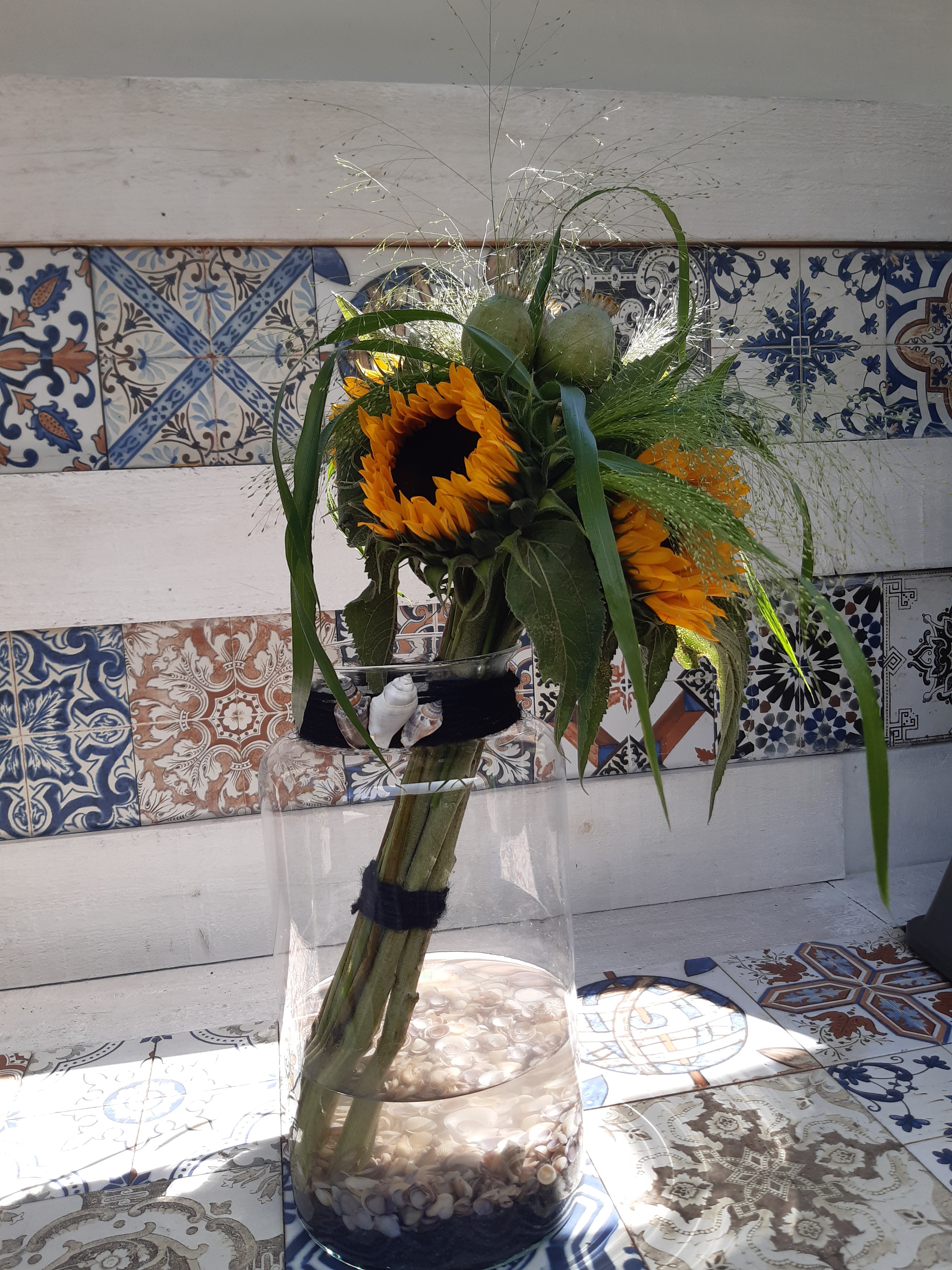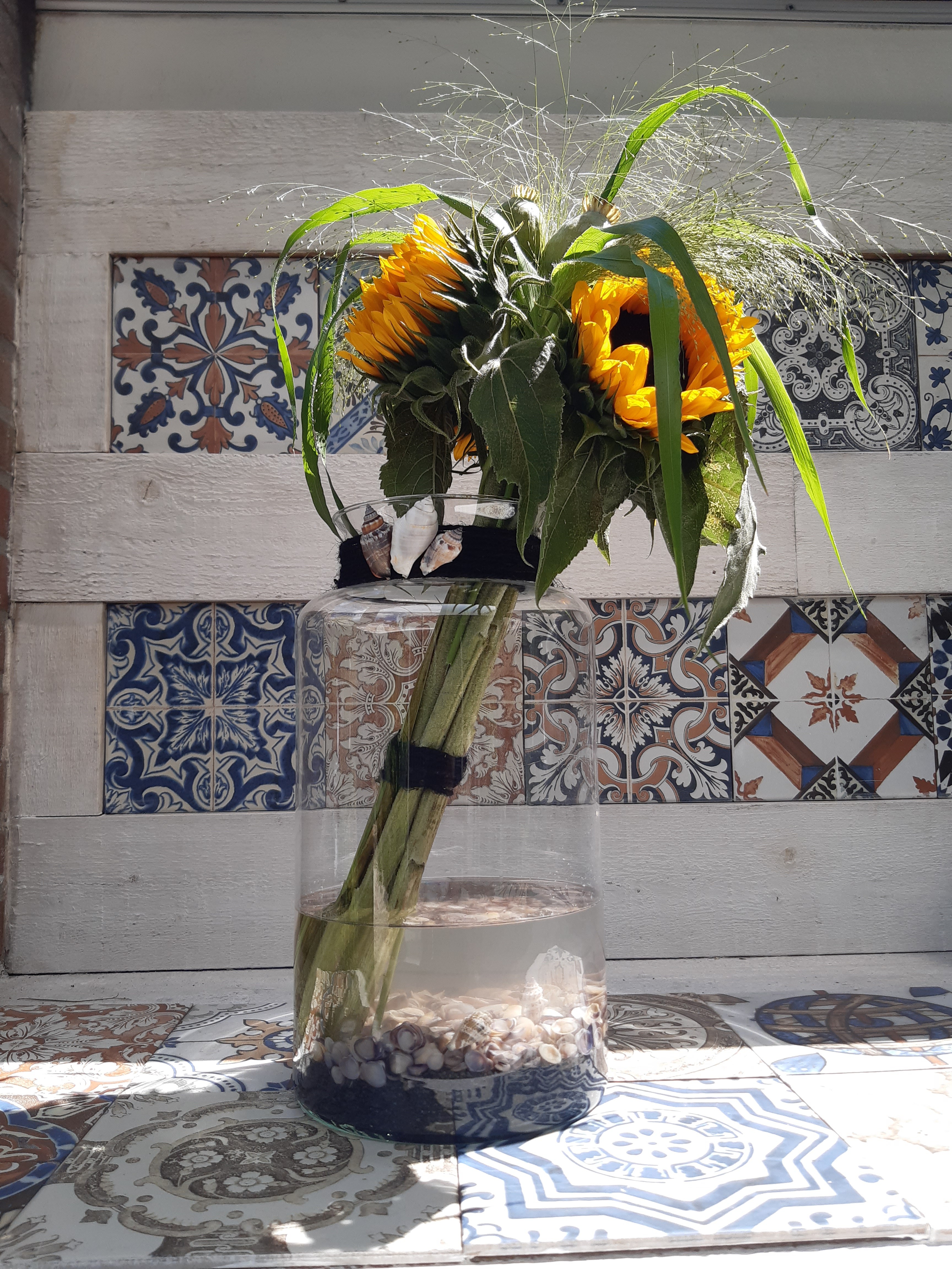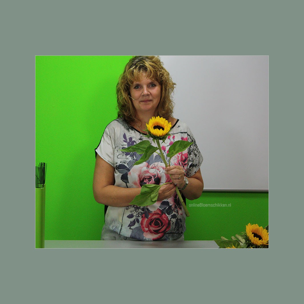 Dit boeket is parallel geschikt. Niet heel moeilijk, maar geeft wel snel een leuk effect. Zo kunnen je zonnebloemen ofwel Helianthus ook niet zo snel slap gaan hangen.