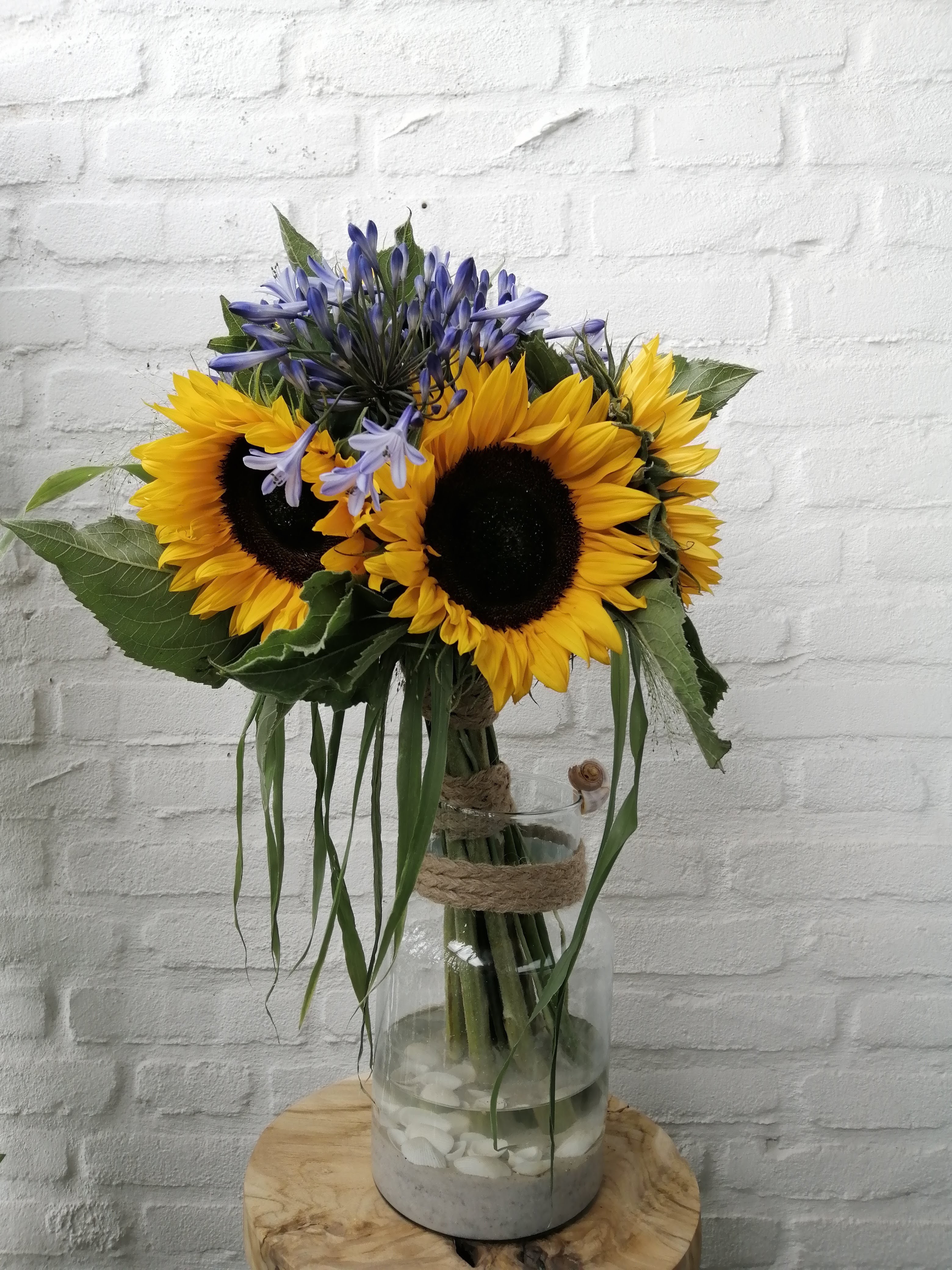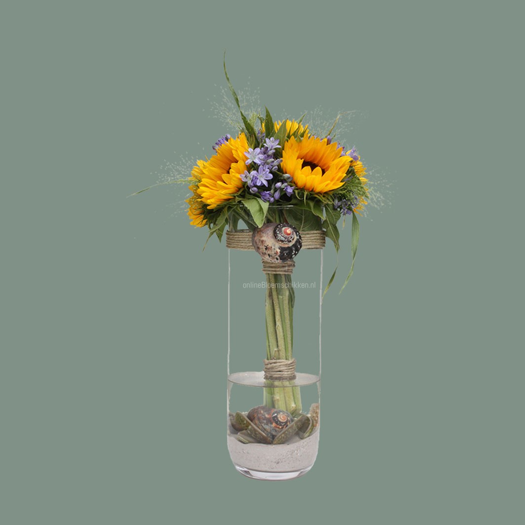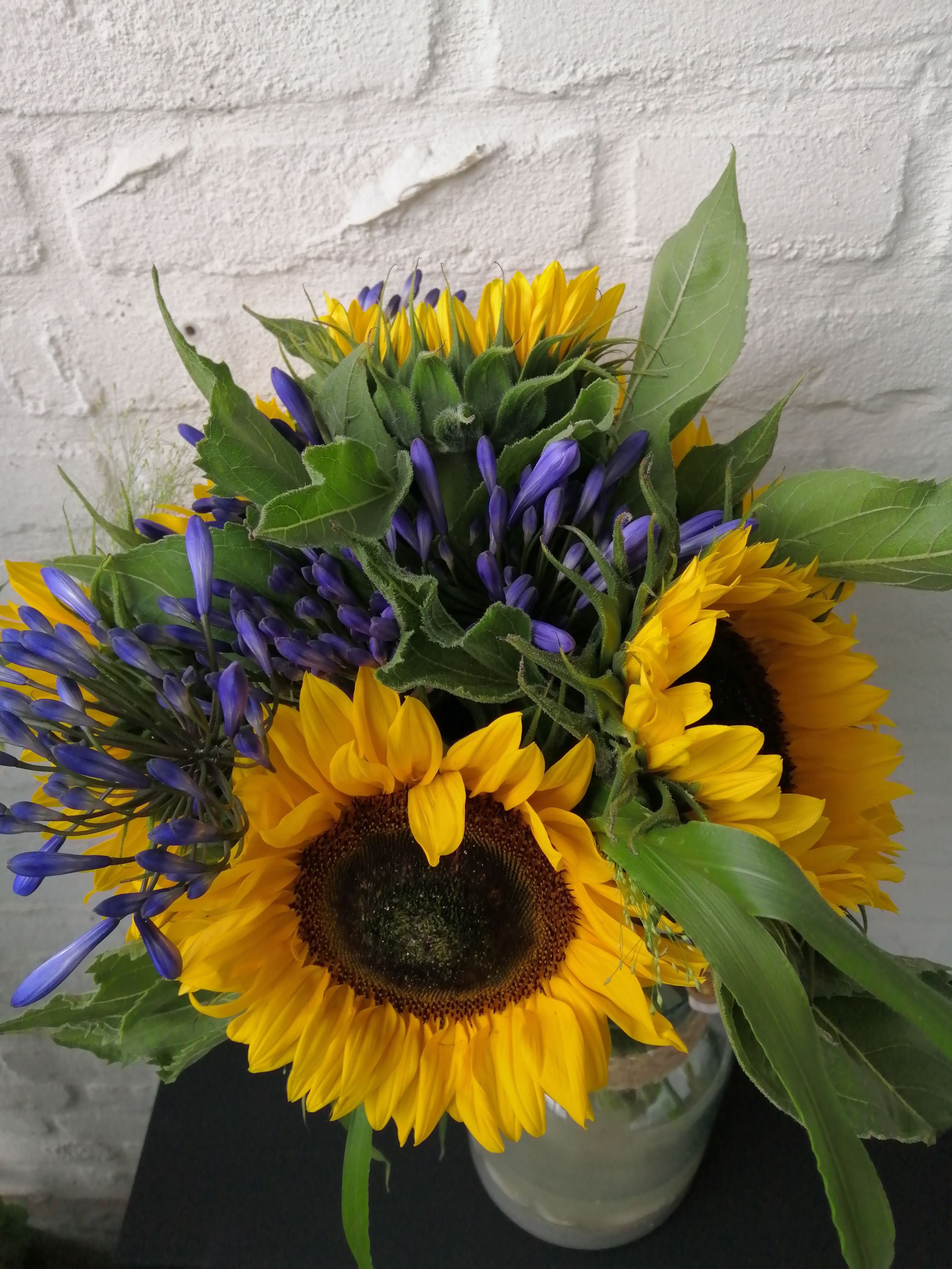 Dit boeket is parallel geschikt. Niet heel moeilijk, maar geeft wel snel een leuk effect. Zo kunnen je zonnebloemen ofwel Helianthus ook niet zo snel slap gaan hangen.