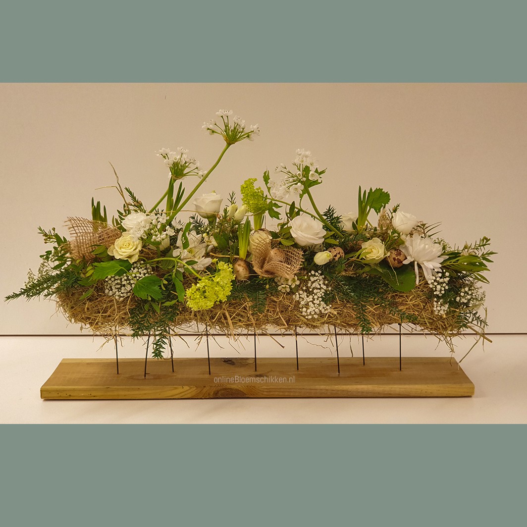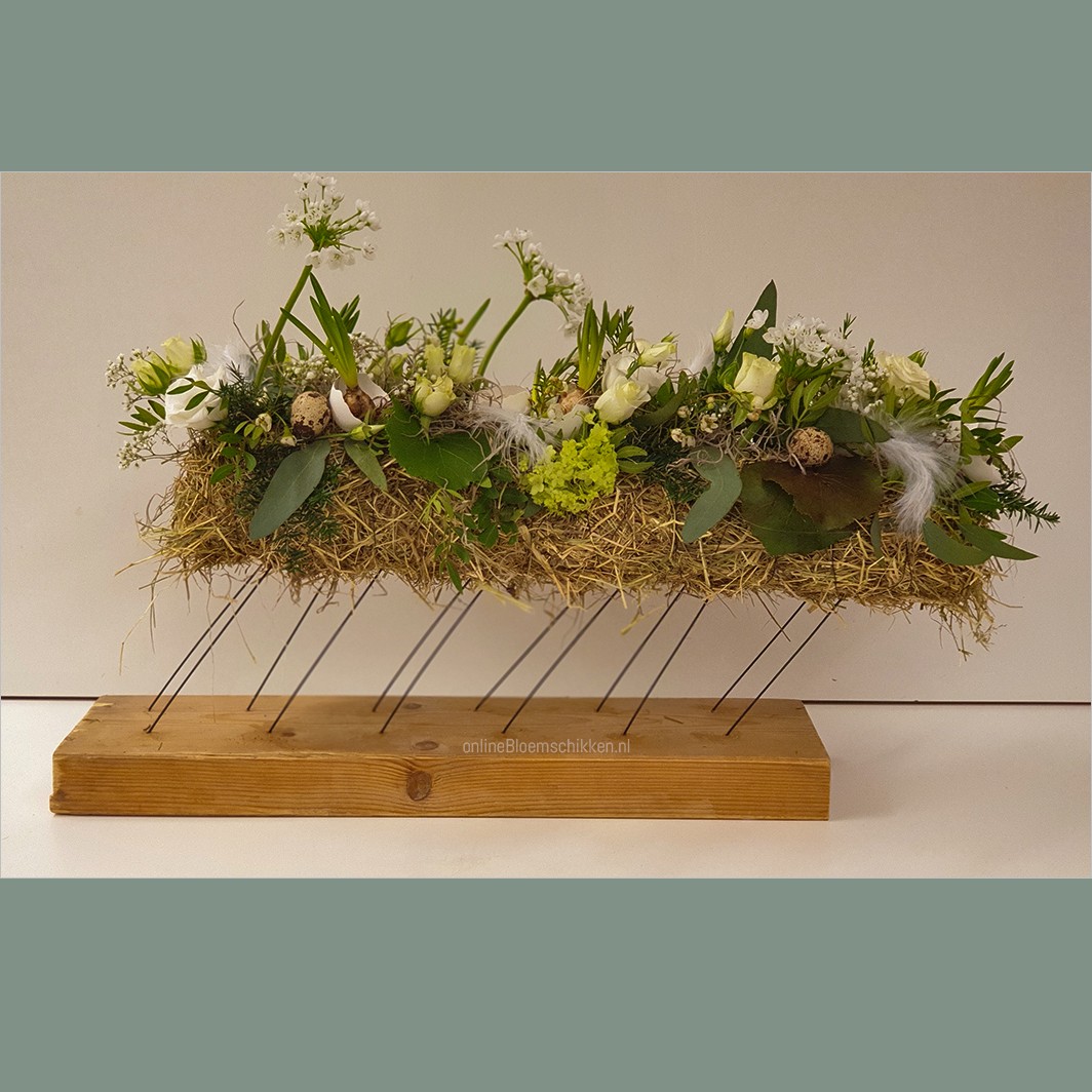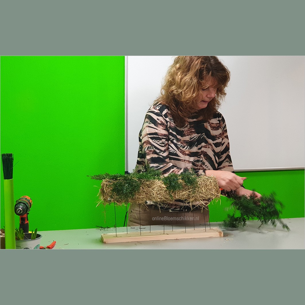 In deze les leer je hoe je helemaal zelf je eigen ondergrond maakt met een bloemrijke hooibaal. Niet heel moeilijk, maar erg leuk om te doen. Maak het arrangement niet al te hoog zodat het ook op elke eettafel mooi staat en je eroverheen kan kijken.