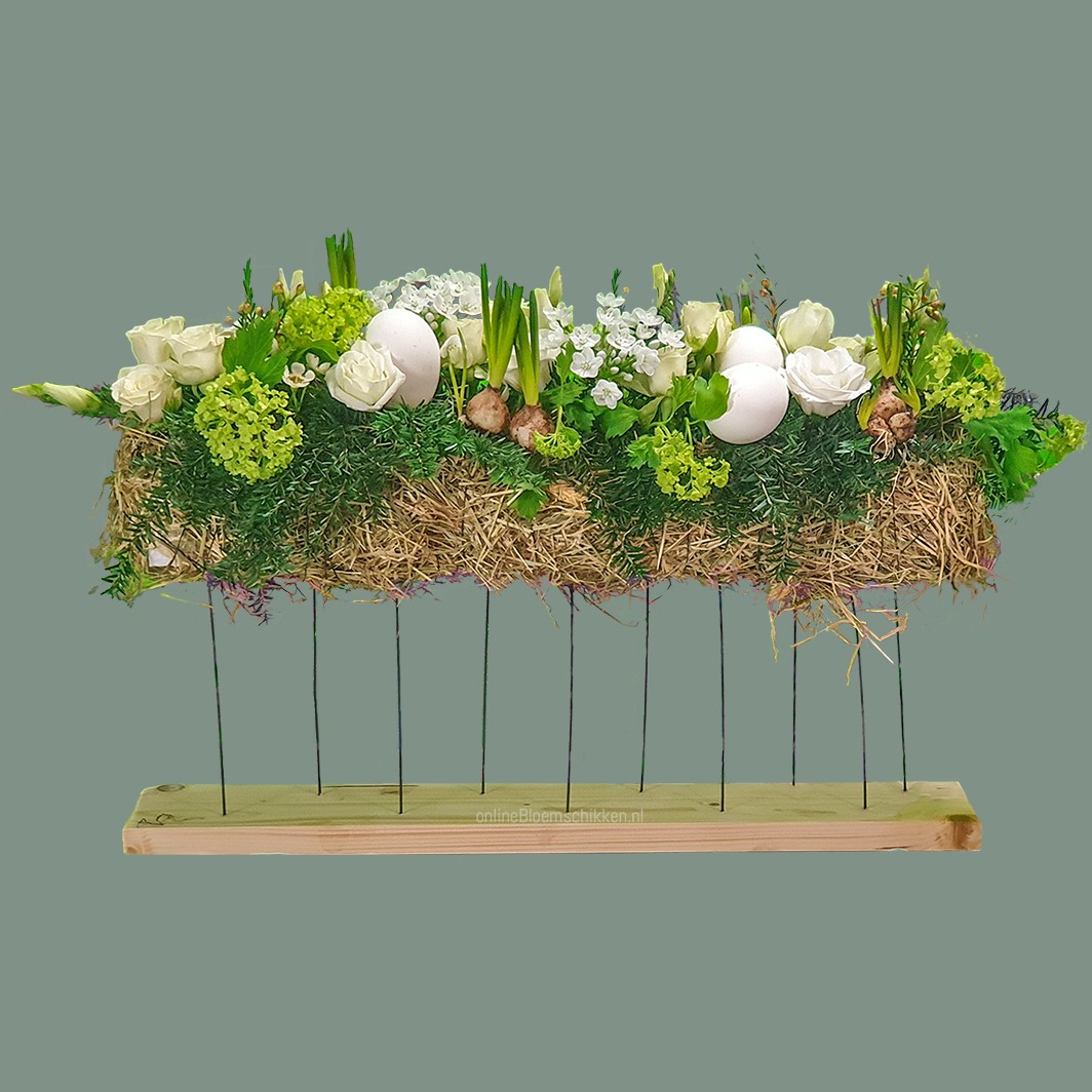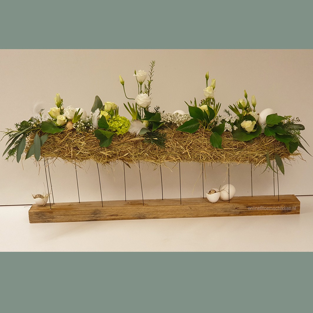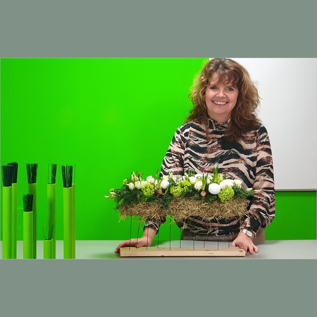 In deze les leer je hoe je helemaal zelf je eigen ondergrond maakt met een bloemrijke hooibaal. Niet heel moeilijk, maar erg leuk om te doen. Maak het arrangement niet al te hoog zodat het ook op elke eettafel mooi staat en je eroverheen kan kijken.