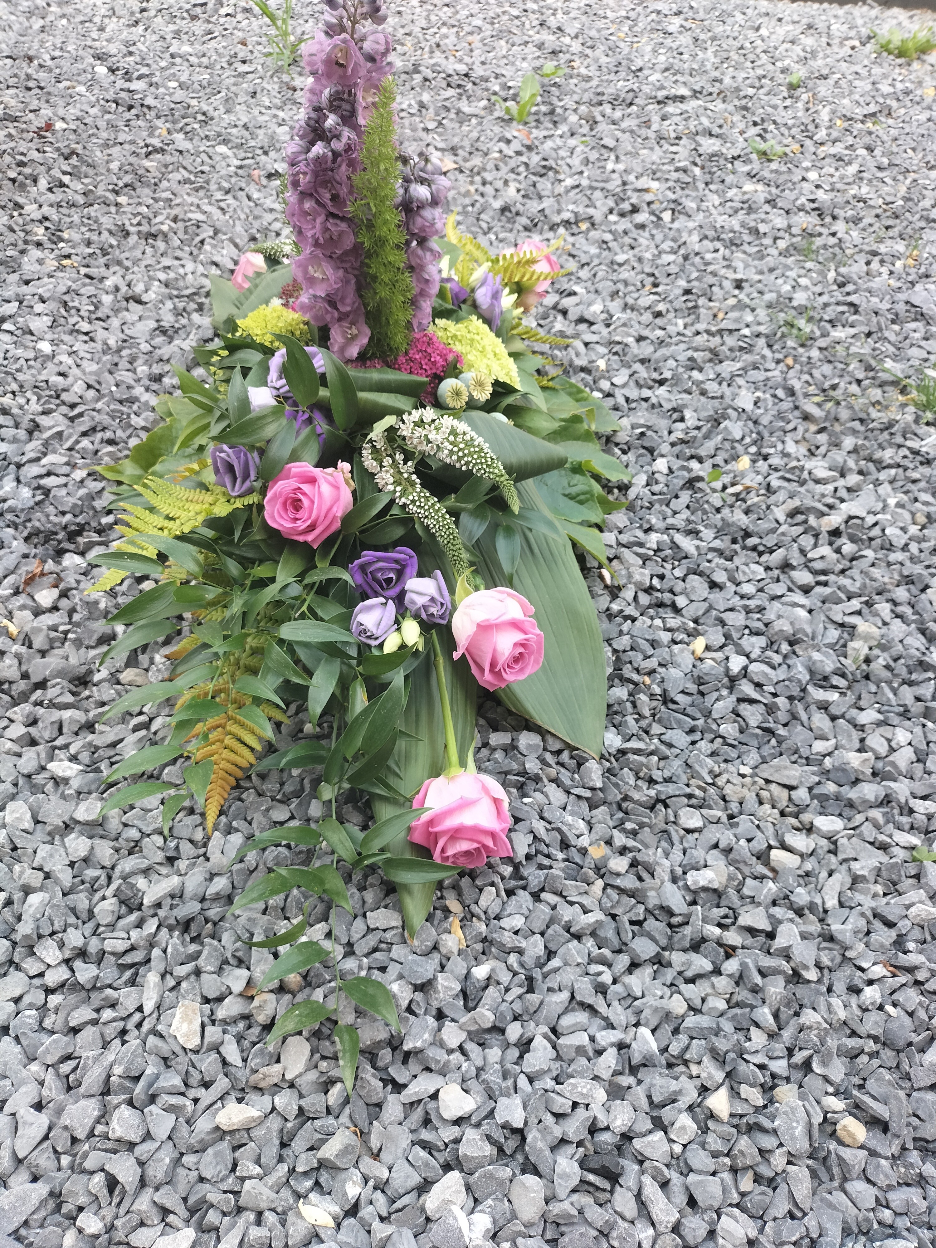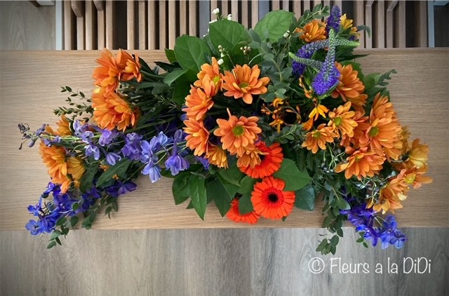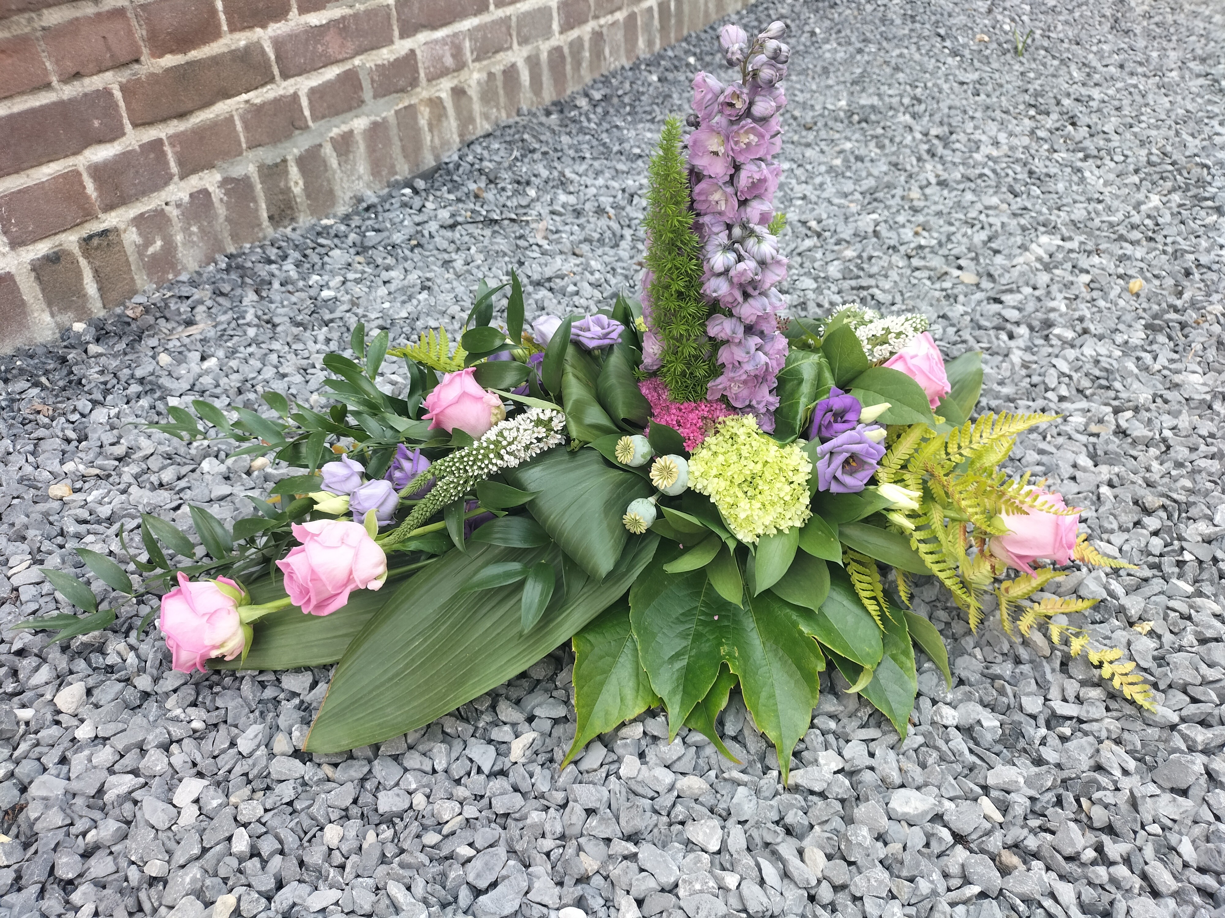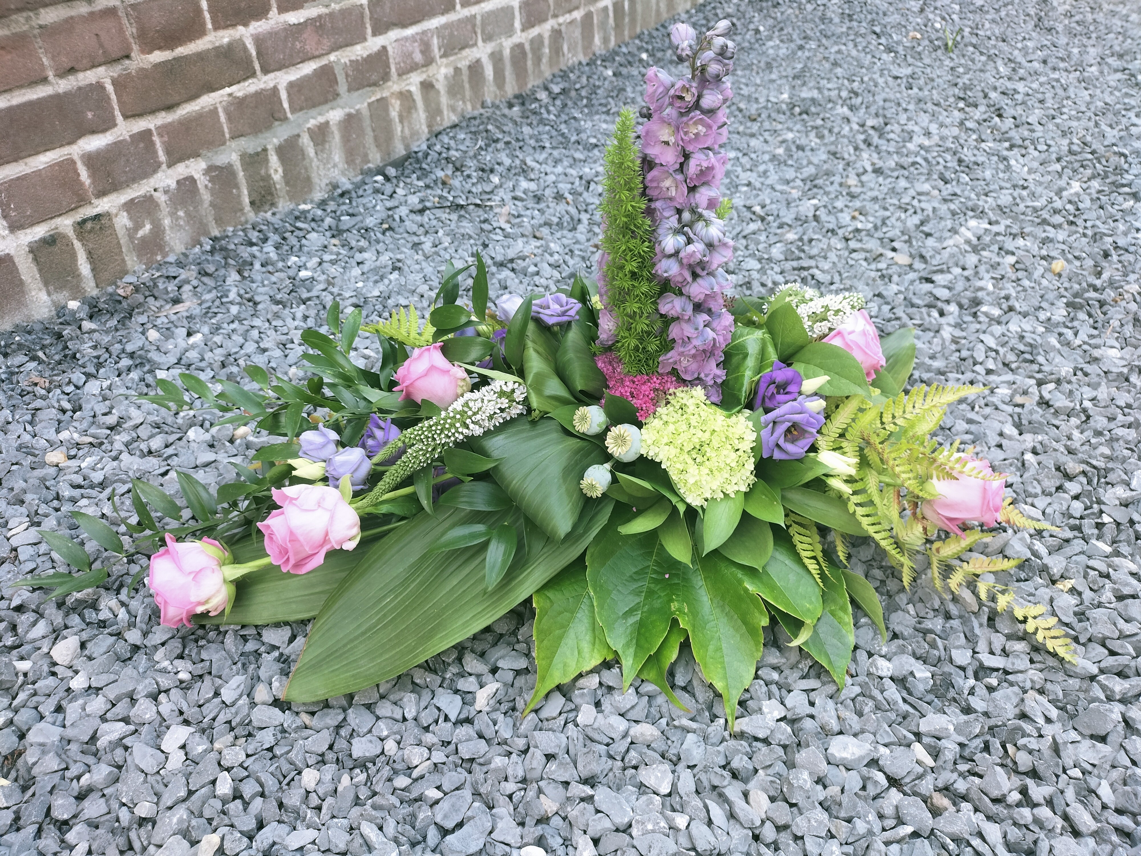 Dit rouwarrangement gemaakt met de overige bloemen van mijn tuintje op tafeldeco. Ik merkte dat ik veel te weinig variatie had aan blad en ik had minstens 1 delphinium tekort. De tweede lijn mist er 1. Ik heb hiervoor de restjes bij elkaar gestoken maar die vallen gewoon niet op.