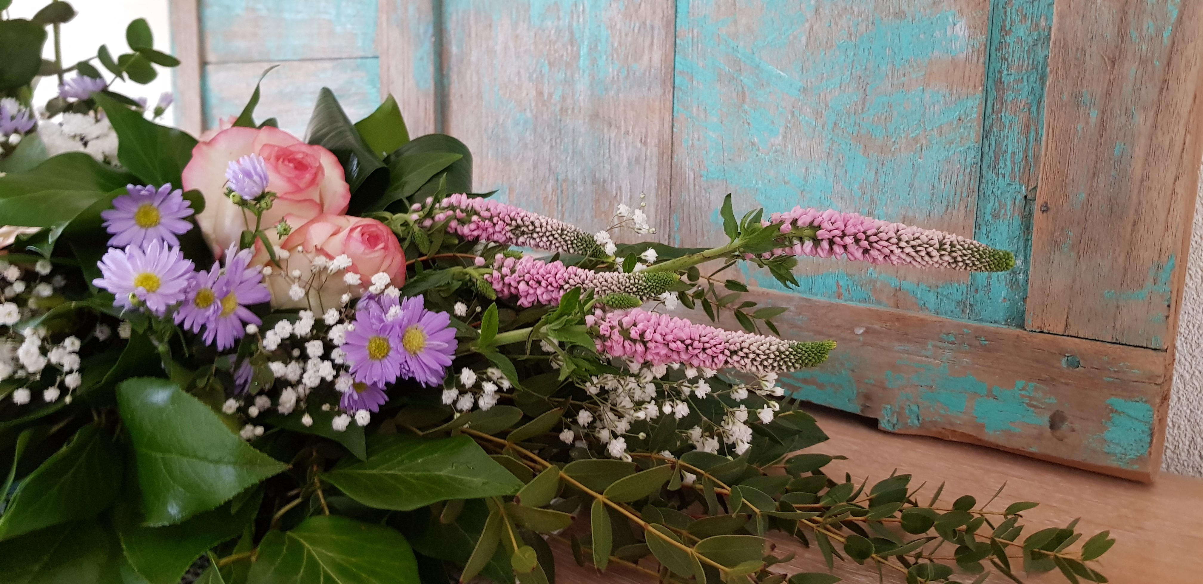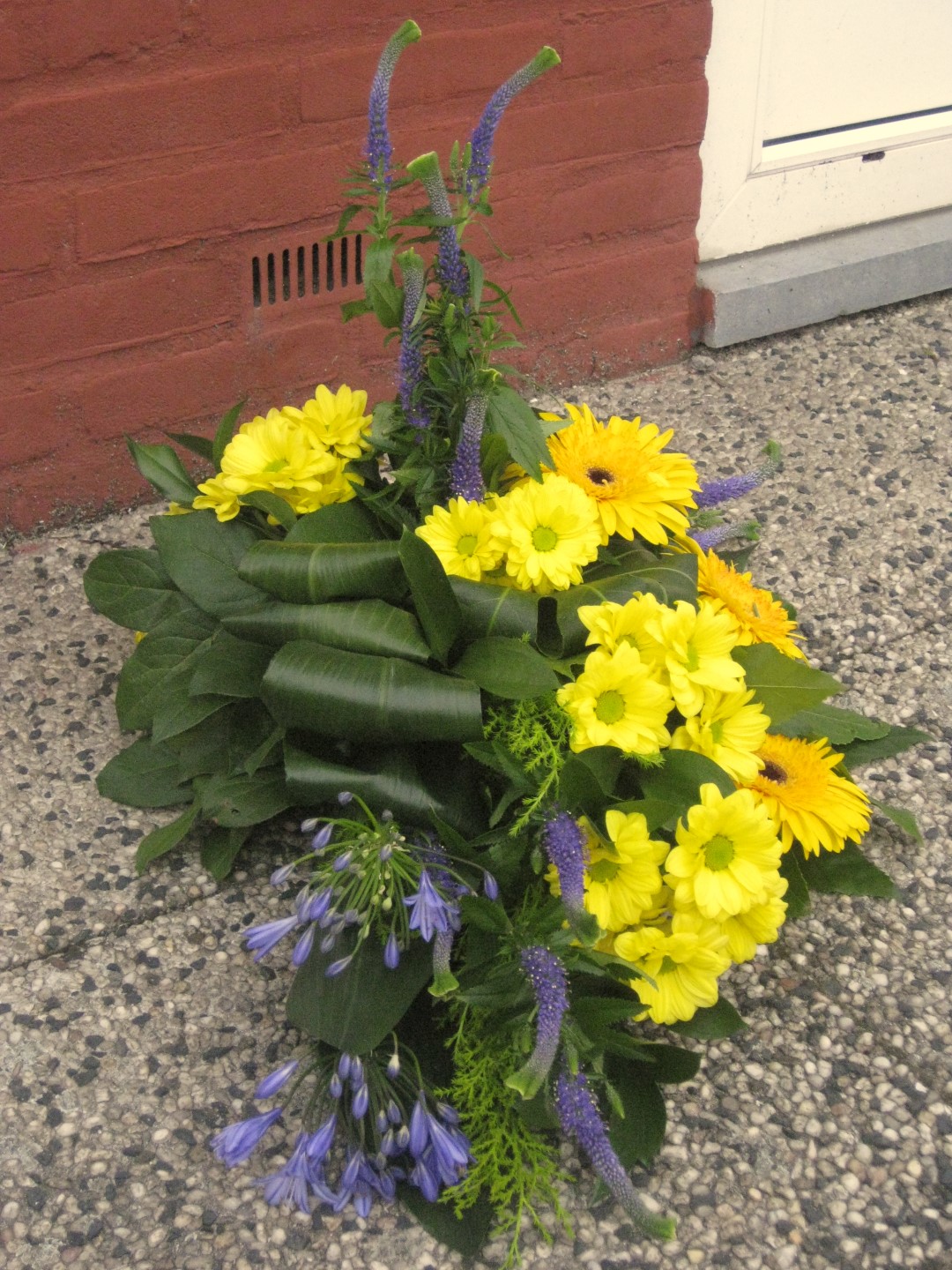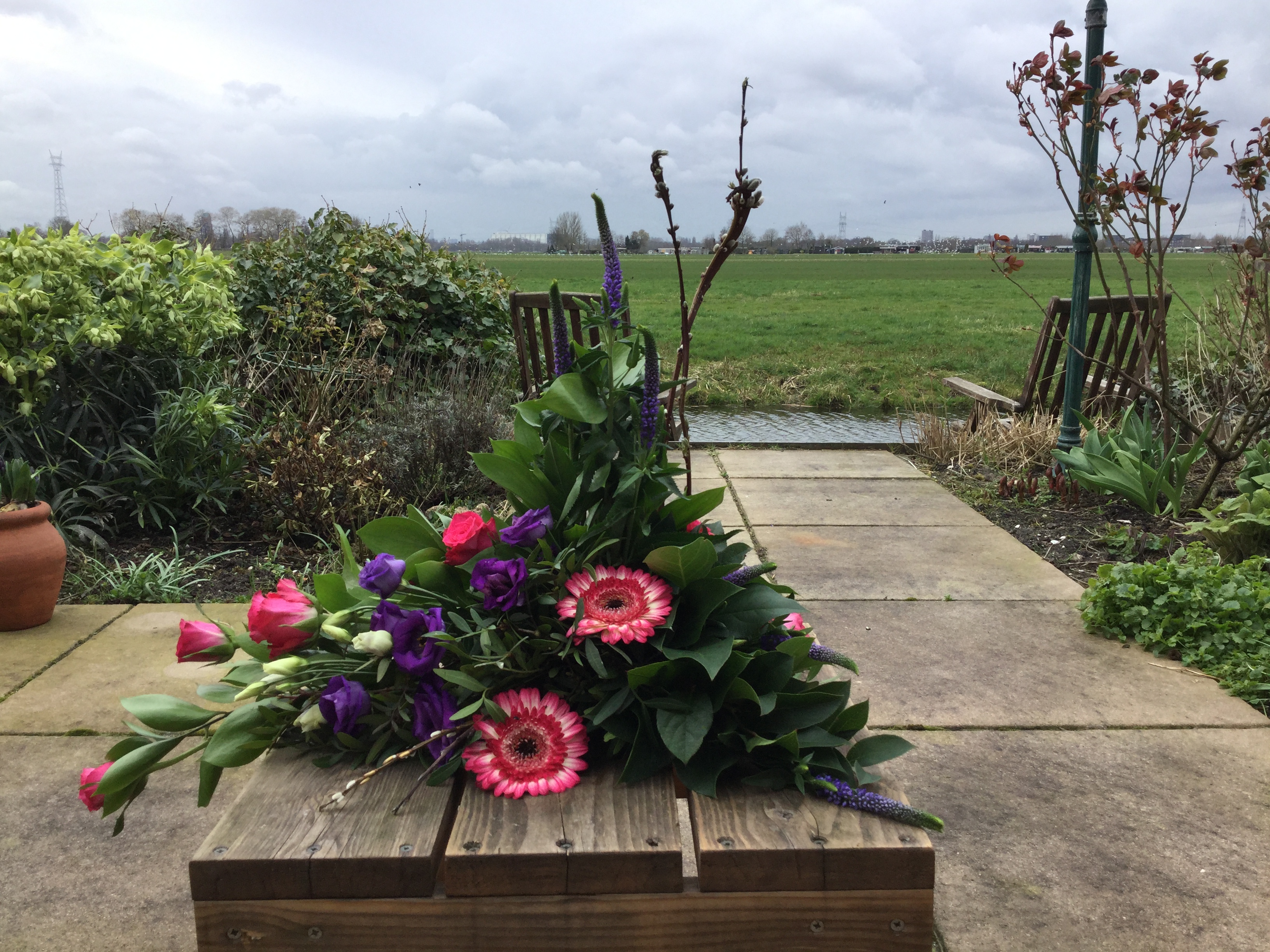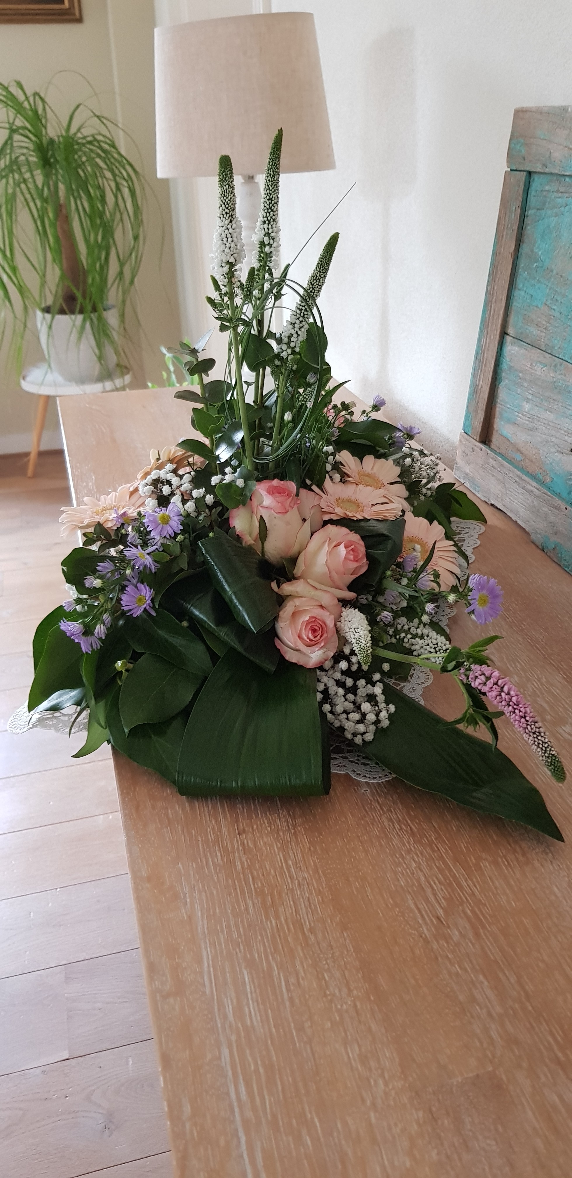Dit rouwarrangement gemaakt met de overige bloemen van mijn tuintje op tafeldeco. Ik merkte dat ik veel te weinig variatie had aan blad en ik had minstens 1 delphinium tekort. De tweede lijn mist er 1. Ik heb hiervoor de restjes bij elkaar gestoken maar die vallen gewoon niet op.