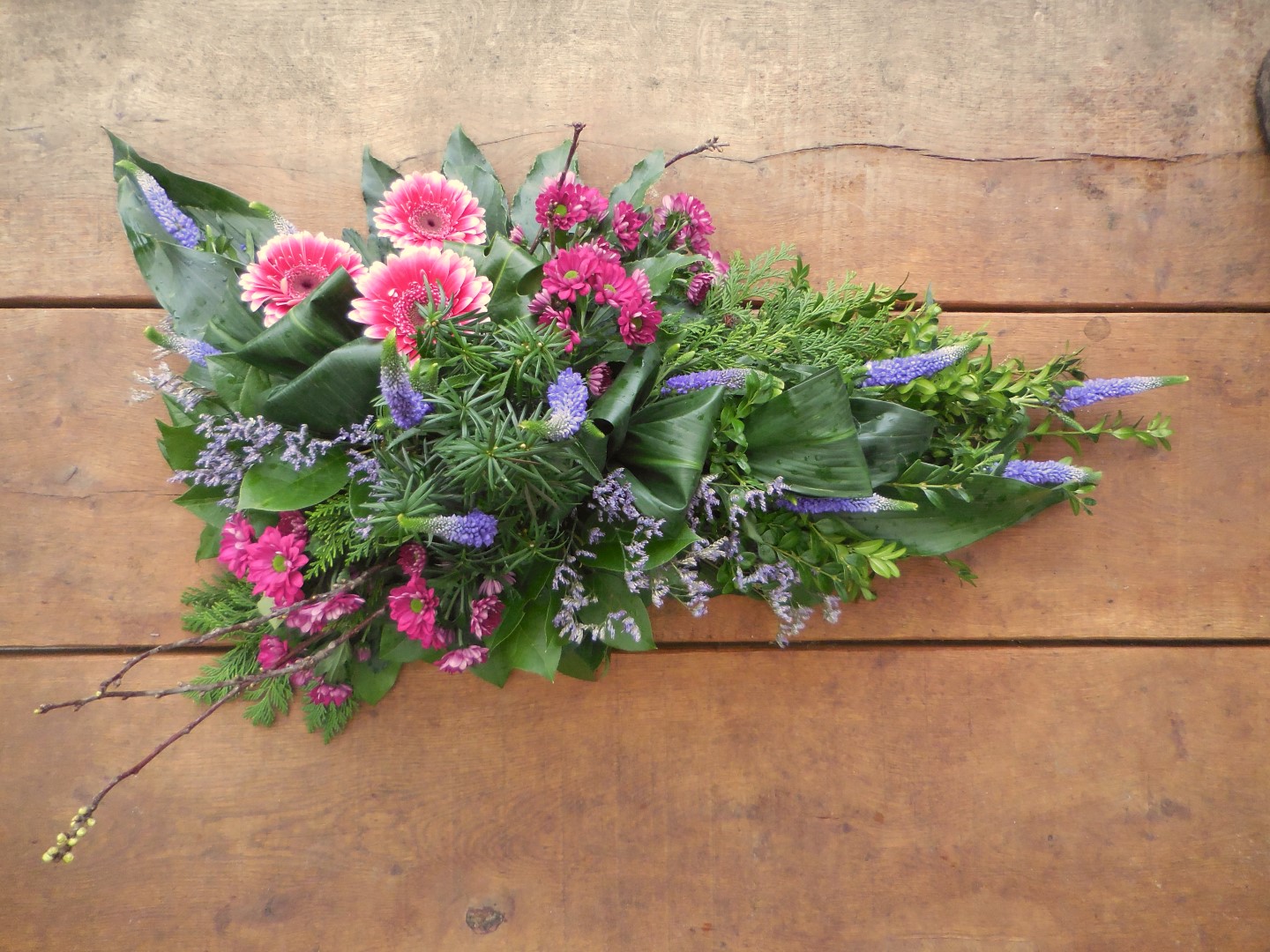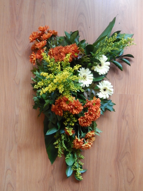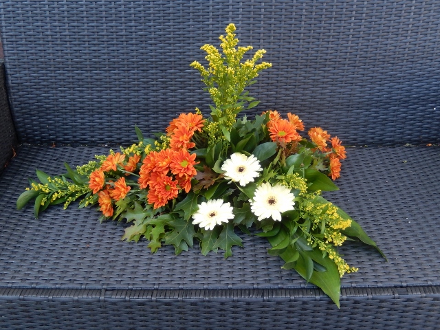 Nog eens het lineair rouwstuk geoefend,dit keer minder tevreden dan de vorige keer , de rozen in het midden staan niet goed, ik hadcruscus besteld maar deze was niet meegekomen , daarom zelf wat uit de tuin gehaald om het midden op te vullen en in de langste lijn naar voren, wat mij betreft wat rommelig maar ik vond niks anders, wel vind ik het een leuk stuk om te maken , Volgende keer beter,