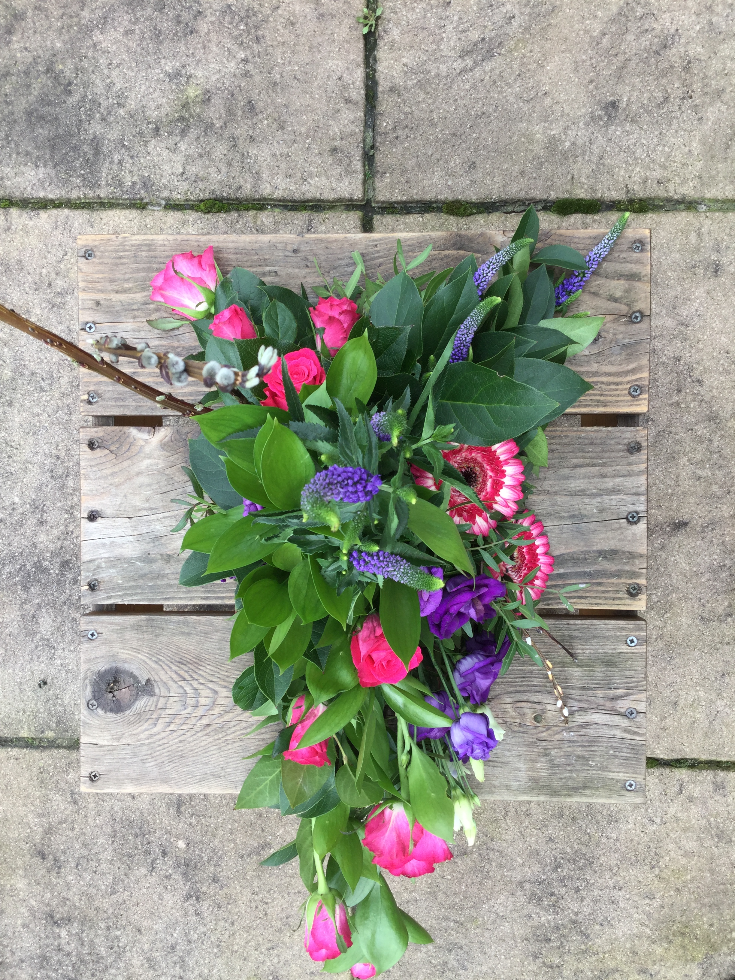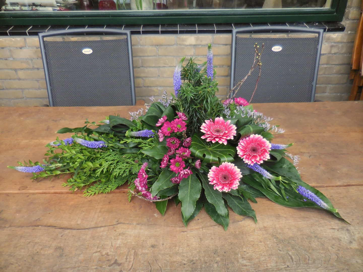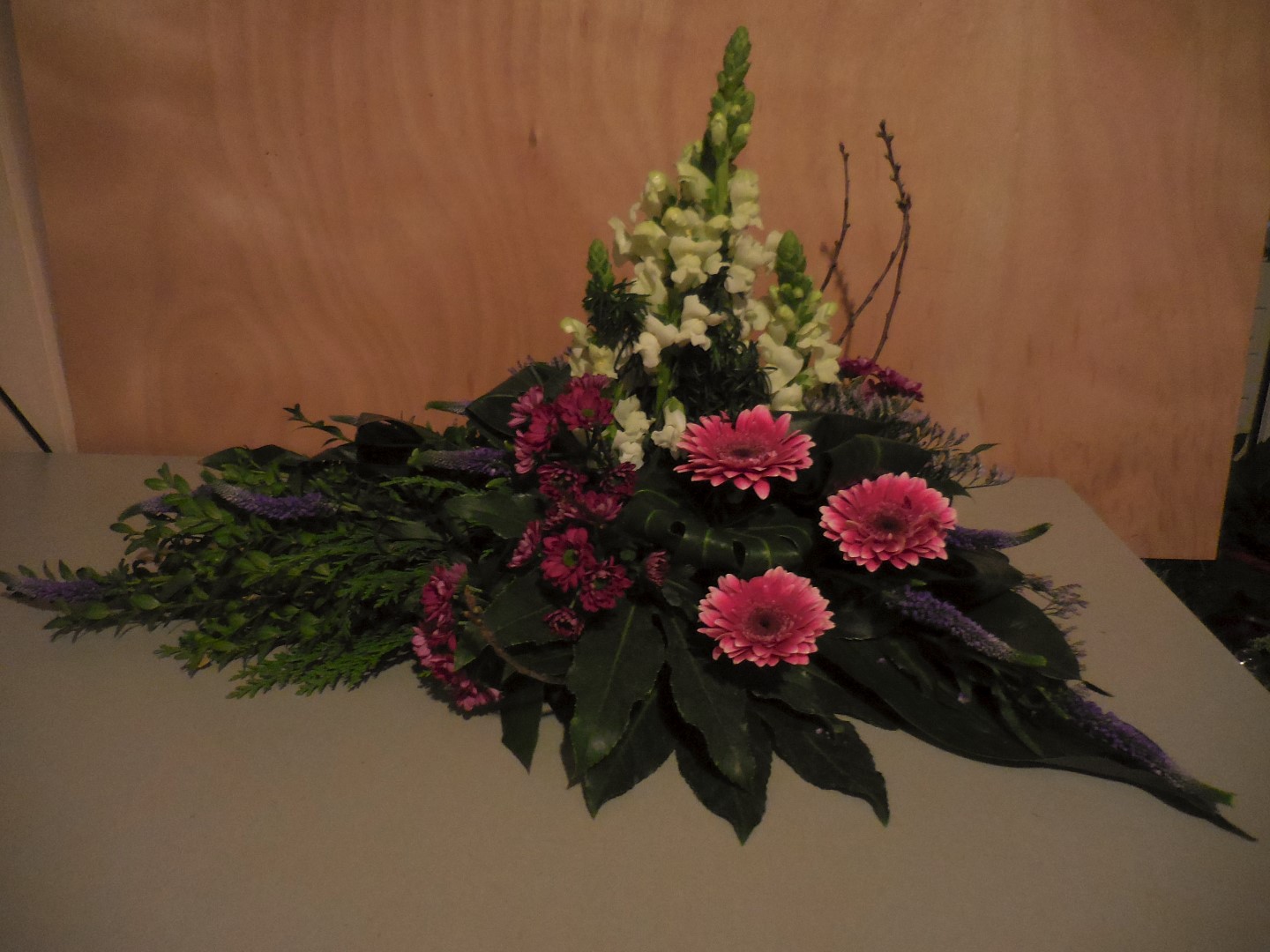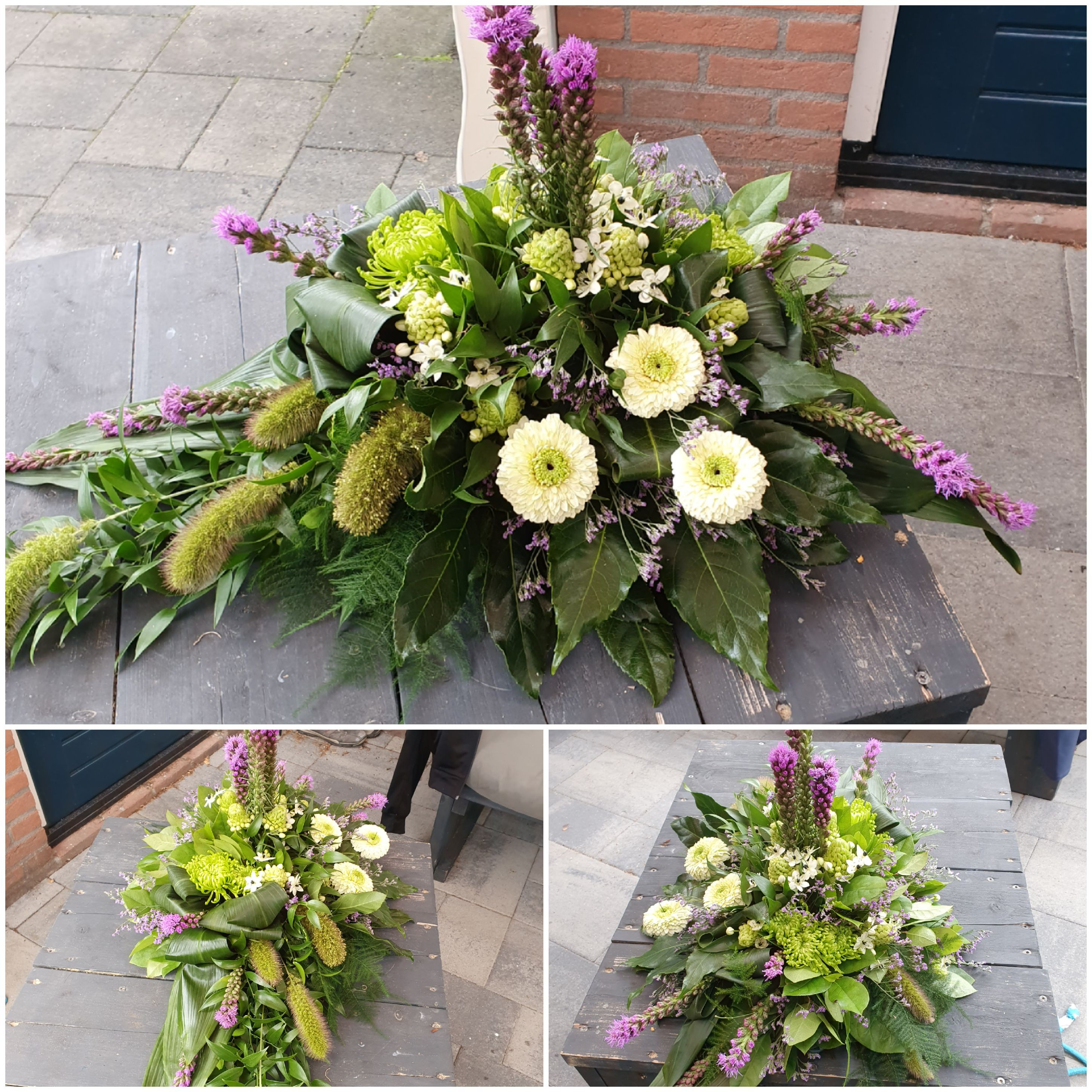 Hoi Nicolle, Hier is mijn lineair rouwarrangement. In het midden had ik eerst witte leeuwenbekken verticaal, was toch niet zo mooi (een beetje te veel rood/wit/blauw :) dus later vervangen door Veronica, een beetje karig, hadden er meer mogen zijn. Groetjes! Caroline.