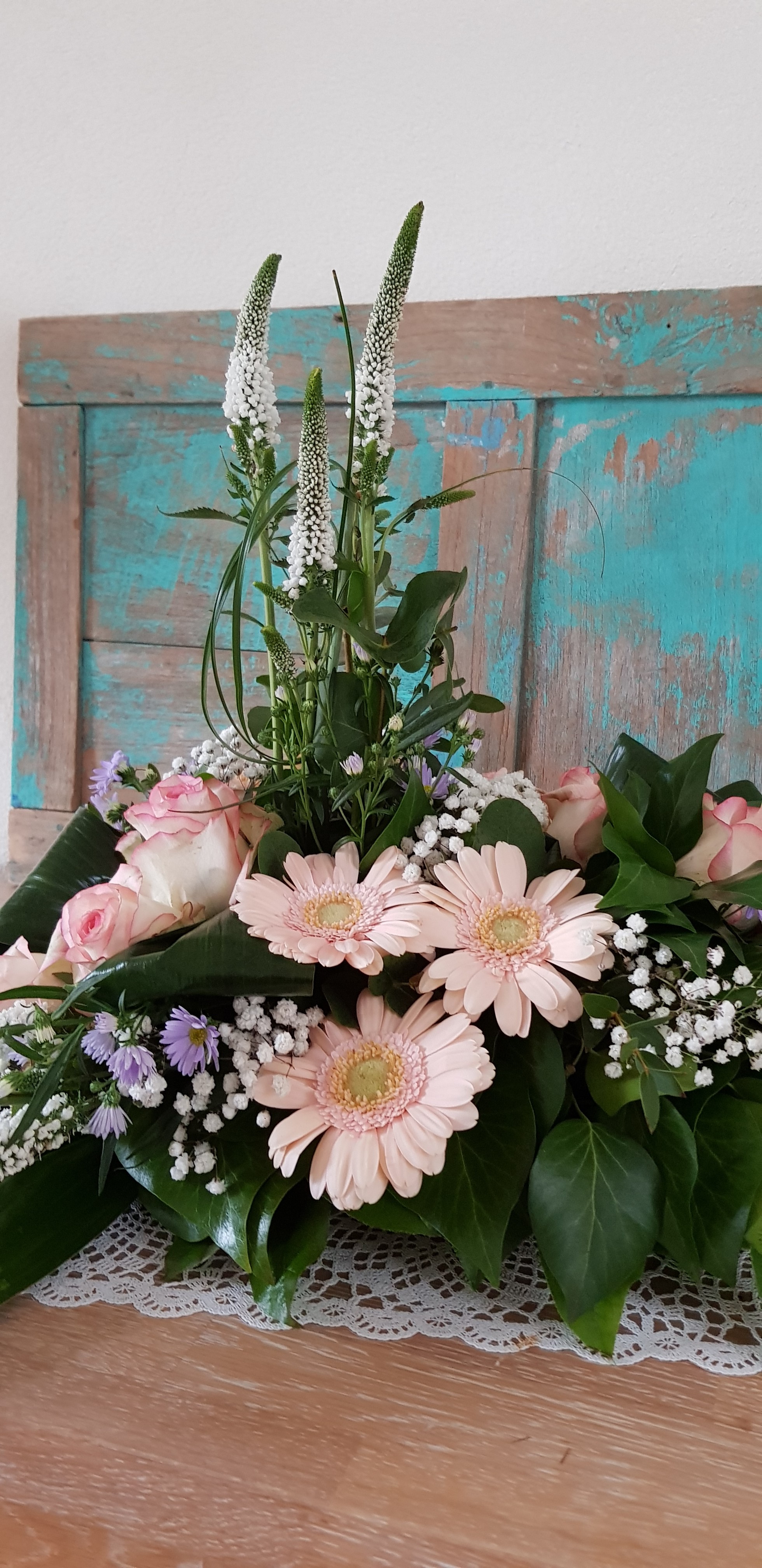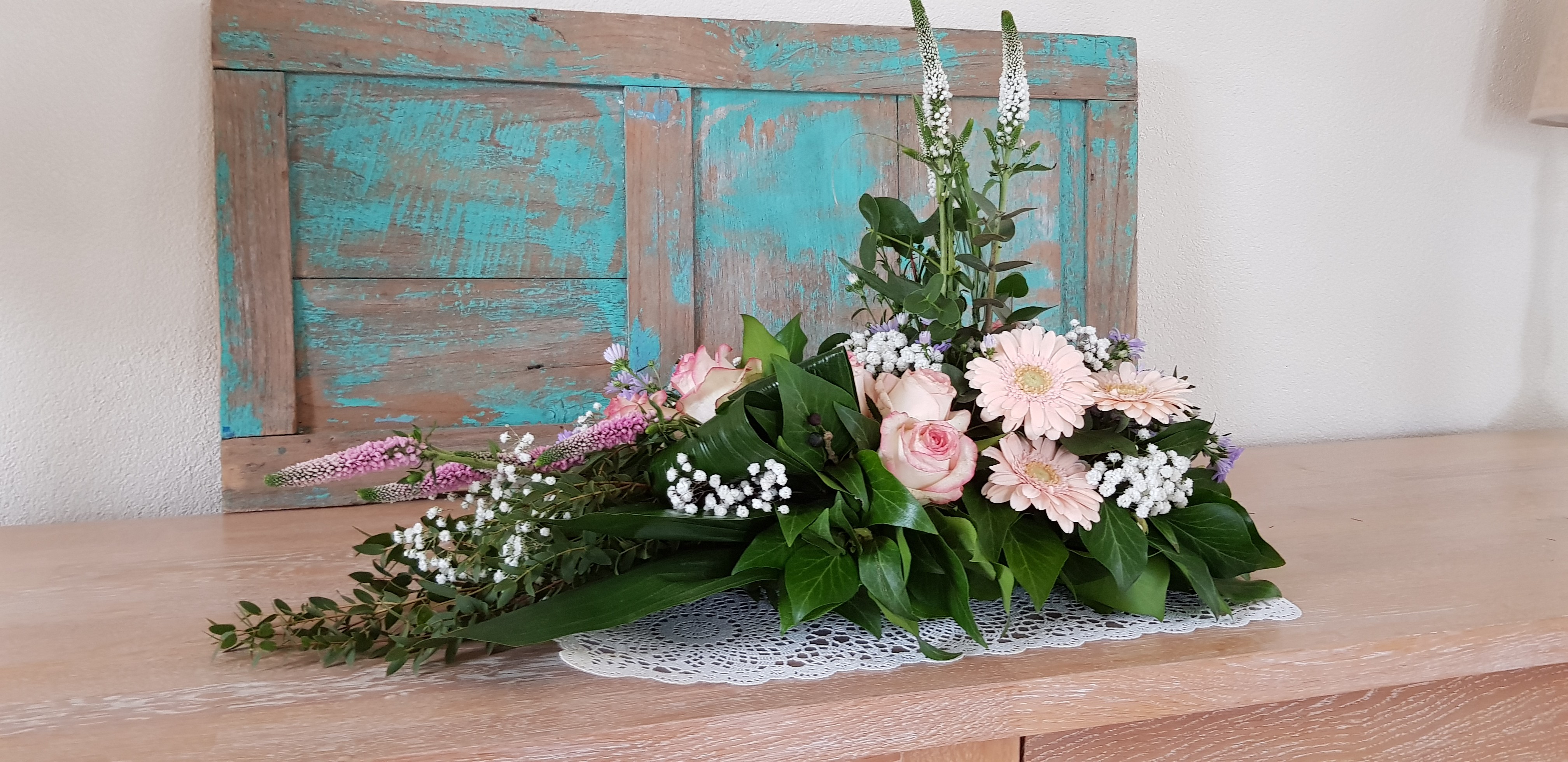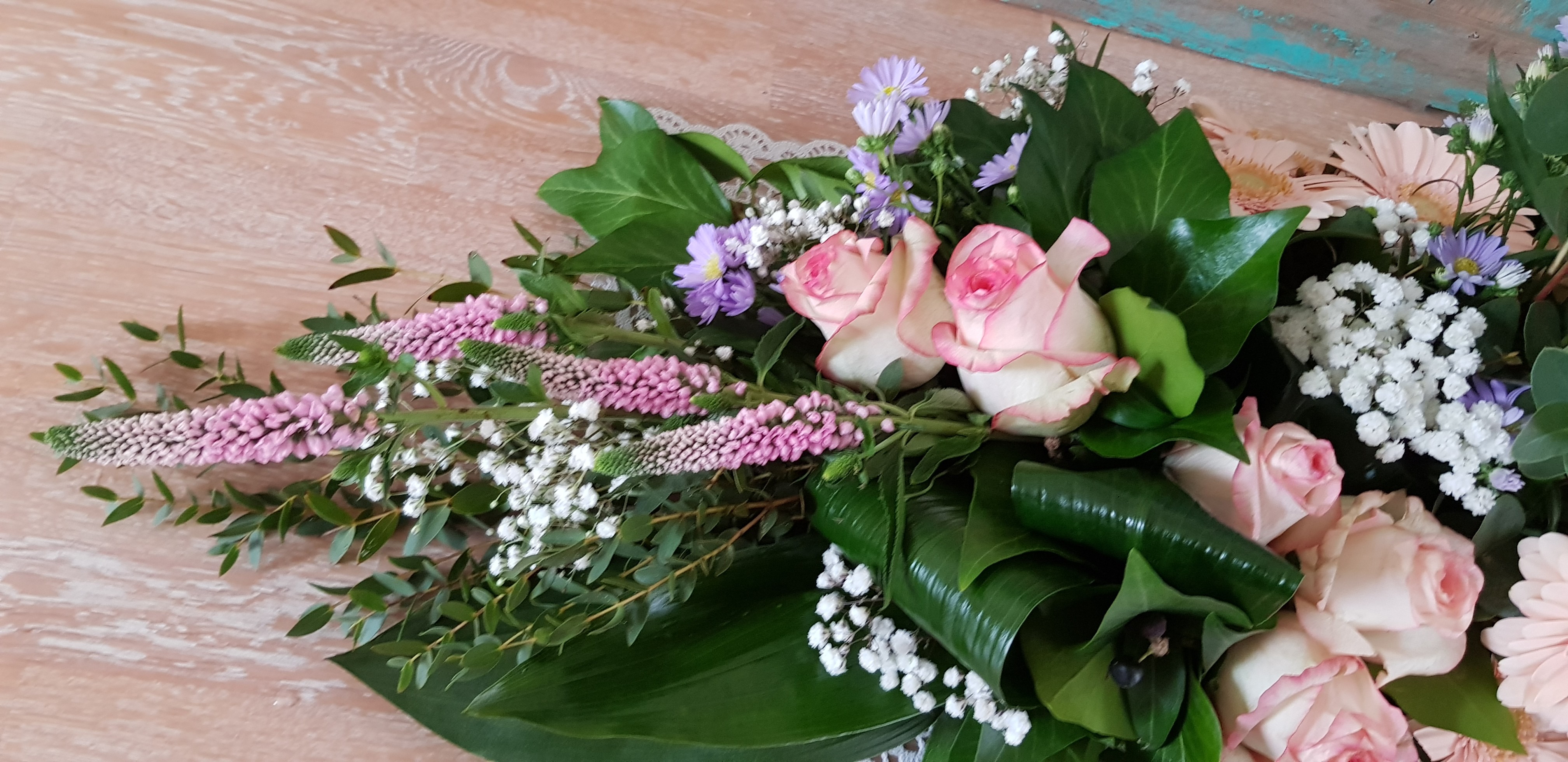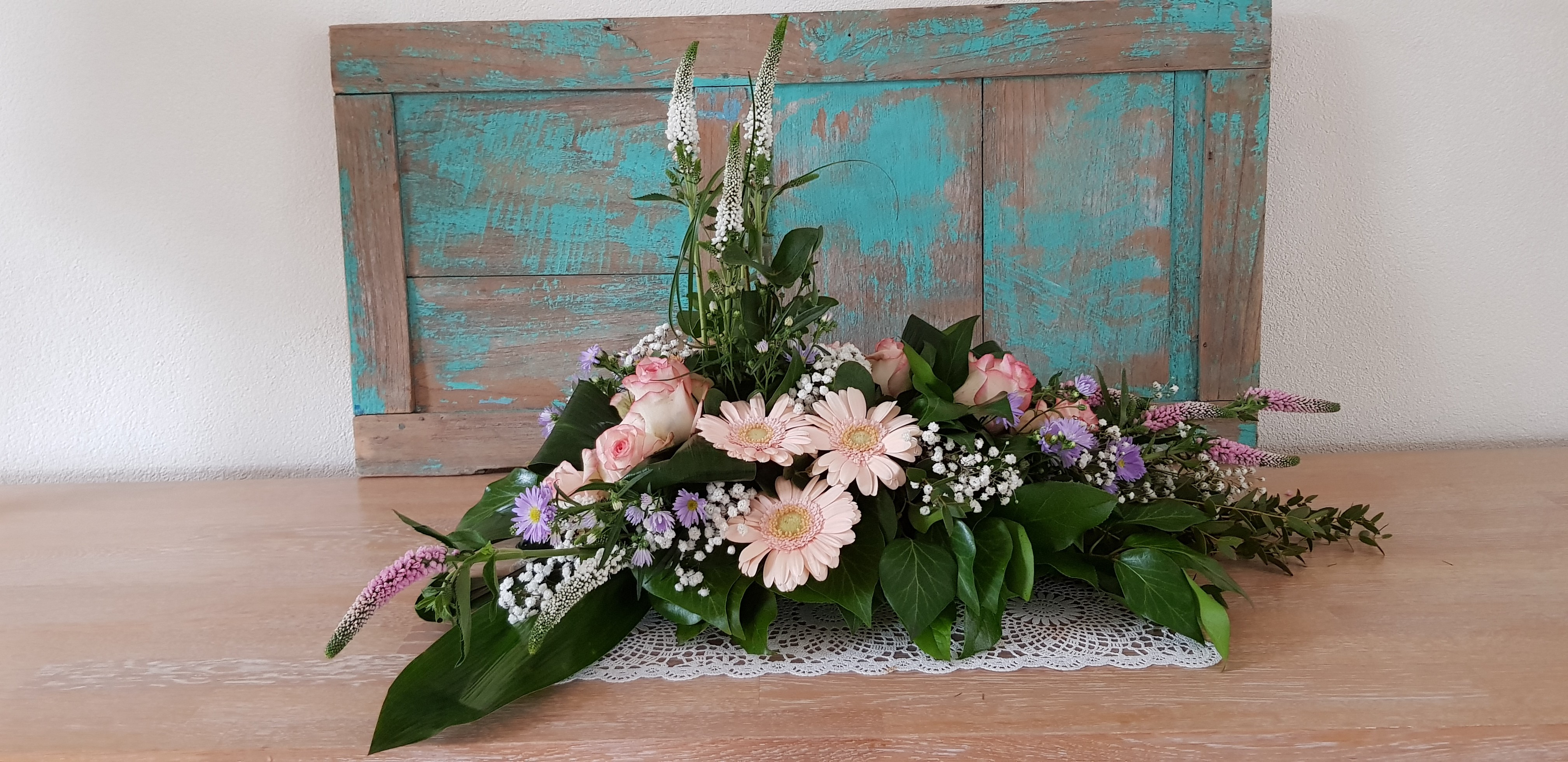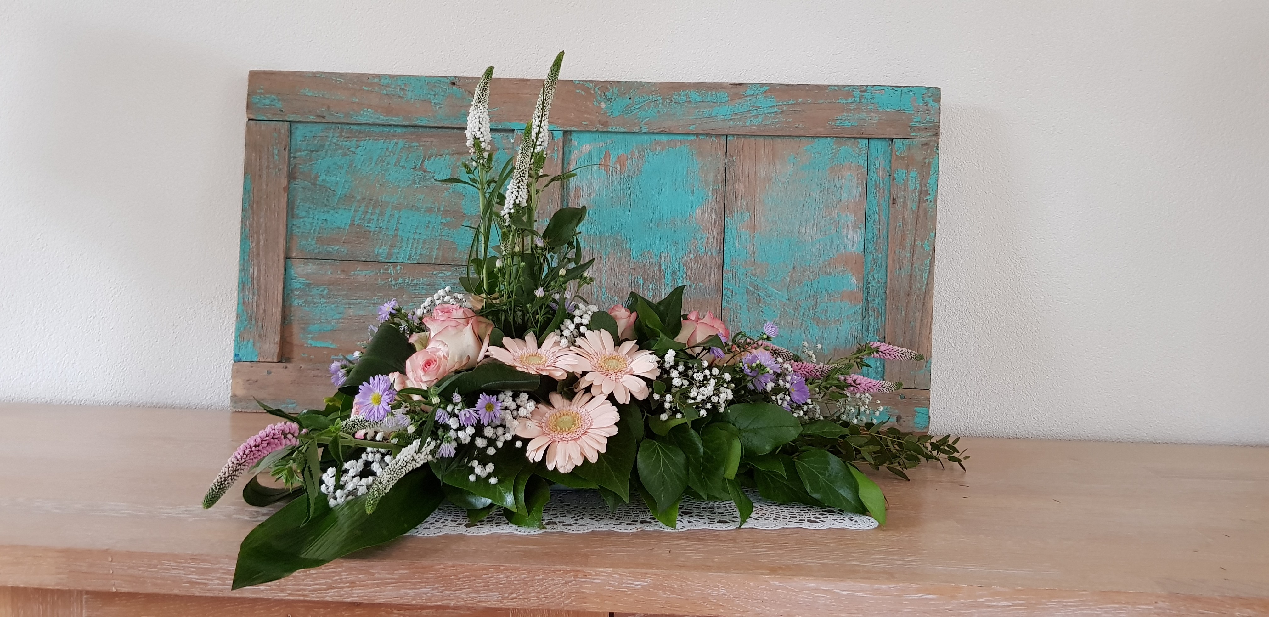 Hoi Nicolle, Hier is mijn lineair rouwarrangement. In het midden had ik eerst witte leeuwenbekken verticaal, was toch niet zo mooi (een beetje te veel rood/wit/blauw :) dus later vervangen door Veronica, een beetje karig, hadden er meer mogen zijn. Groetjes! Caroline.
