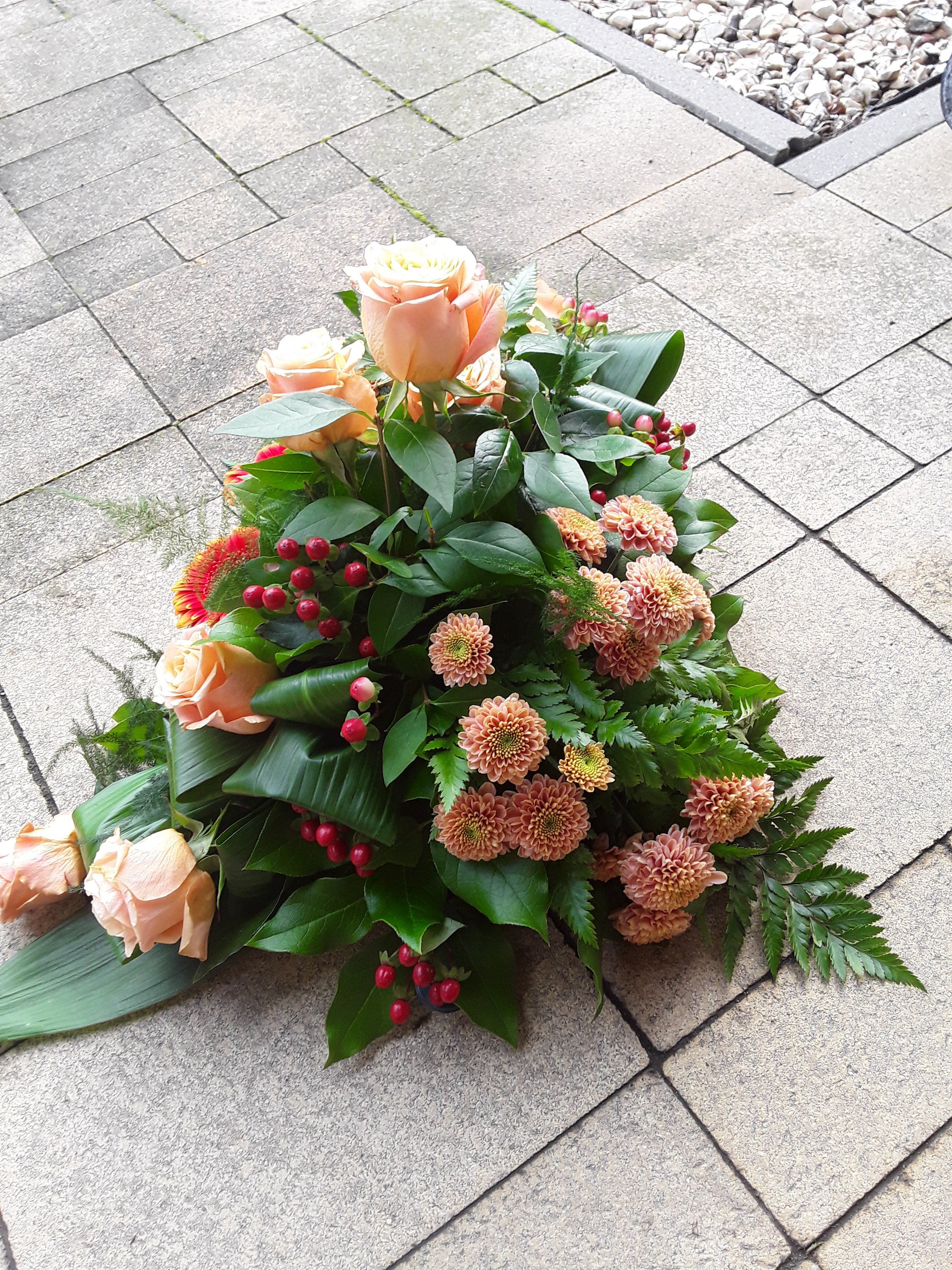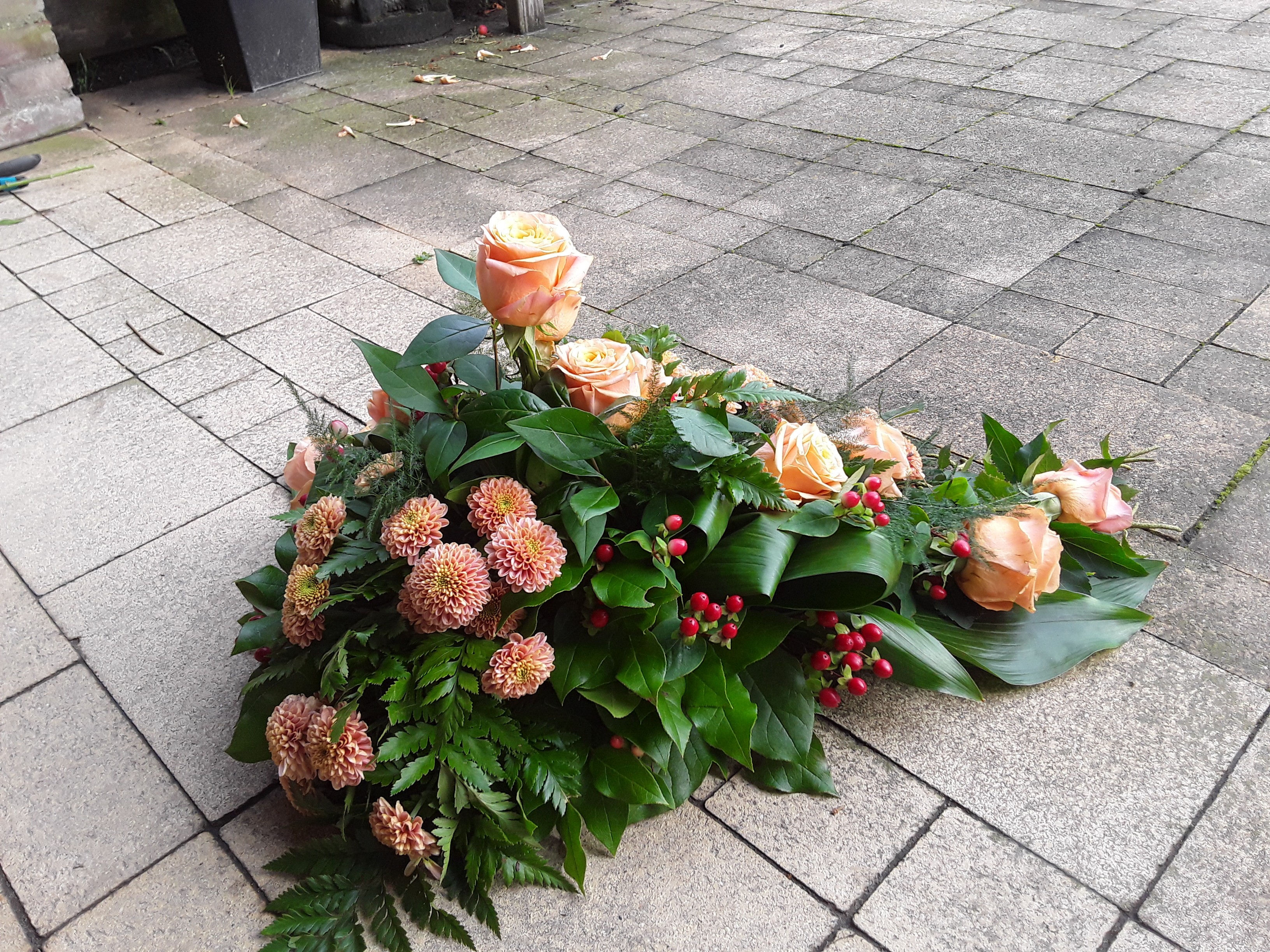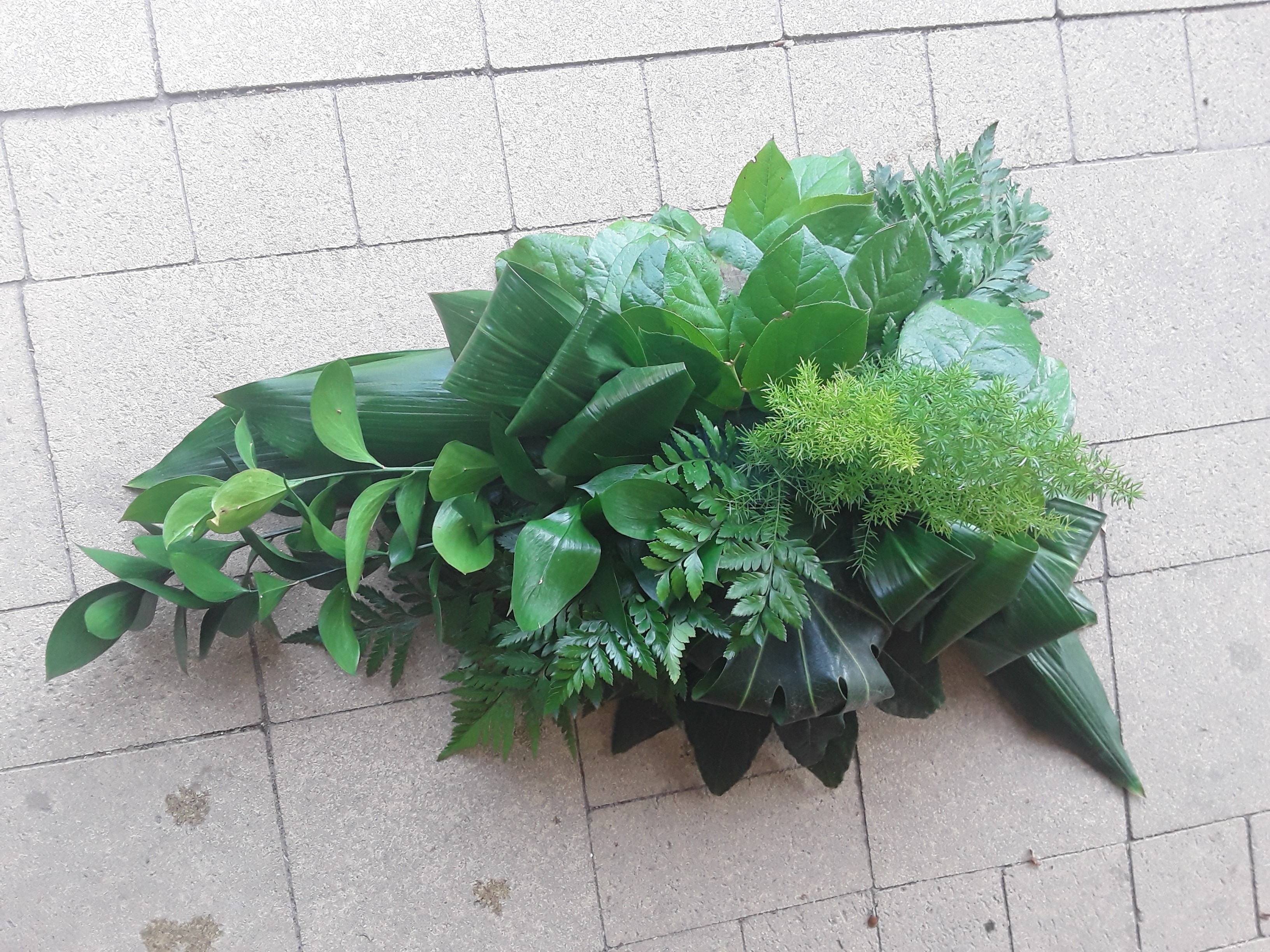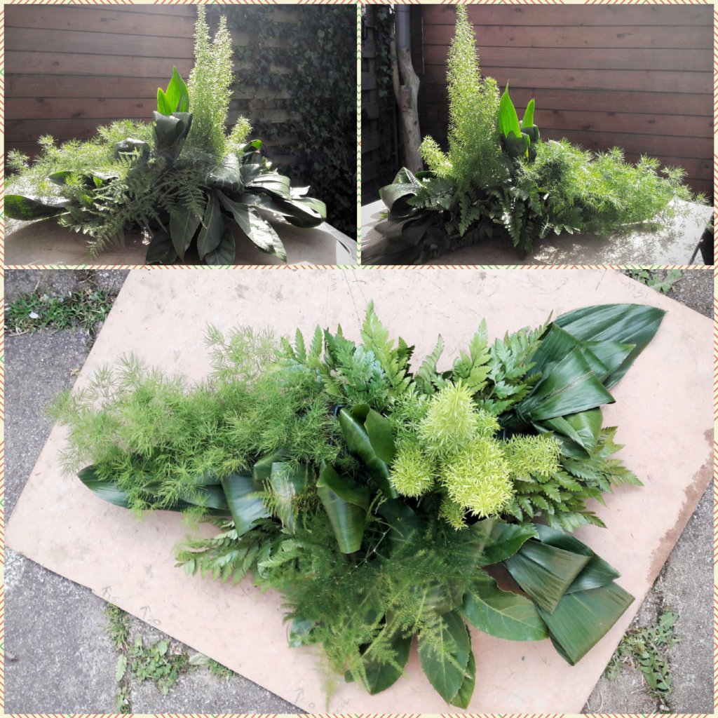 Hoi Nicolle, Hierbij het rouwarrangement, ik heb geen ruscus kunnen krijgen dus gemaakt met de materialen die ik voor handen had. Vond het wel leuk om te doen. Groetjes Jacqueline