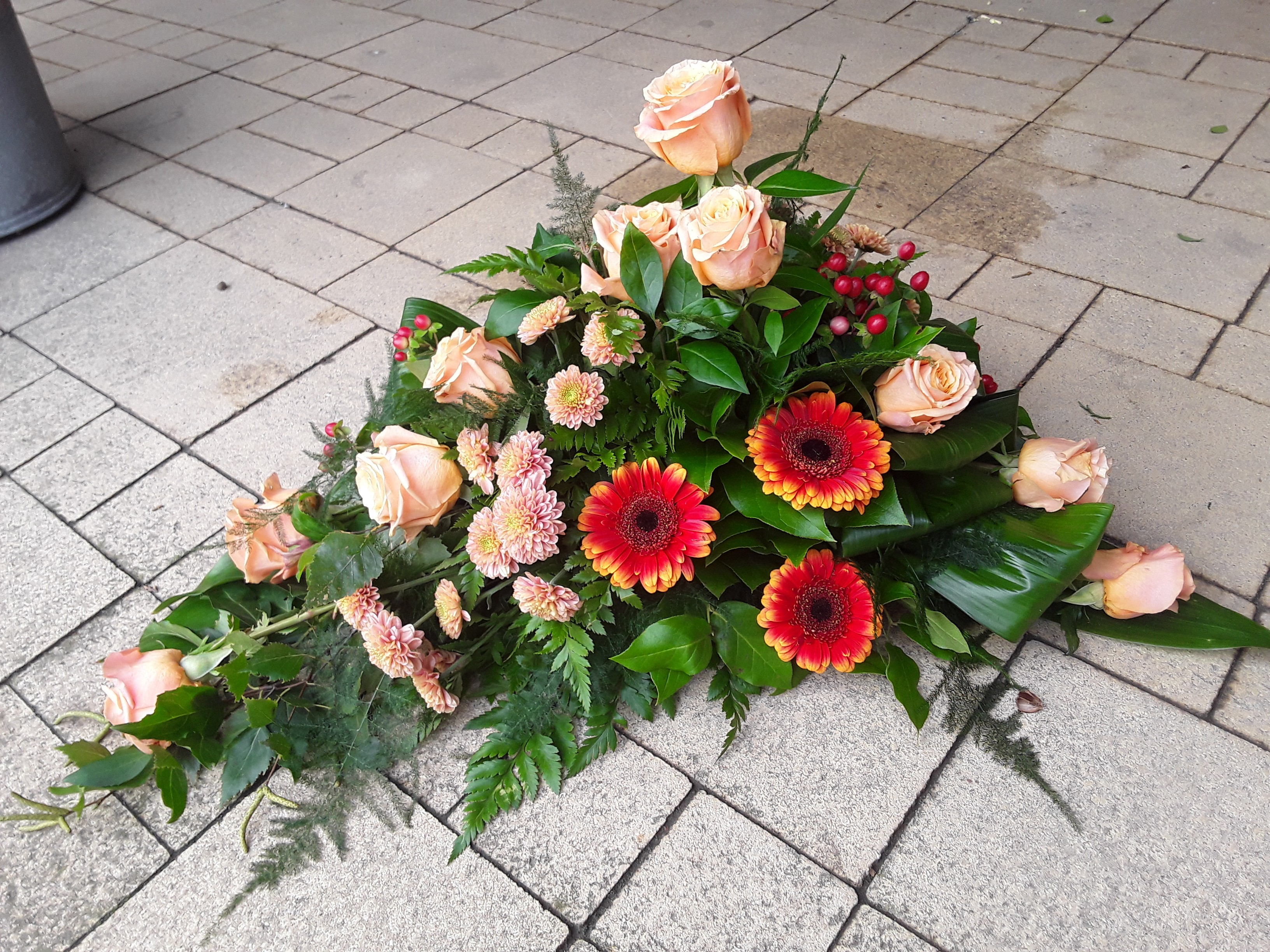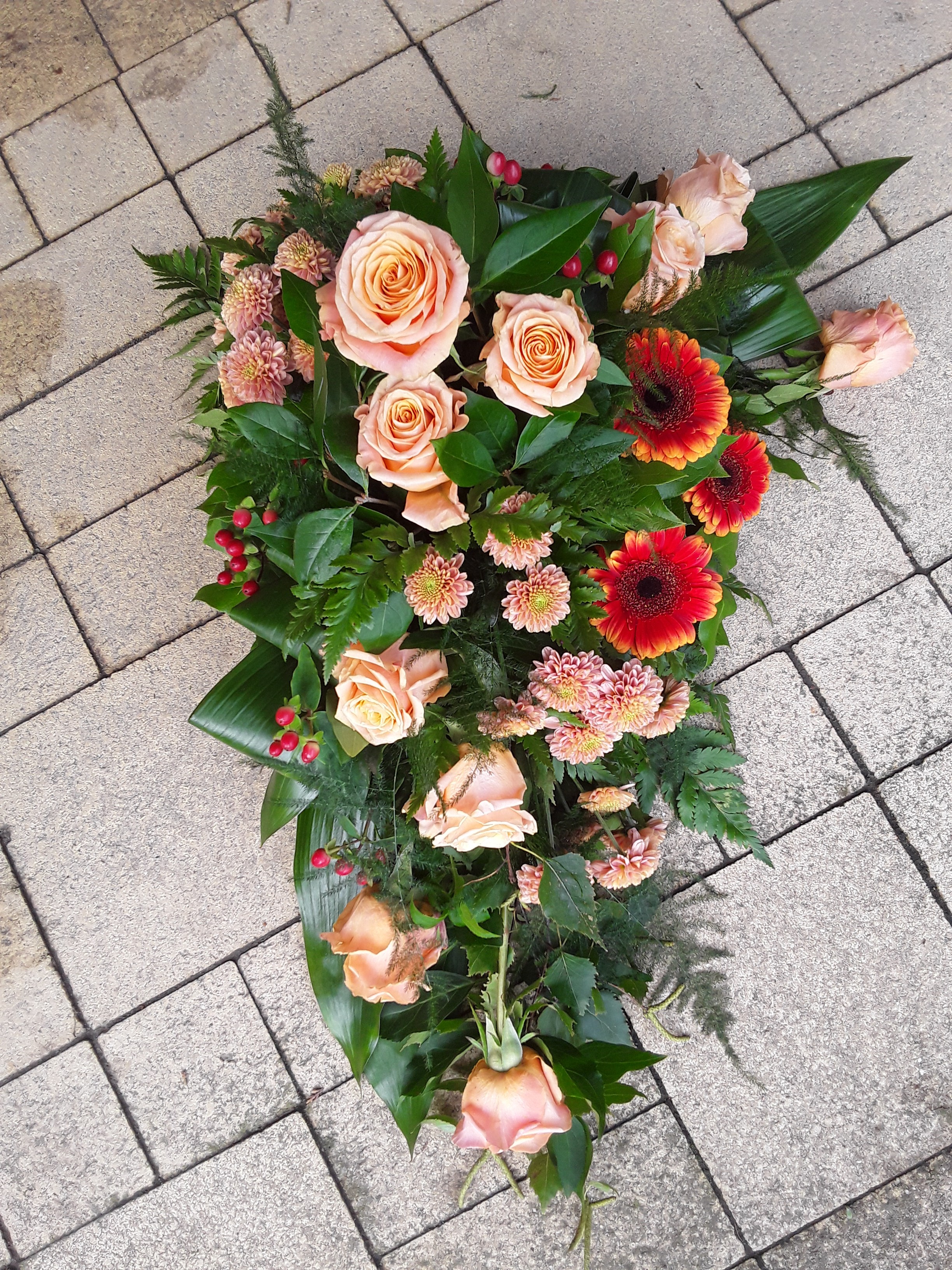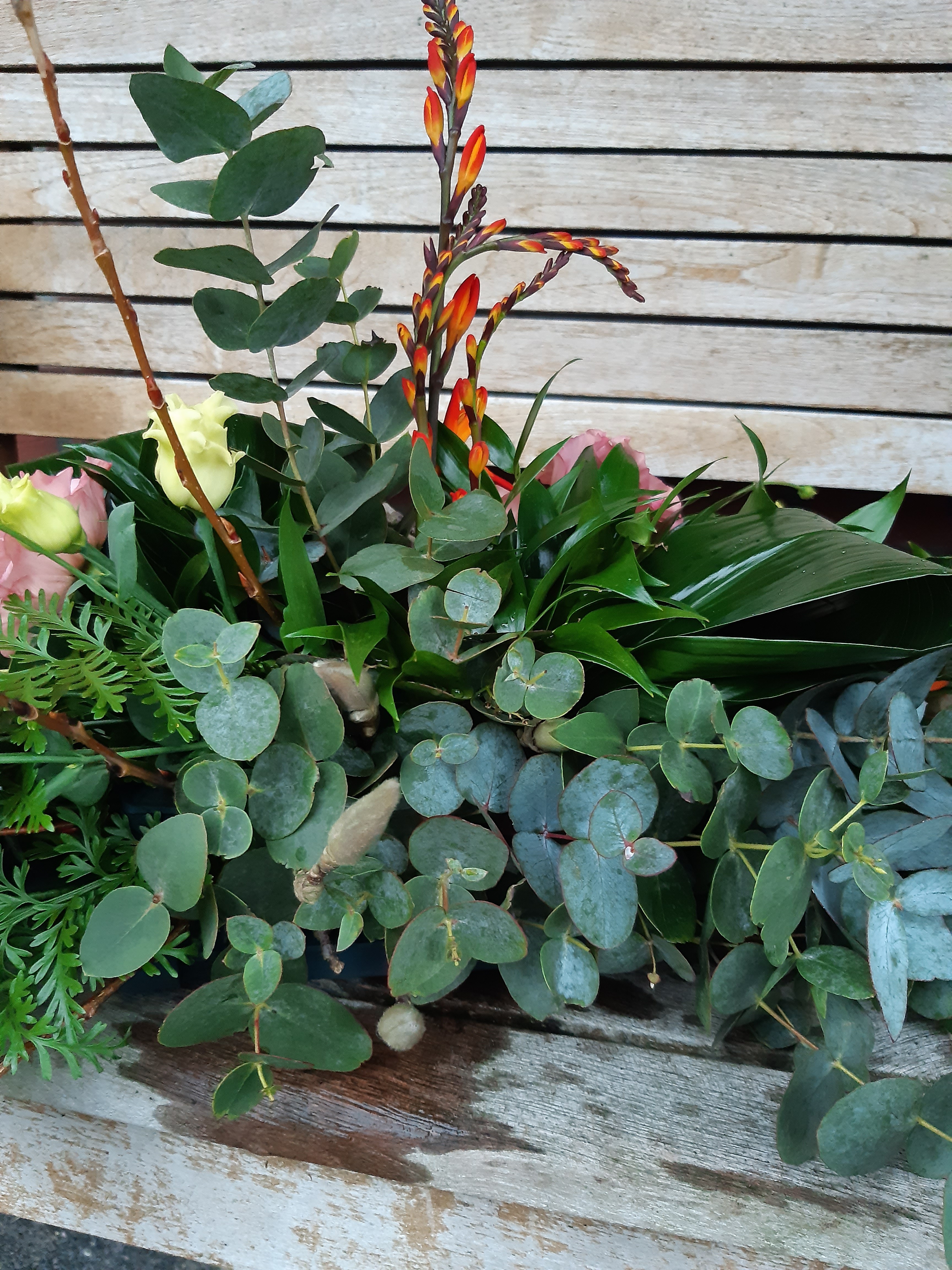 Hoi Nicolle, Hierbij het rouwarrangement, ik heb geen ruscus kunnen krijgen dus gemaakt met de materialen die ik voor handen had. Vond het wel leuk om te doen. Groetjes Jacqueline