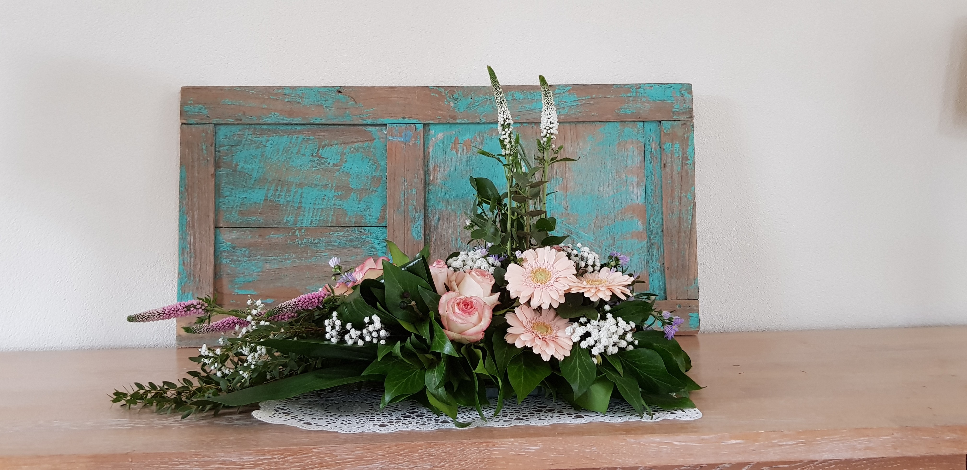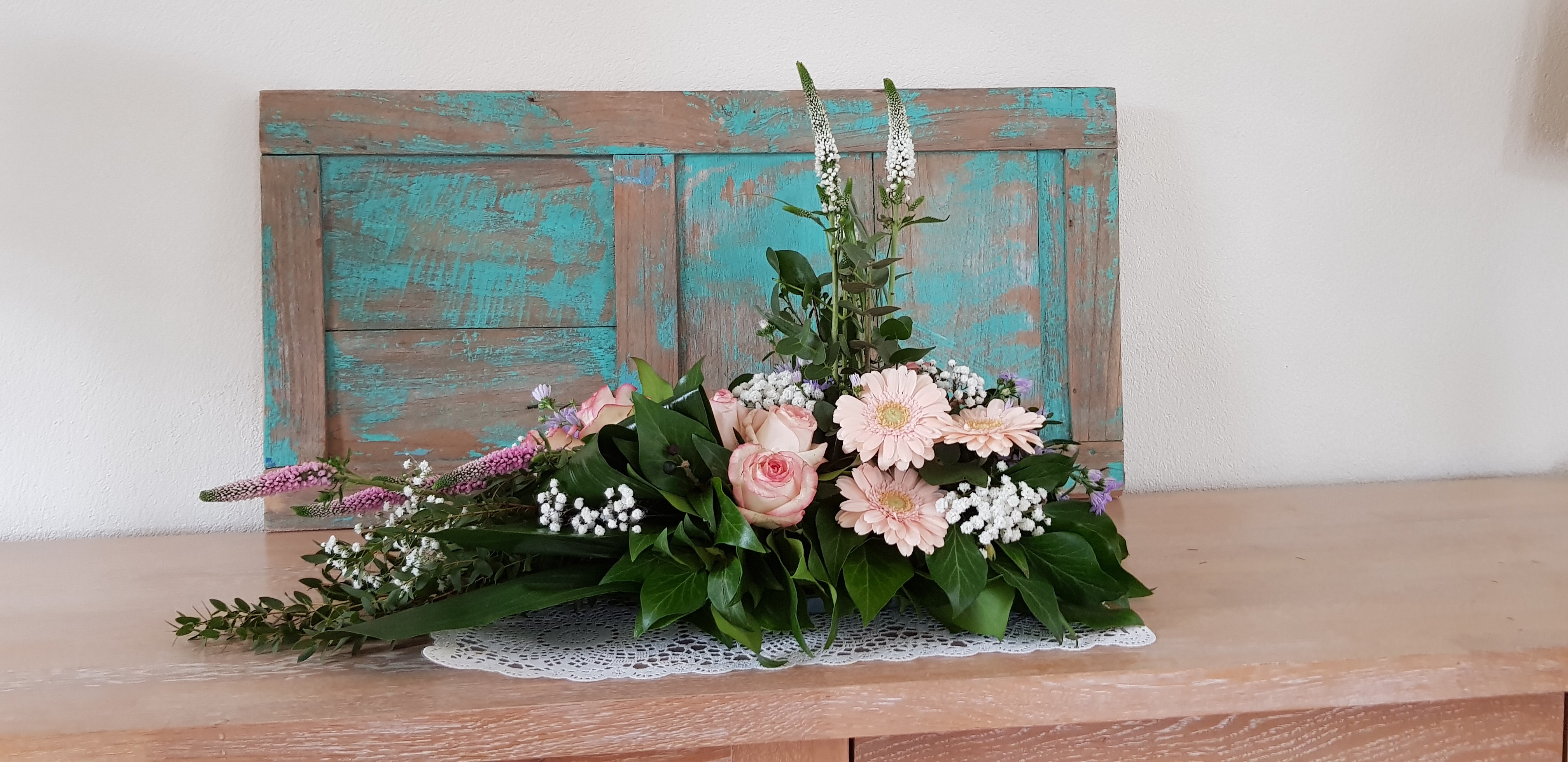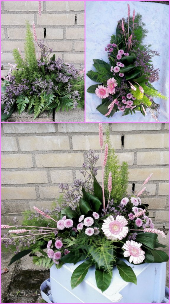 Hallo Nicolle, Hierbij een fotocollage van mijn Lineaire Rouwstuk op Oasis. Kleine foto linksboven: achterzijde arrangement. Rechter foto: van bovenaf. Gelukkig had ik nog roze geverfde korenaren thuis. Die in de hoogte gebruikt en om accenten aan te brengen naar de hoeken toe. Ik dacht met 4 Gerbera's genoeg op voorraad te hebben, want nog niet eerder een steel gebroken bij het buigen. Maar deze keer brak ik er zowaar twee. Door een draad door de steel te rijgen, de steel te tapen op de breuk en daarna nog een 0,7 draad erlangs te doen, kon ik vandaag in ieder geval verder. Deze Eerste Hulp Bij Bloemen hoort natuurlijk niet... Ik heb van de drie Fatsia's er een tussenuit gehaald. Hier was een derde roze Gerbera mooi geweest. En een vraag over de achterzijde: Hier alleen wat rustgevend Limonium geplaatst. Indien dit stuk midden op een tafel zou worden geplaatst, dan zouden er toch nog wat sprekende bloemen aan de achterzijde moeten komen, toch? Alvast bedankt voor je feedback op mijn stuk. Ik zag er erg tegenop, vooral omdat het zo lastig voor mij bleek om de benodigde materialen bij elkaar te krijgen. PS de zachtgele violieren maar in mijn schuur gelaten... Grtjs Vlijtig liesje