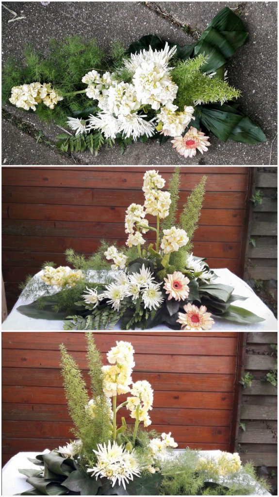 Hoi Nicolle Hier mijn Liniair Rouw arrangement Ik zeg zelf vind het aardig gelukt. Heb wel iets andere bloemen gebruikt. En had ook niet het blad aan de zijkant, daar heb ik hele grote bladeren voor gebruikt en omgevouwen. Maar ik vind zelf dat het aardig gelukt is. Ben benieuwd naar jou reactie. Gr Silvia