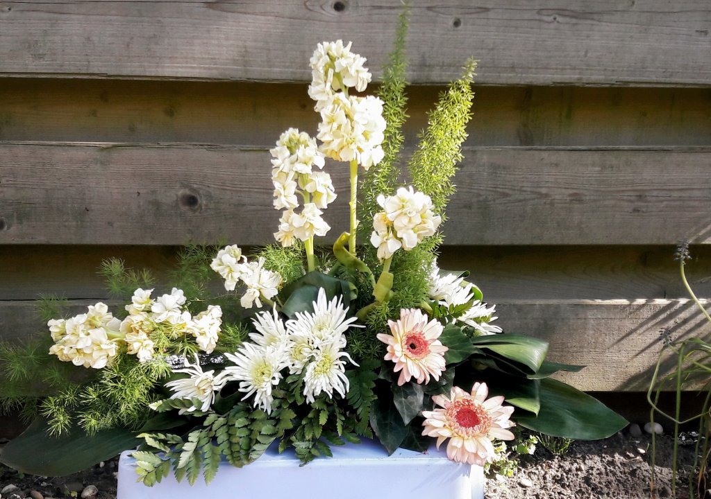 Heel fijn dat je het leuk vond om het lineaire rouwarrangement te maken. Het is de lastigste van de Vakopleiding. Ik zie dat je verhoudingen en de holle lijn goed zijn gegaan. Je hebt er ook mooie materialen ervoor gekozen. Volgende keer kan je alleen er nog beter op letten dat je bloemen op de ondergrond rusten. Nu kan je op de foto goed zien dat je bloemen zweven en niet aan zouden sluiten op de kist. Je groen doet dat wel, maar je bloemen nog niet. Je onderste Gerbera mag dan ook echt op de tafel liggen. Ik zou ook niet je Gypsophila overal tussen gebruiken. Daardoor wordt hij meer gemengd en haal je de aandacht van je lijnen weg. Ik hoop dat je iets aan mijn tips hebt. Probeer het zeker nog een keer. Het is zeker niet makkelijk, maar ik weet zeker dat het je volgende keer nog beter lukt.