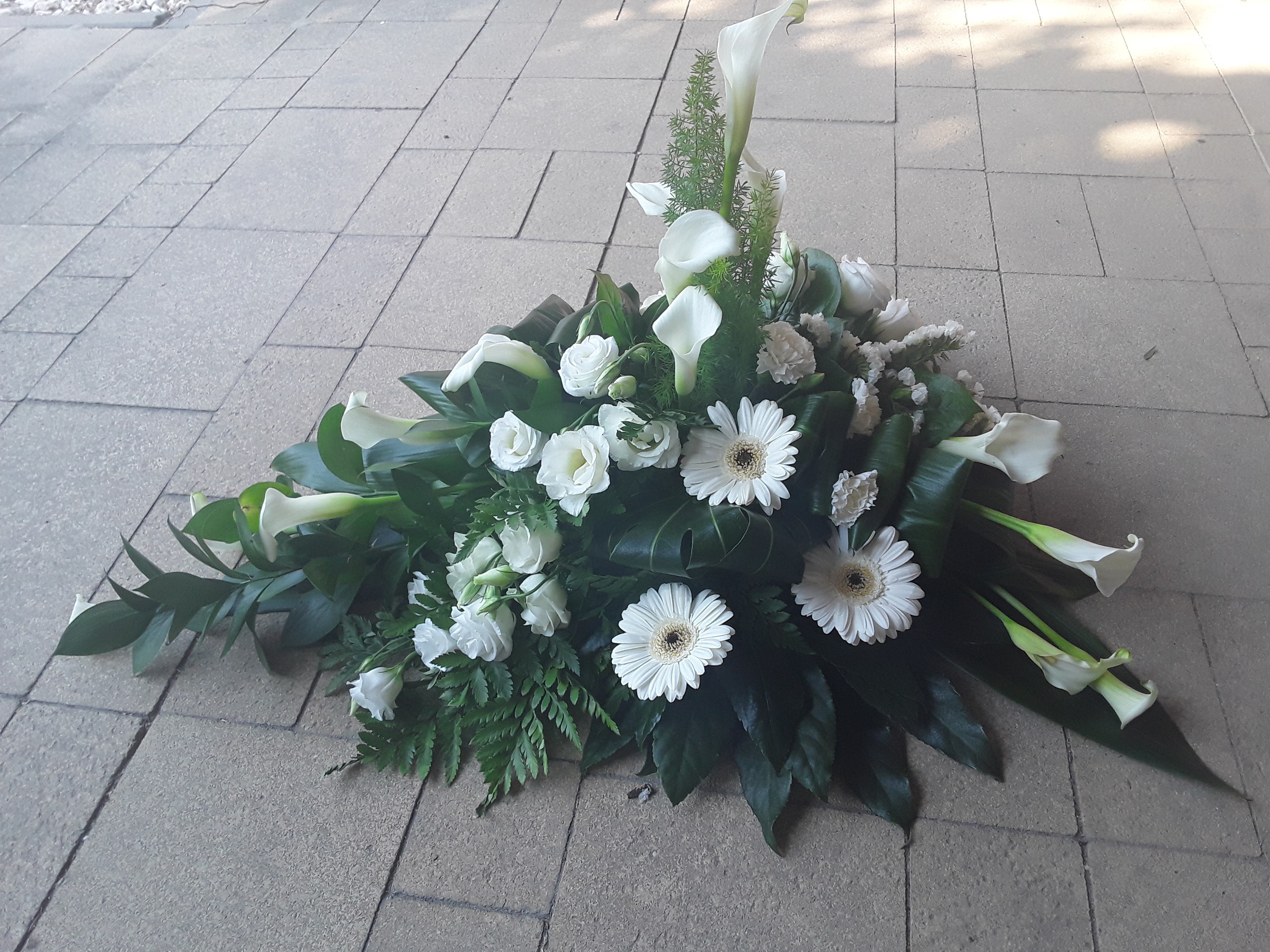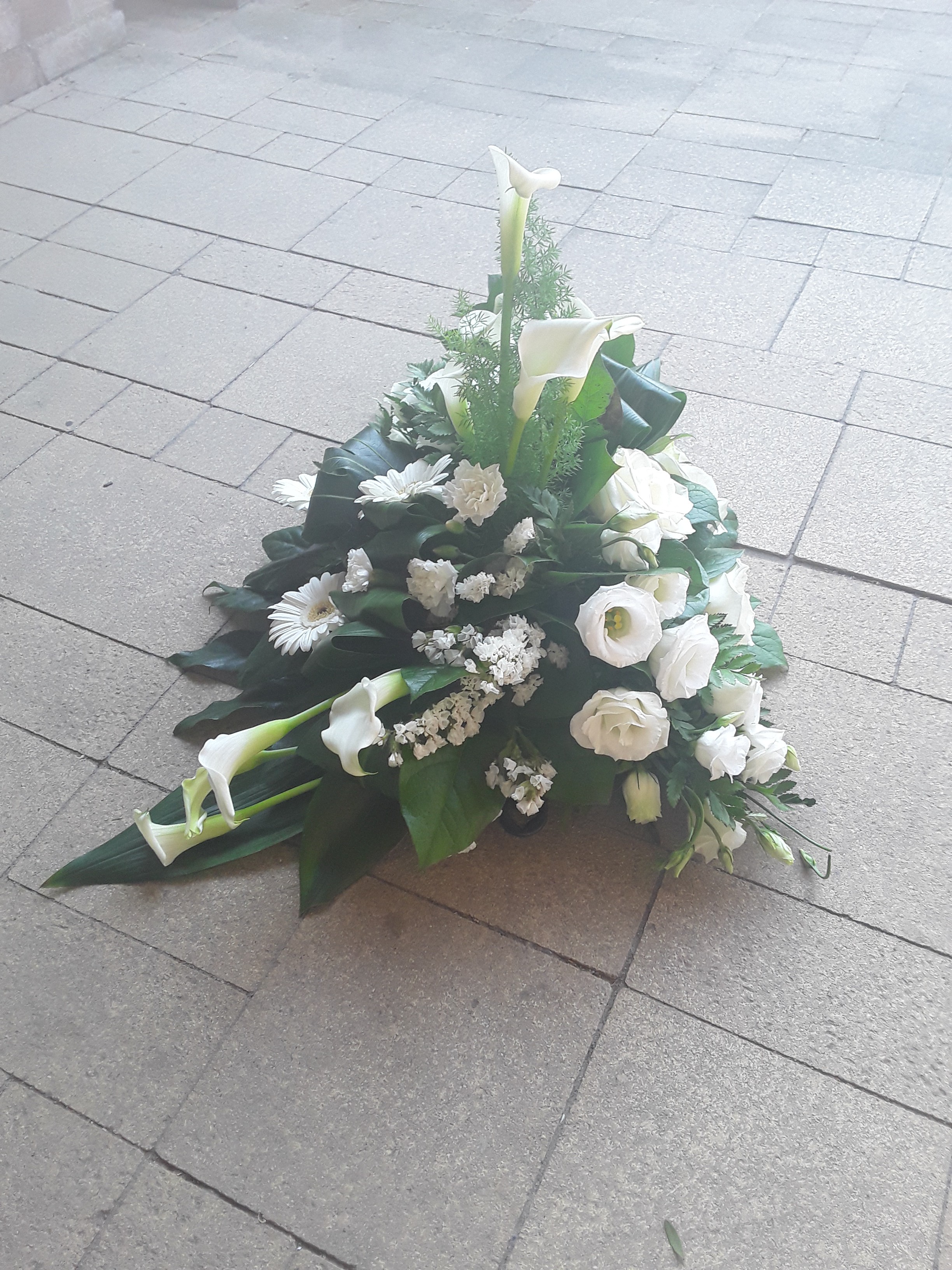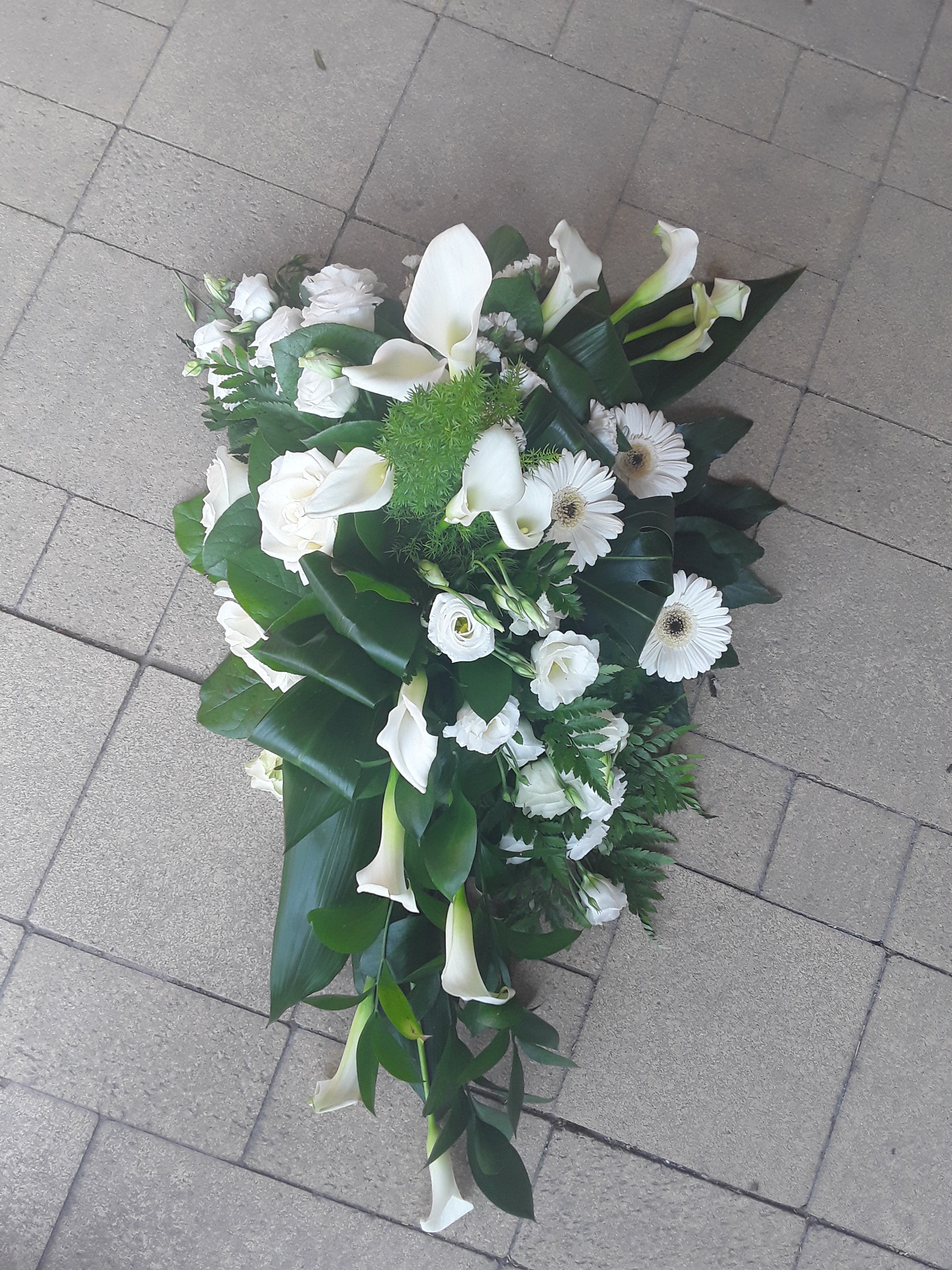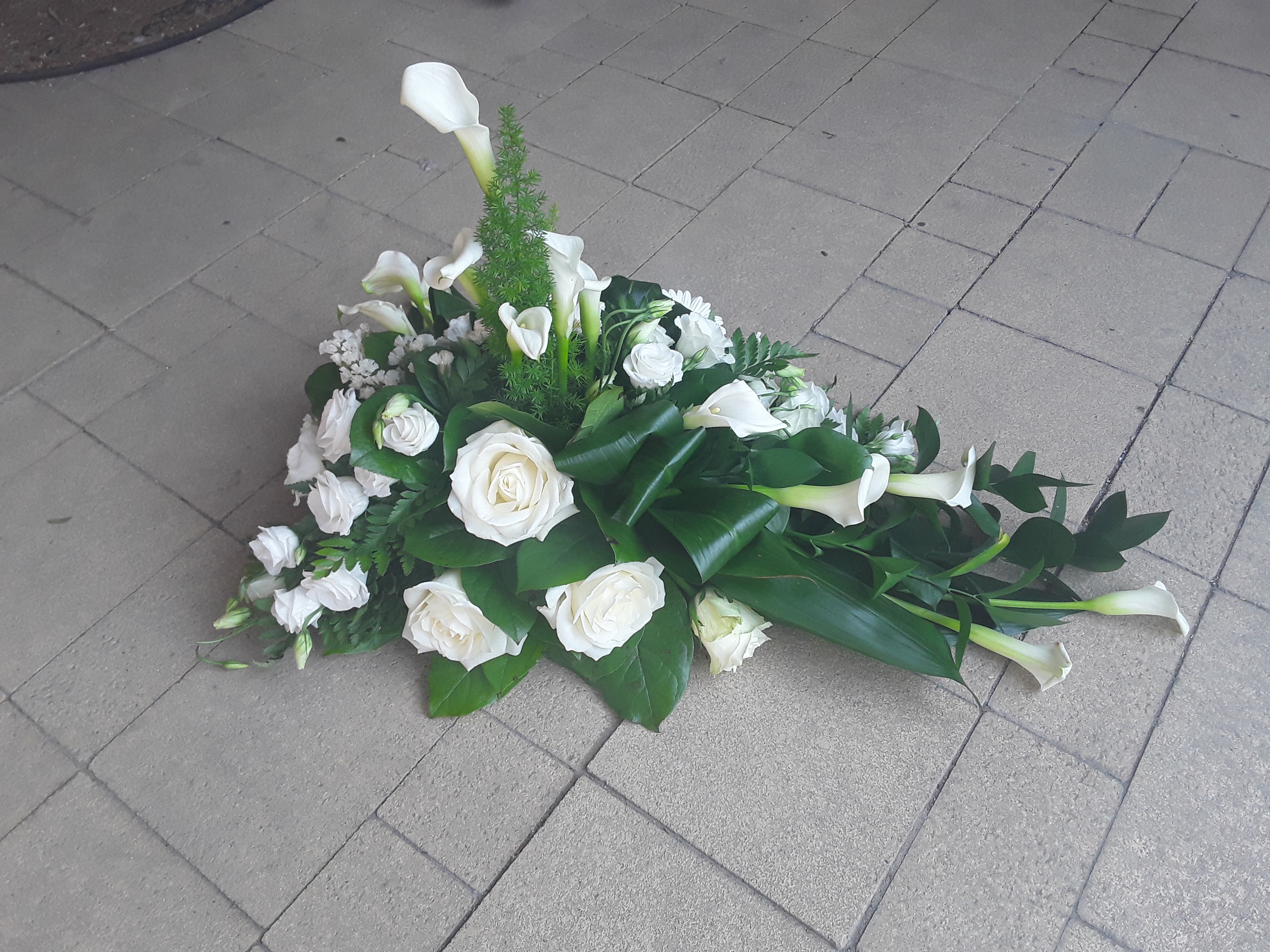 Een lineair rouwstuk gemaakt, ik vond het leuk om te doen Ik had nog wel wat meer callas erin willen steken, mijn rozen waren door de warmte al helemaal open gekomen, daarom wat minder rozen er in gestoken, het middenpunt vond ik lastig steken met de callas Benieuwd naar je mening hierover