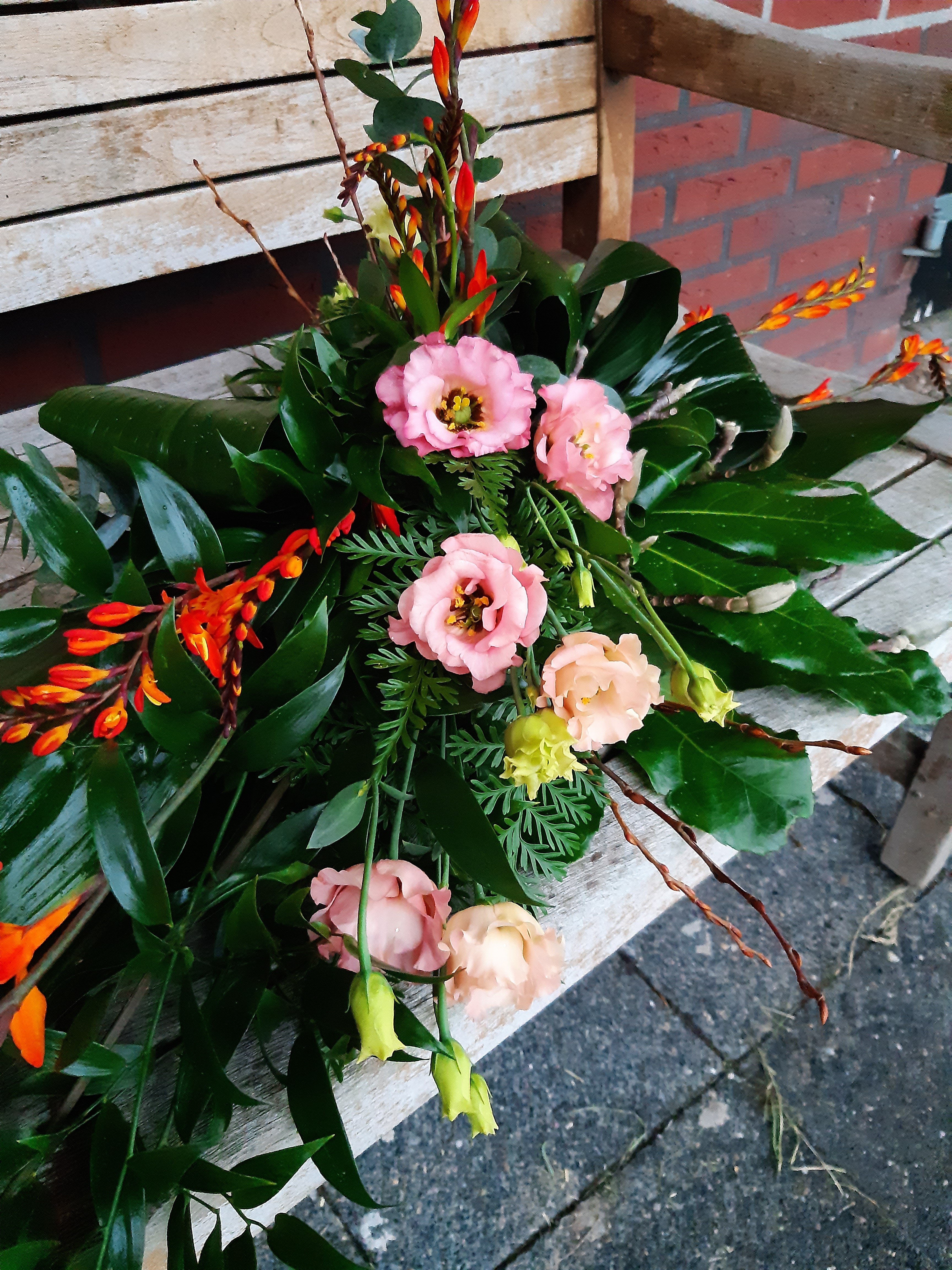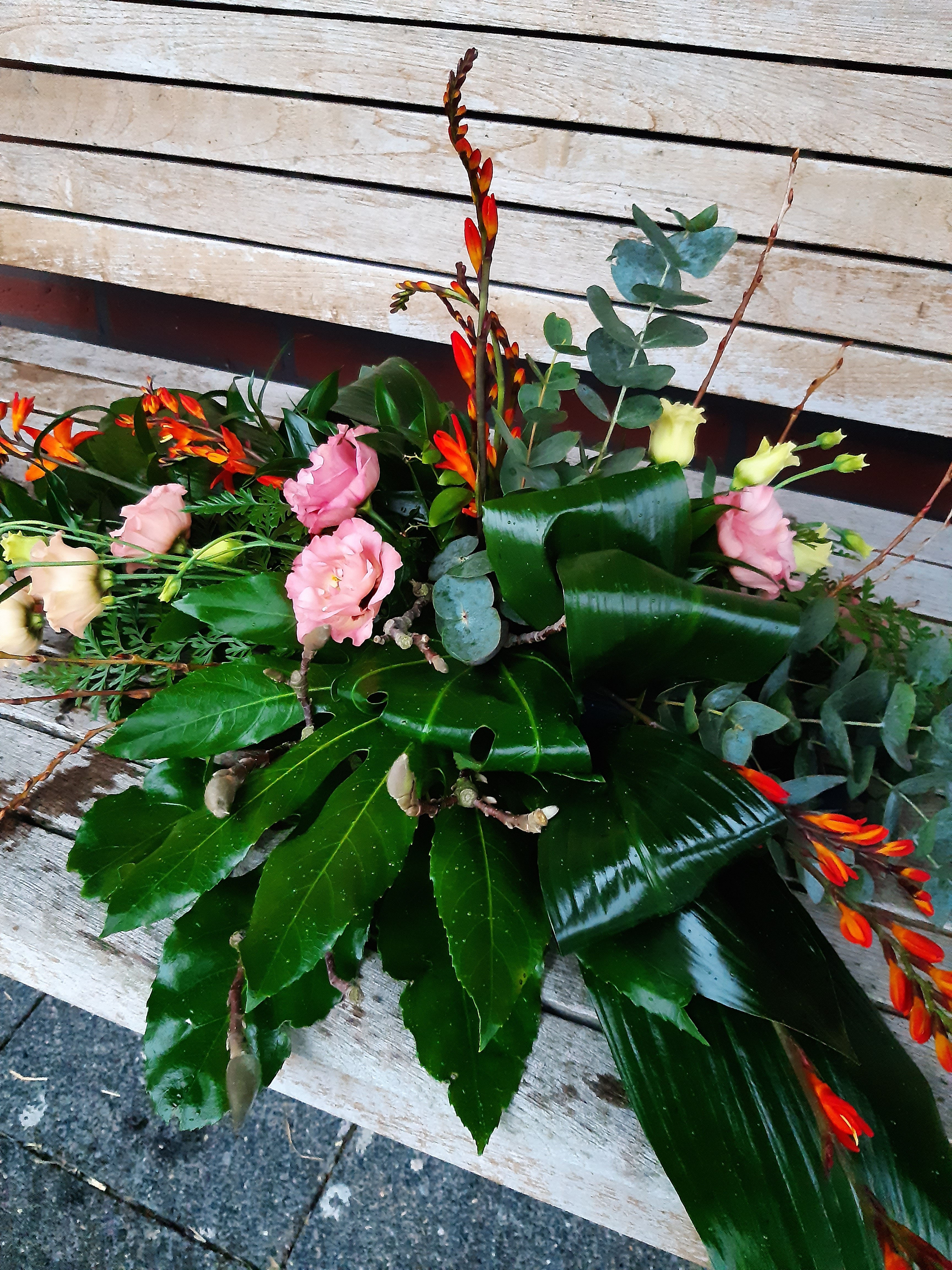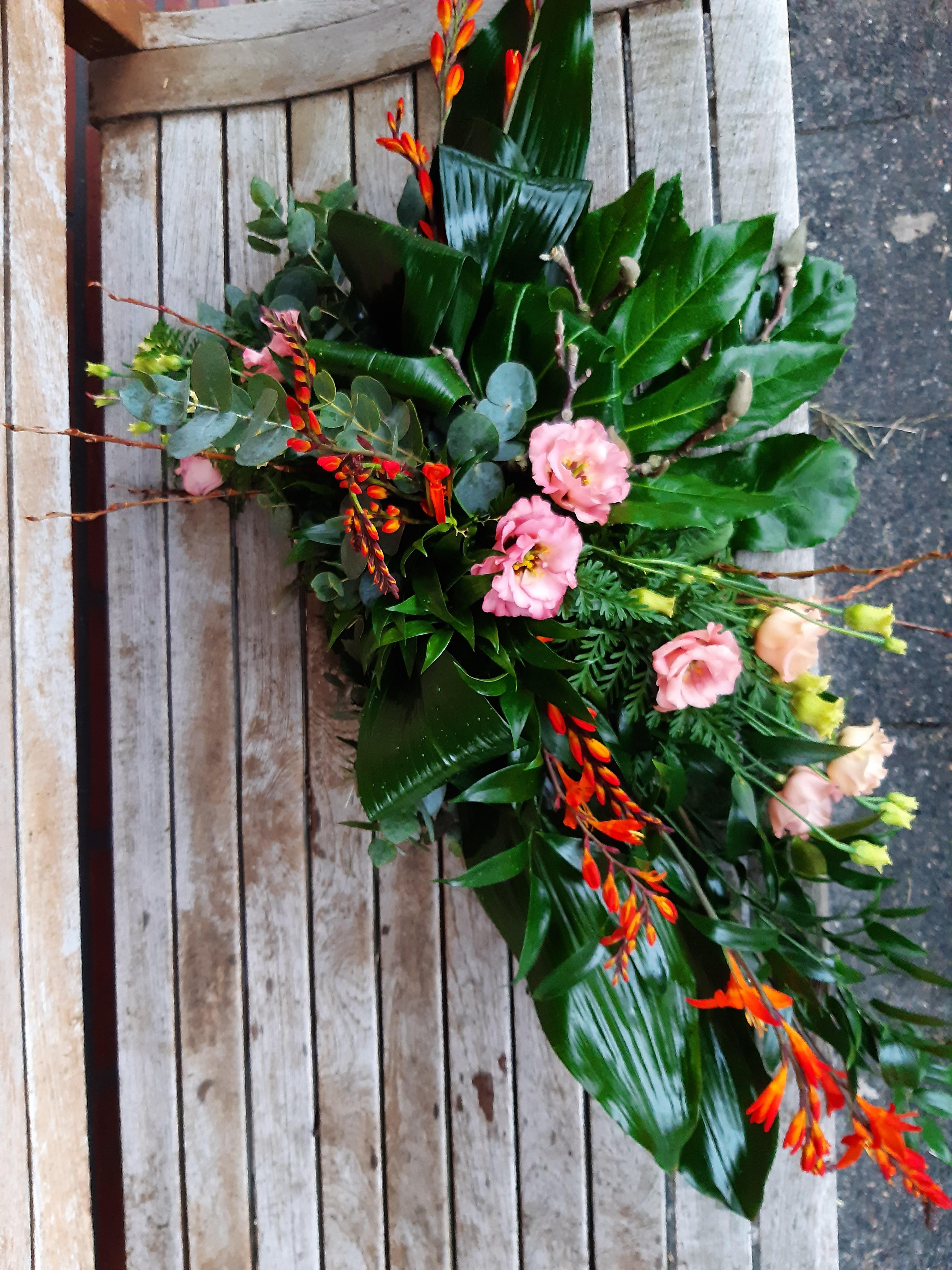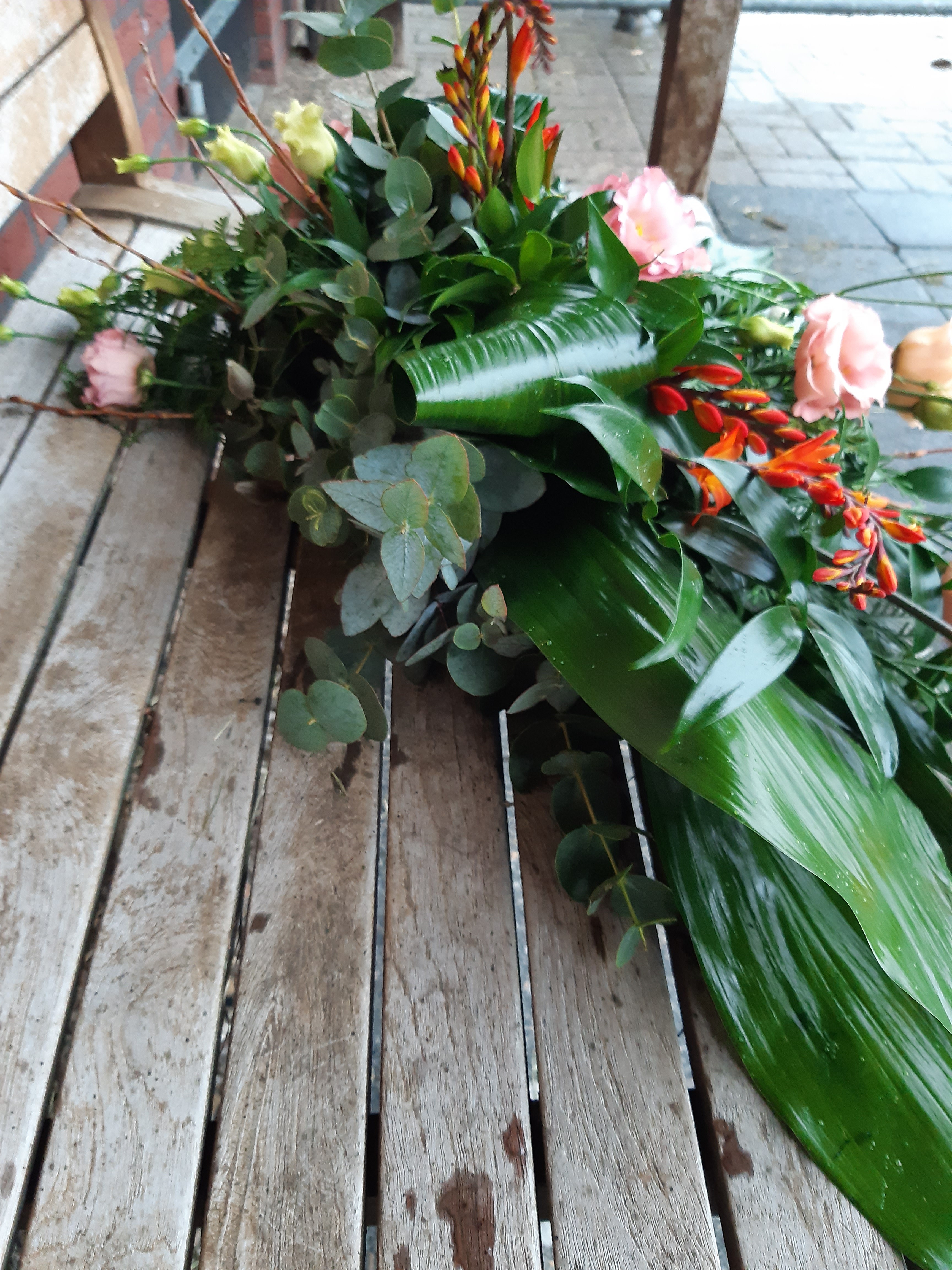 Een lineair rouwstuk gemaakt, ik vond het leuk om te doen Ik had nog wel wat meer callas erin willen steken, mijn rozen waren door de warmte al helemaal open gekomen, daarom wat minder rozen er in gestoken, het middenpunt vond ik lastig steken met de callas Benieuwd naar je mening hierover