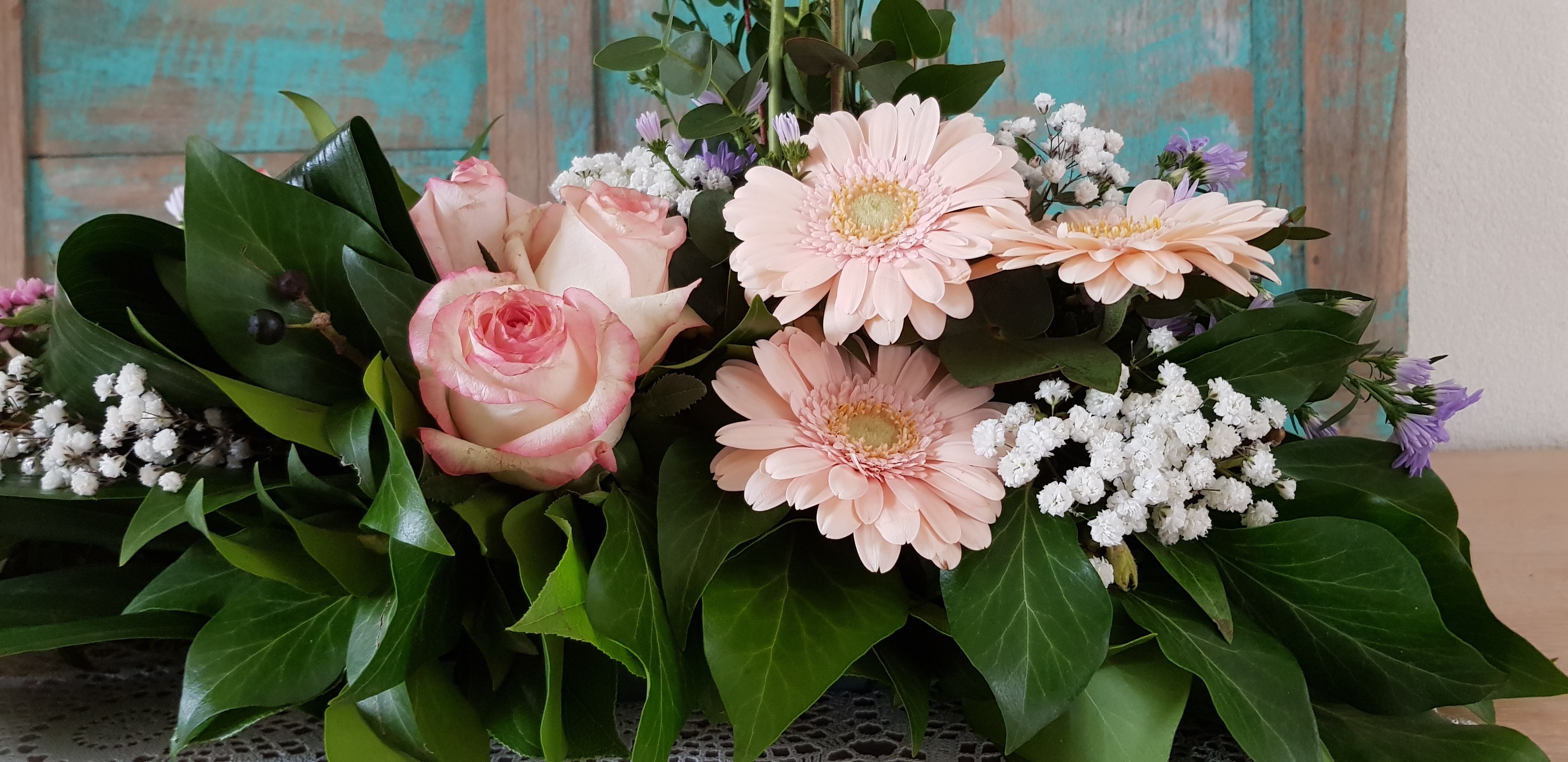 Voor Anthuriums is het buiten nu te koud, maar Rozen en Gerbera's kunnen 5 graden prima aan. Bij de kweker staan de rozen vaak zelfs nog kouder in de koelcel. Je zou ook de hartbloemen kunnen vervangen door Dennenappels of Elfenbankjes. Heel natuurlijk en blijft goed.