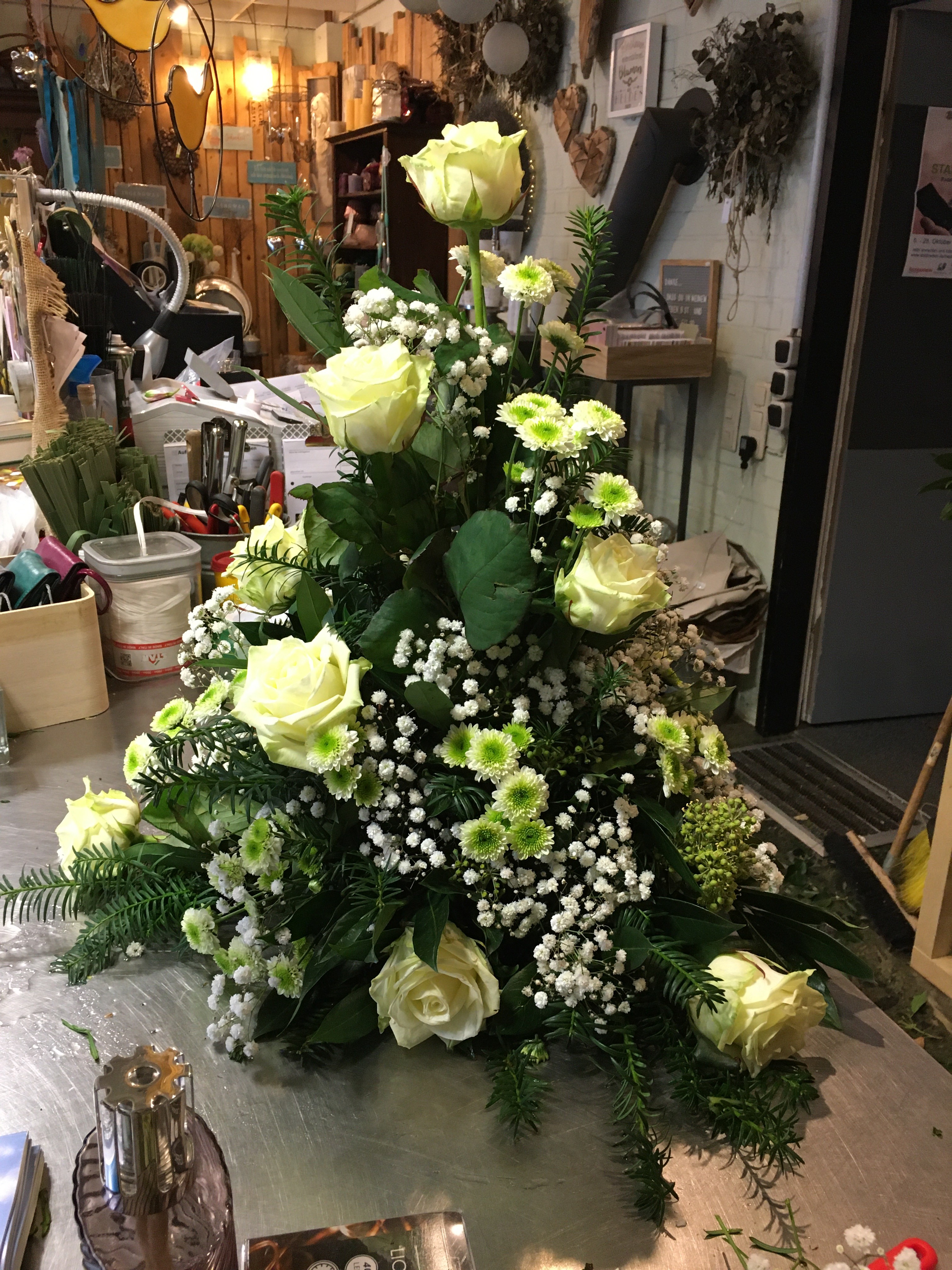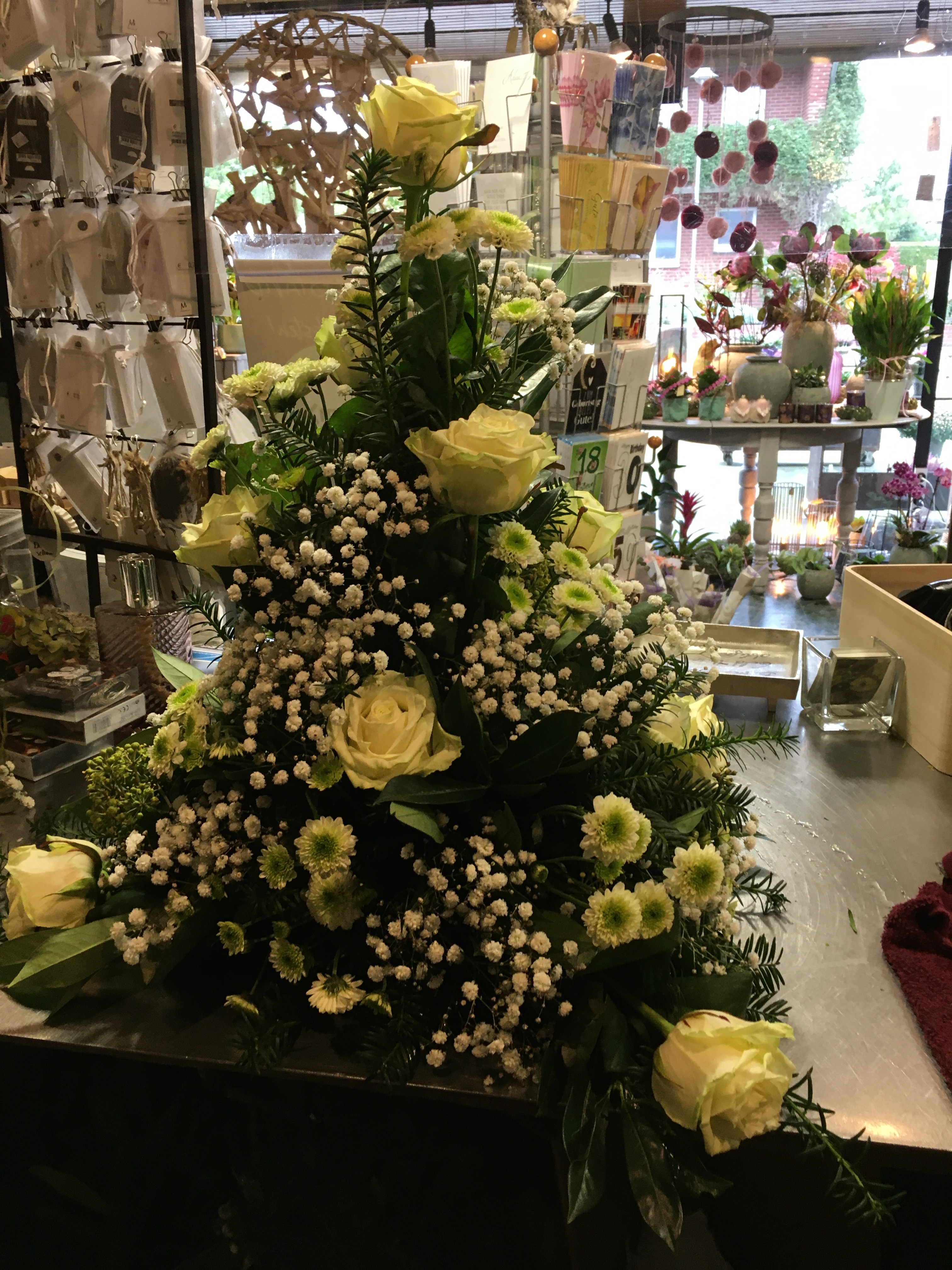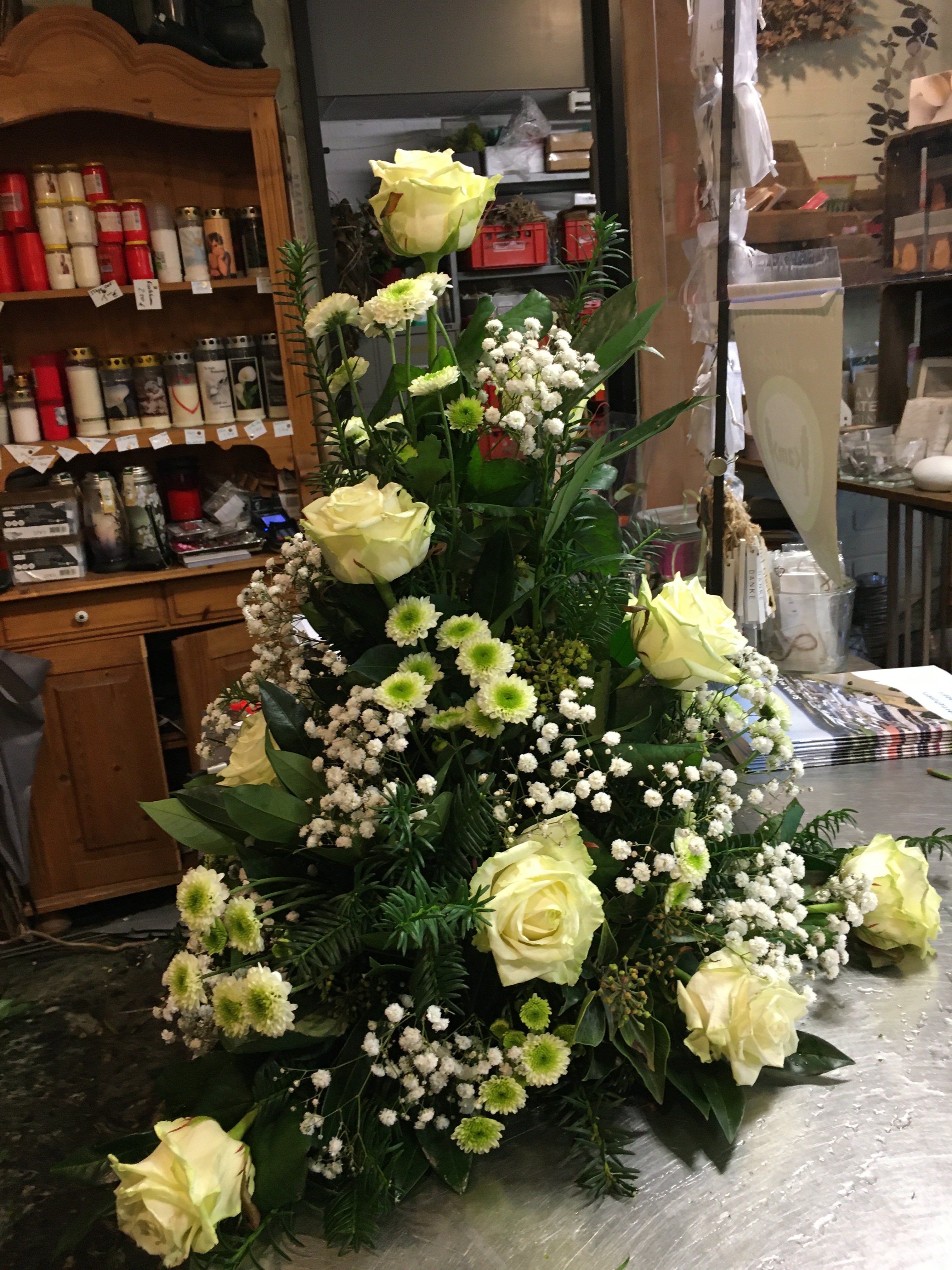 Dit rouwarrangement heb ik voor een bloemenwinkel gemaakt in opdracht van een klant. Gelukkig hebben collega's me een beetje geholpen. Als de basisvorm goed gemaakt is, is het toevoegen van het bloemmateriaal vrij makkelijk. De Basis is wel een uitdaging. Om dit goed te kunnen, moet ik denk ik nog een paar keer oefenen