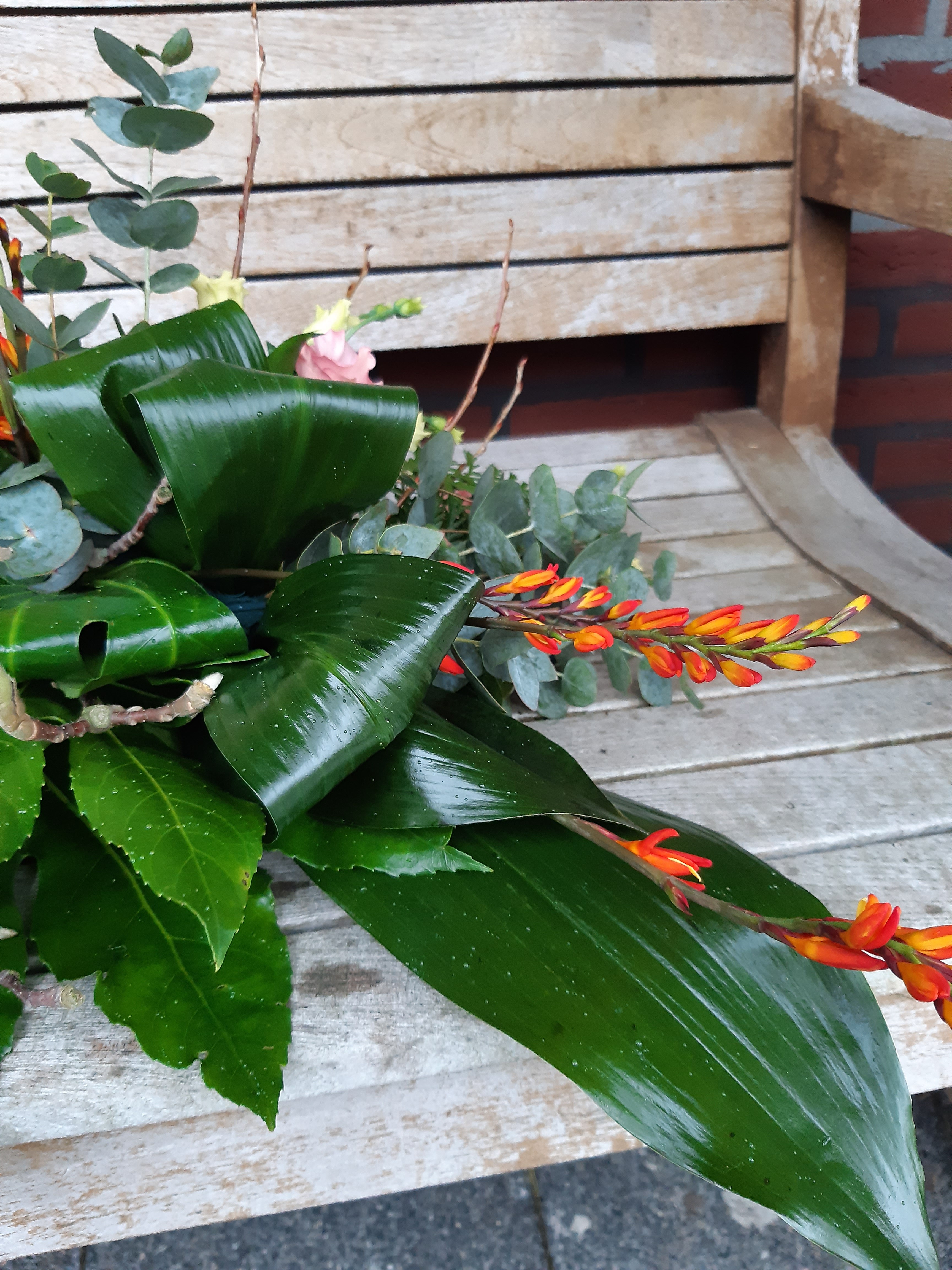 Hoi Nicolle Deze keer het liniear rouwarrangement gemaakt . Ik heb i.p.v Gerbera of Anthurium bloemen in het hart Magnoliatakjes gebruikt en deze ook aan de andere kant terug laten komen. Hier voor gekozen omdat het buiten slecht weer is en Gerbera of Anthurium zijn dan zo weg . Verder i.p.v Appelblad ,Eucalyptus blaadjes gebruikt . Het ligt mij erg goed om rouwarrangementen te maken misschien dat ik hier in de toekomst verder mee ga . Heb nog wel een vraagje ,mag je ook tussen de Eucalyptus bijv bloemetjes of takjes steken wat ook al in het stuk is verwerkt bijv zijtakjes van Montebretia of kleine wilgetakjes . Of moet het iets zijn wat nog niet gebruikt is ? Nicolle hoor graag wat je er van vindt . Groetjes Marjanne