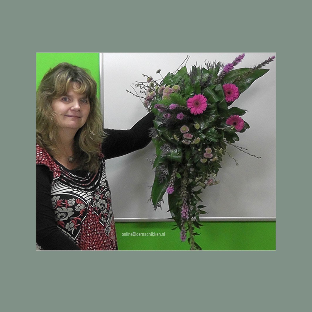 Dank je wel voor je foto's. Je arrangement is zo goed te zien. Je vorm en verdeling is keurig. Hij past alleen niet zo erg onder deze lesfilm van het lineaire Rouwarrangement. Tijdens onze vakopleiding maken wij deze stijl ook alleen als rouwboeket. Ik heb er wel een lesfilm van gemaakt les IB-035 misschien wil die ook eens bekijken en steek je er weer iets van op.