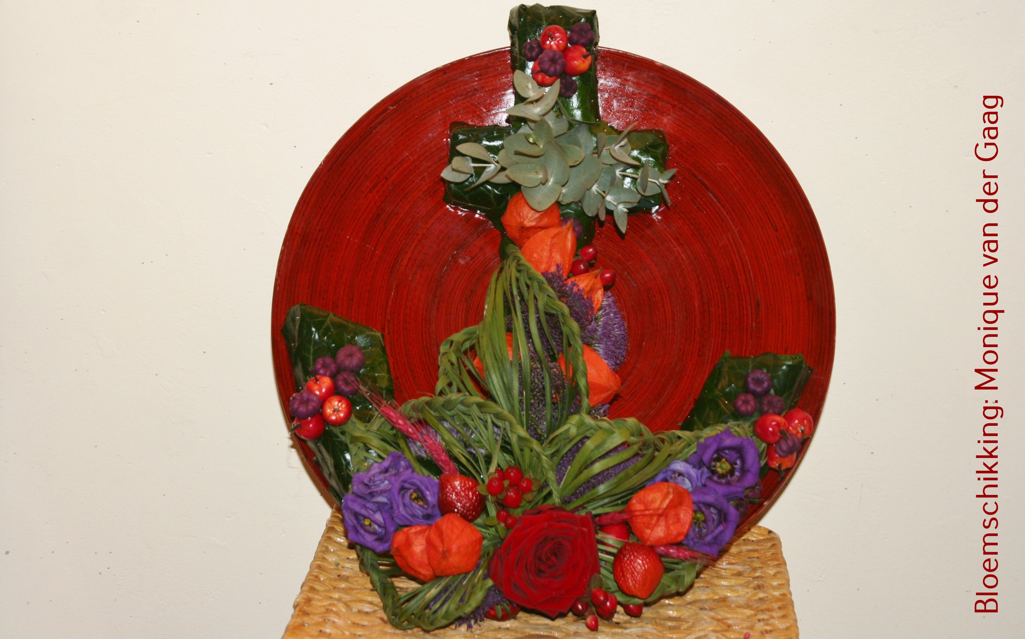 Dit was een heel inspirerende les, zoals gewoonlijk! Als liturgische schikking heb ik voor mijn kerk een variatie gemaakt op het rouwkruis, namelijk een anker uit steekschuim gevormd. Paars was de kleur in de Advent, vandaar dat ik daarvoor koos. Kun je me tips geven hoe ik het bovenste gedeelte van het anker (waar het het meest op een kruis lijkt) mooi(er) had kunnen decoreren? Ik heb er nu maar wat eucaluptus (ook vanwege de mooie symboliek: namelijk 'bescherming' ingestoken) maar het oogt wat rommelig, vind ik. Alvast dank en vriendelijke groet, Vlijtig liesje