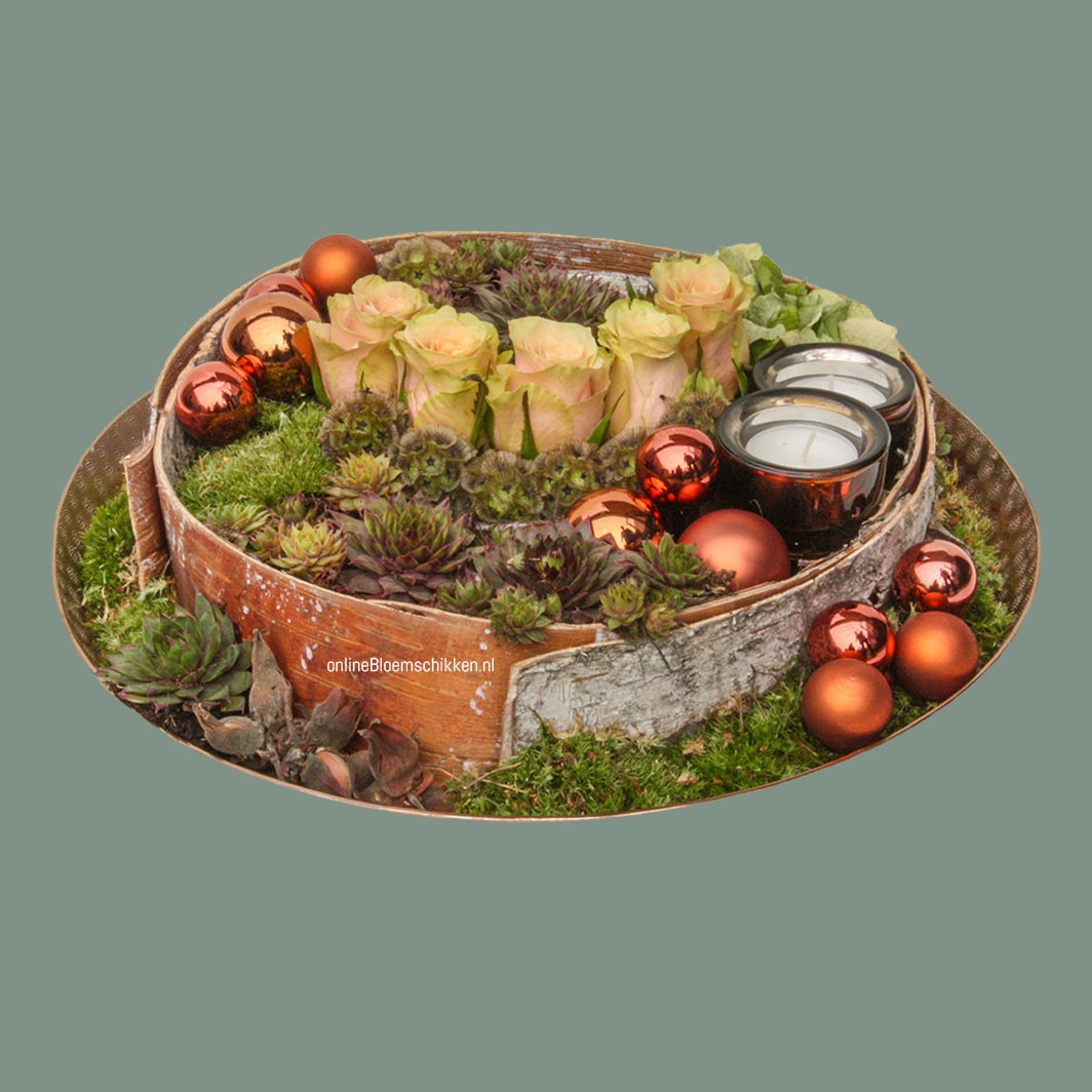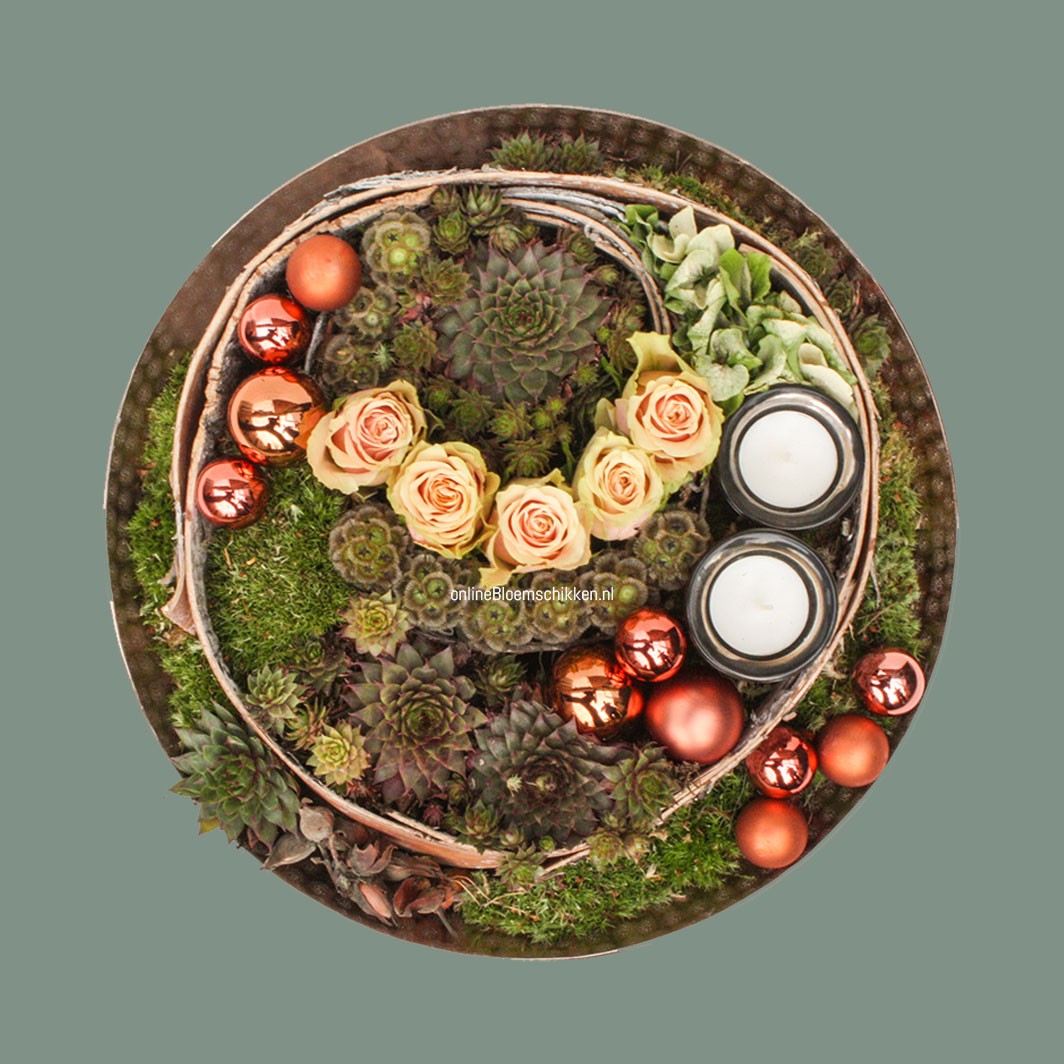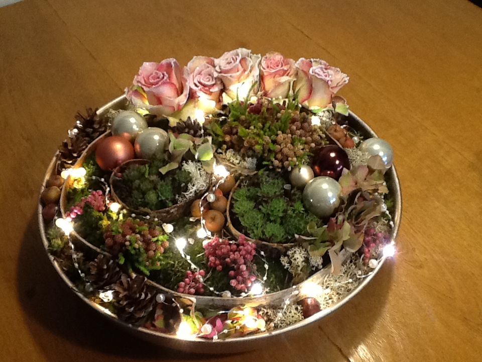 Een arrangement 'vrije stijl', dat wel erg leuk is om te maken, maar niet heel erg moeilijk. Door de verschillende structuren is het zeker ook een mooi stuk om van bovenaf te zien. Niet alleen leuk om te maken met Kerst, maar ook leuk voor de Pasen.
