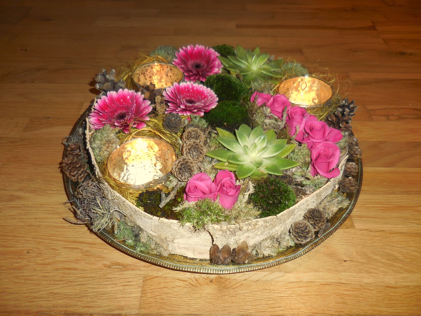 Hallo Nicolle, Geïnspireerd op het voorbeeld wilde ik ook zo,n schaal maken, maar kon geen ronde berkenschors vinden en ik had zelf maar een klein stukje. Ik heb wel ander schors gekocht, maar daar kon ik geen ronde vormen mee maken. Ik heb toen de plantjes in mos gewikkeld en zo op een schaal gezet. Ik ben benieuwd wat je er van vindt